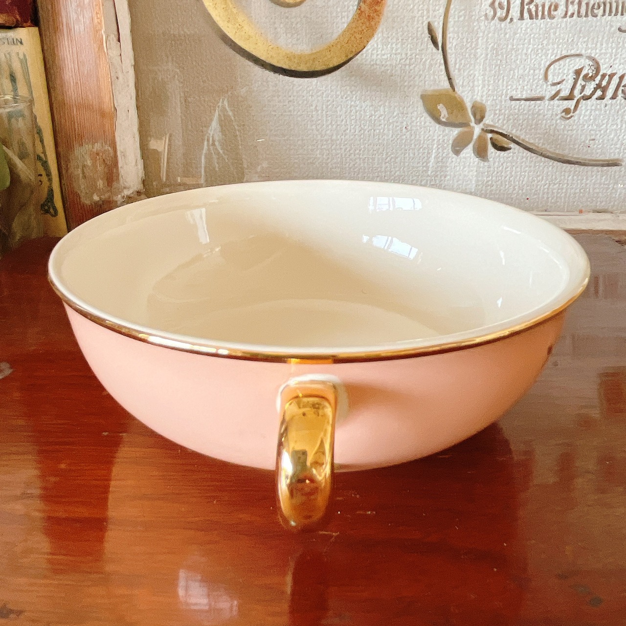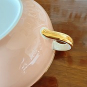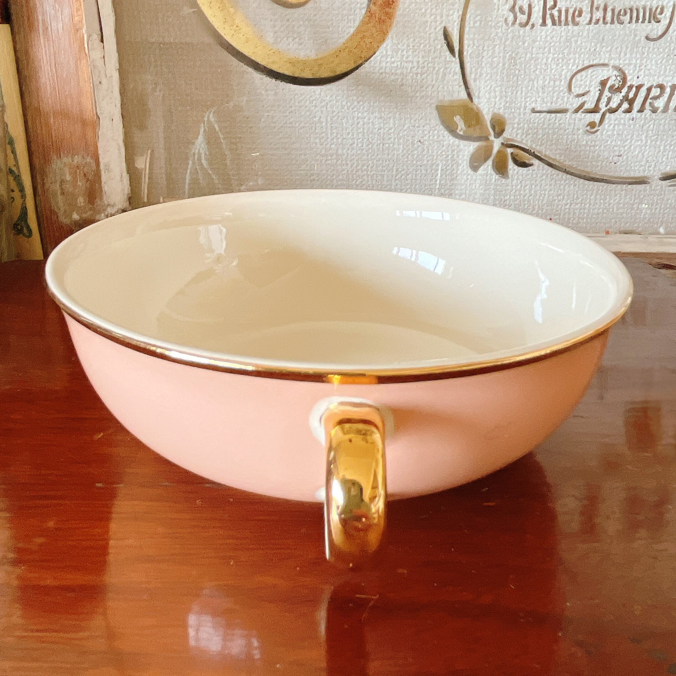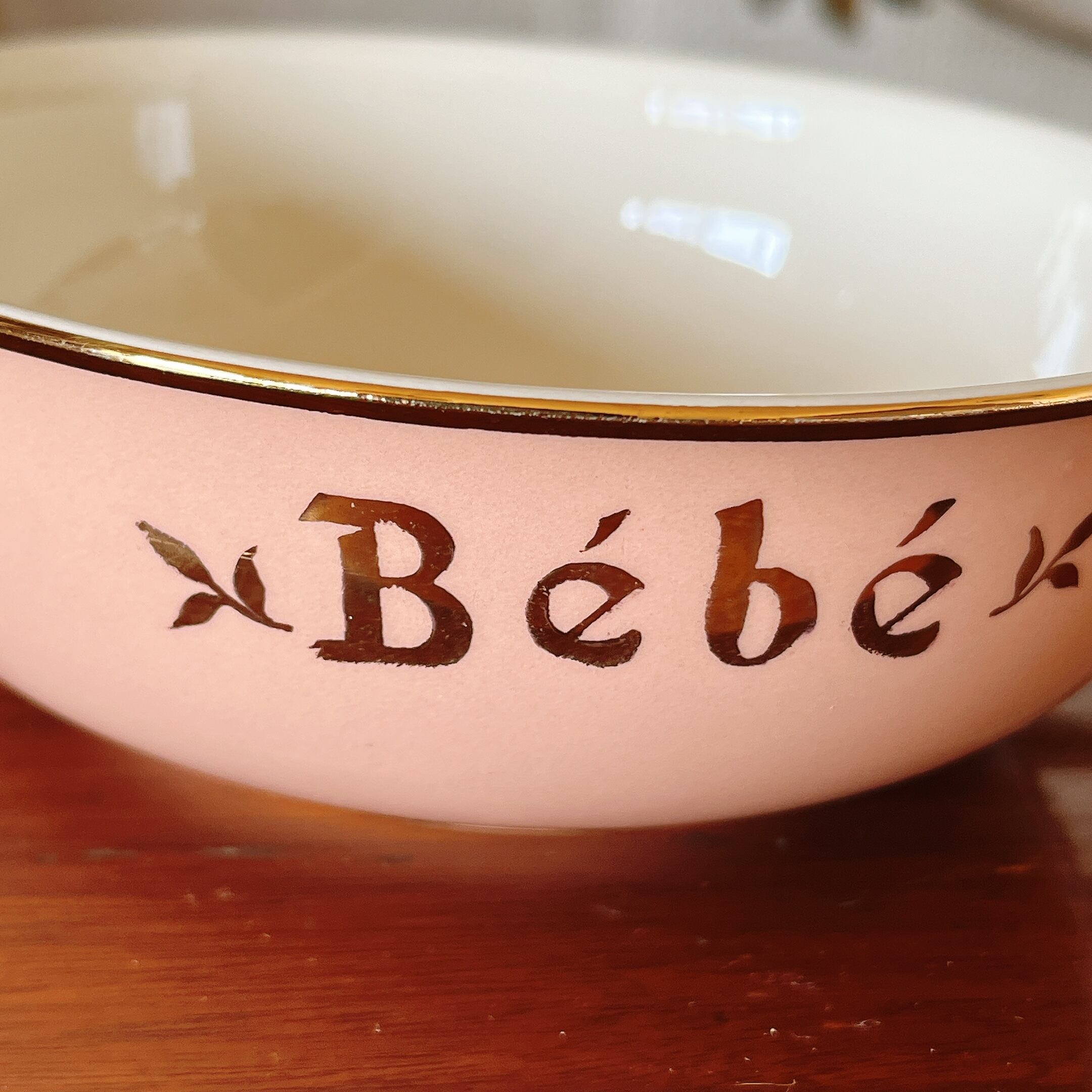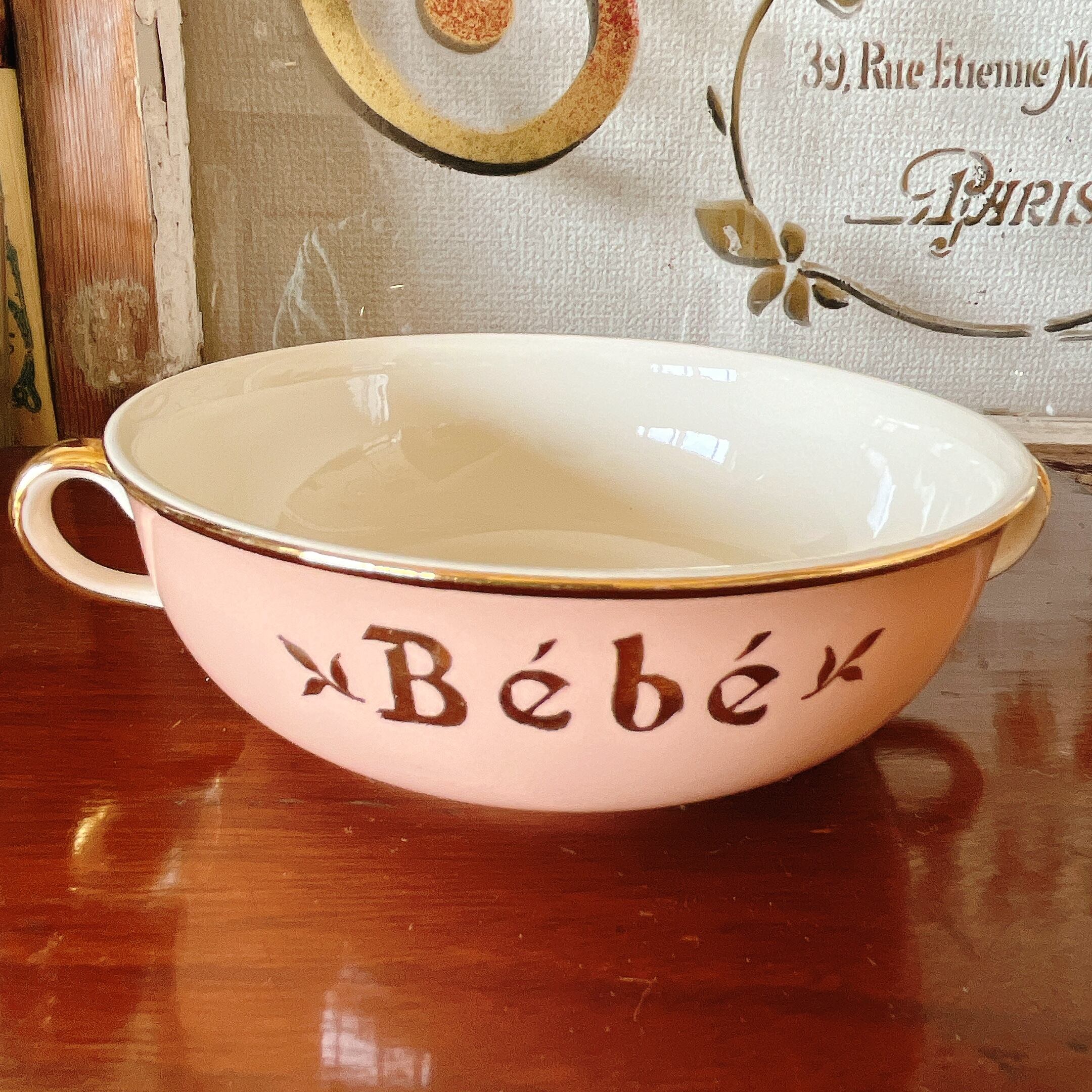 優しいピンクと金彩が可愛い赤ちゃん用の手付きボウル。
