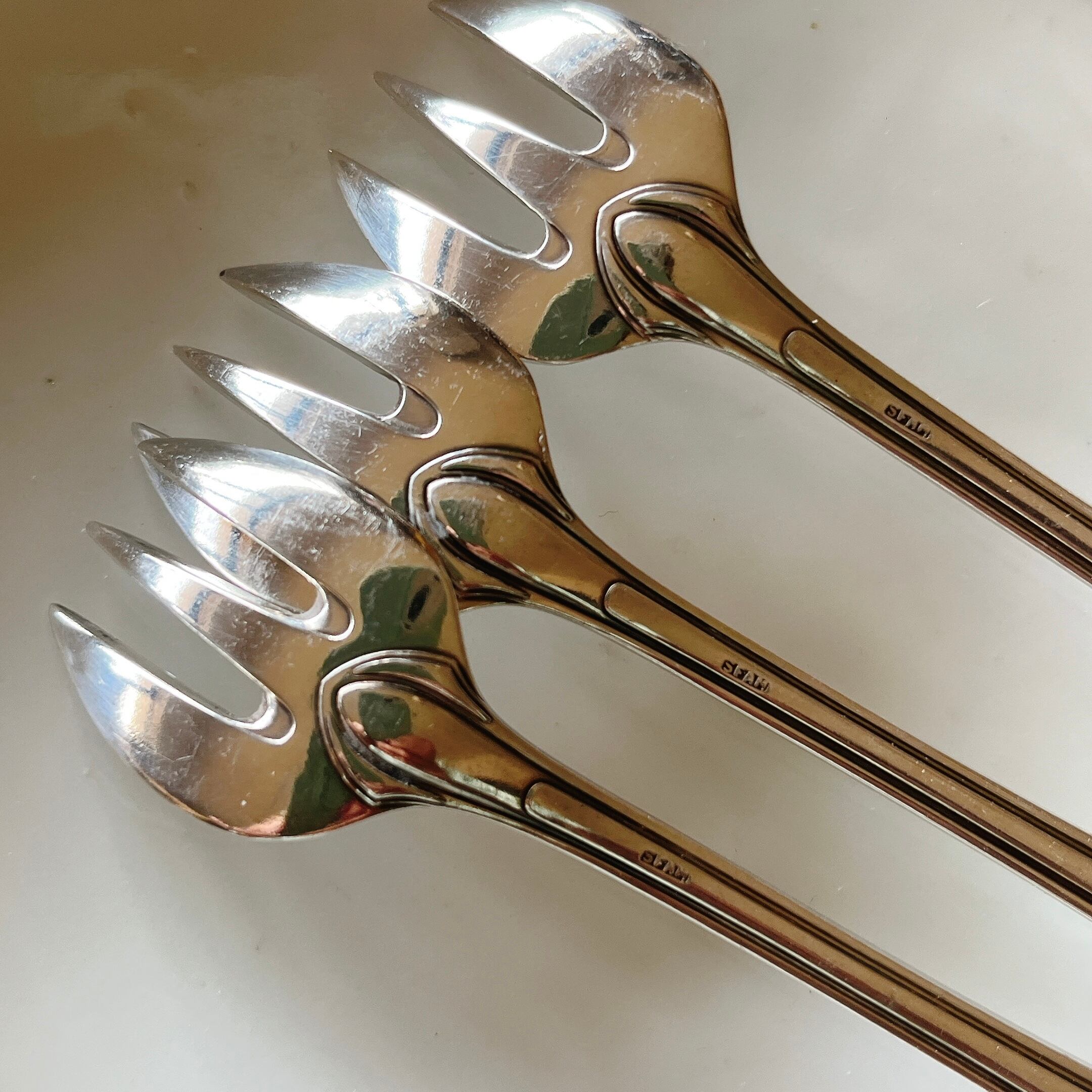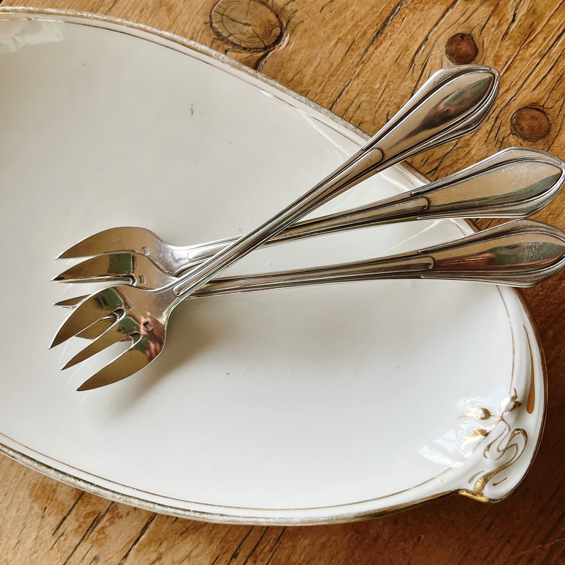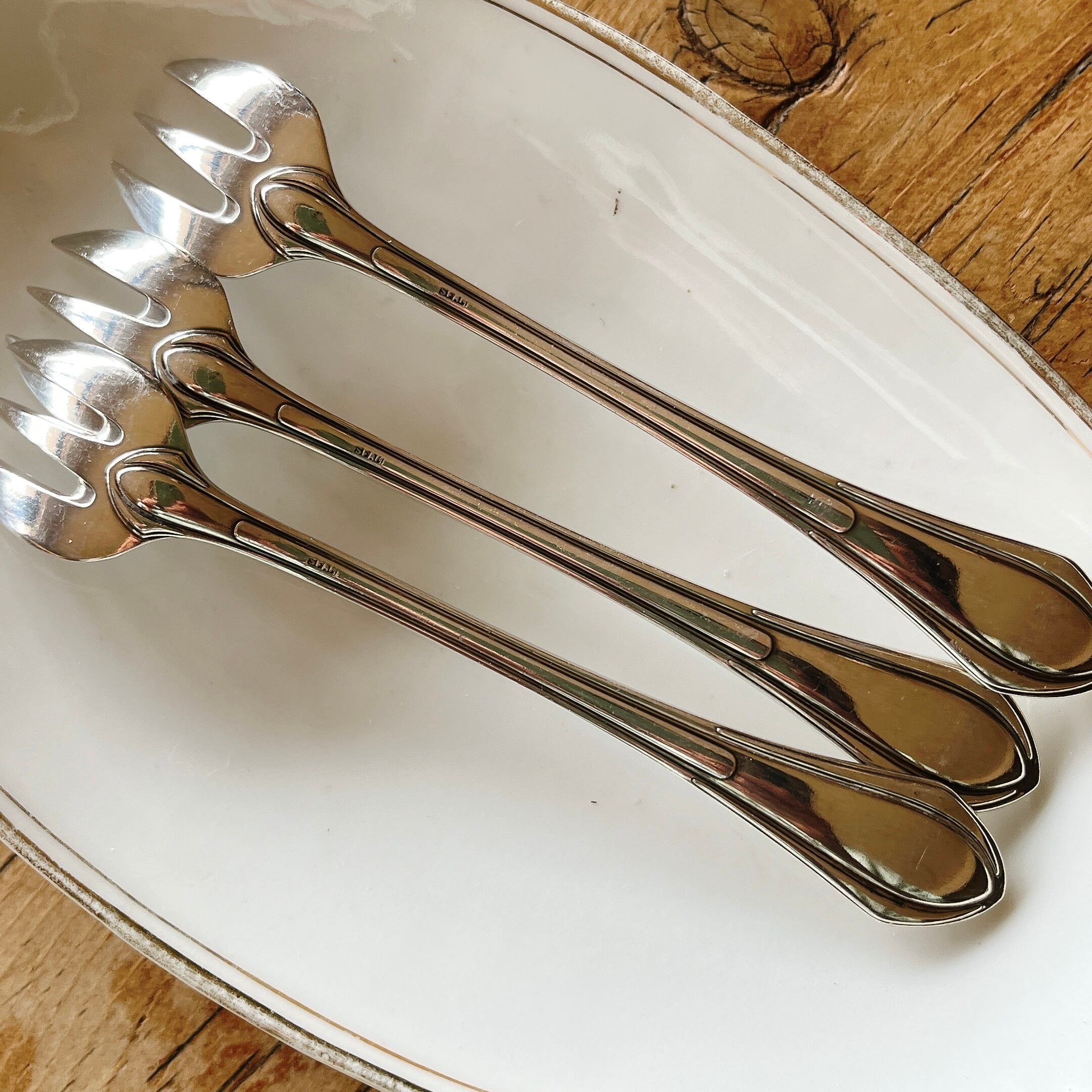 スッキリとしたデザインの、洗練されたシルバープレートのオイスターフォーク。