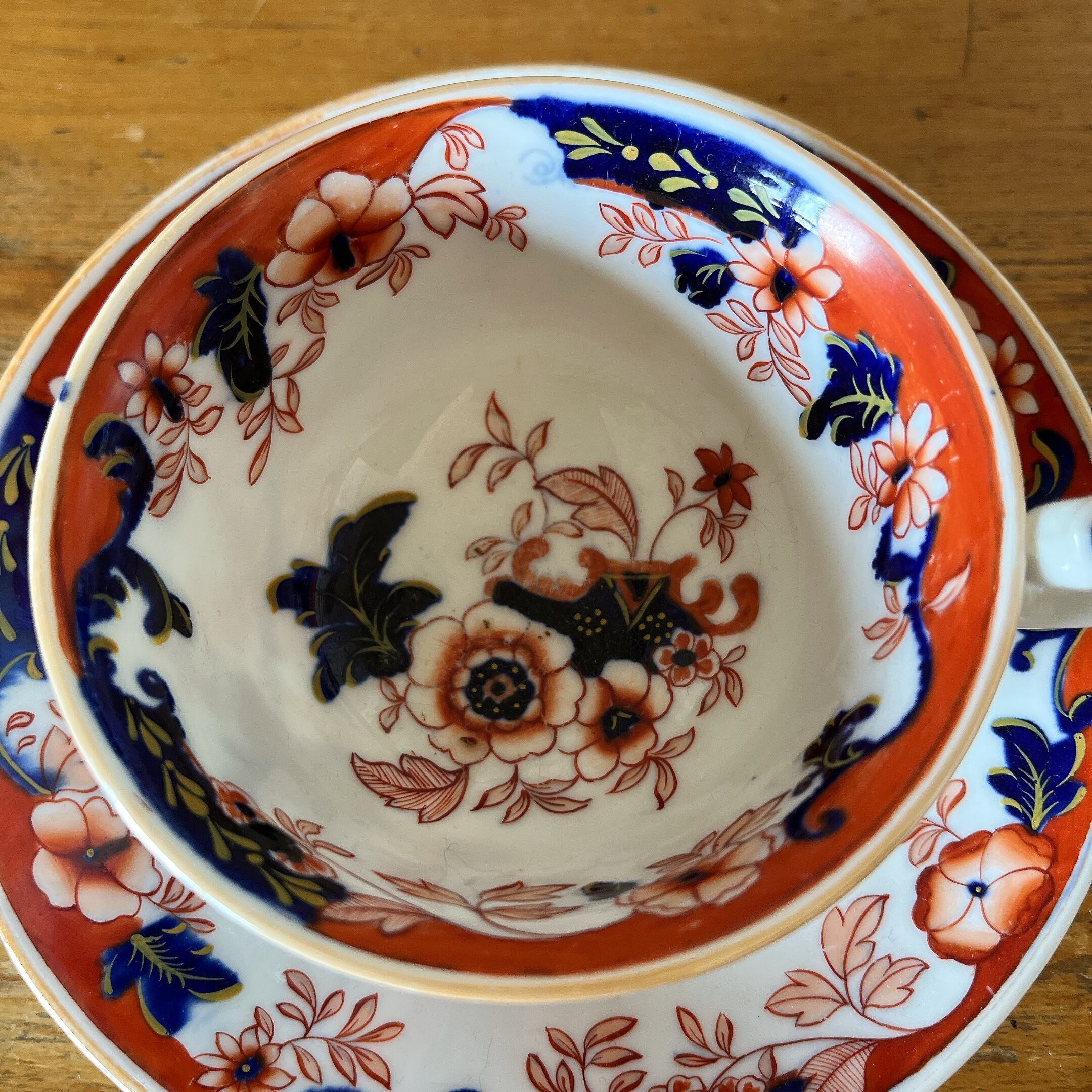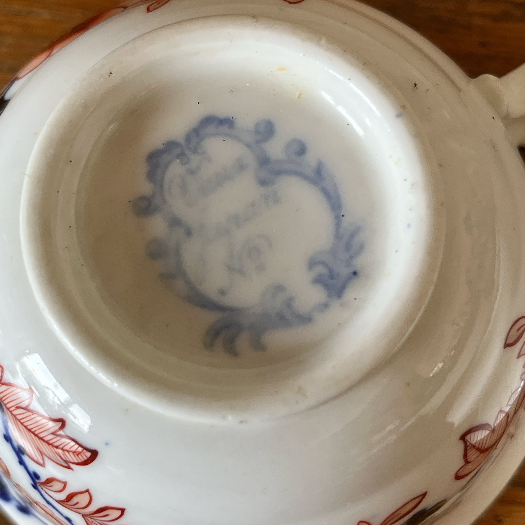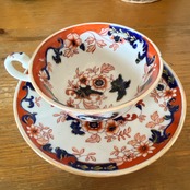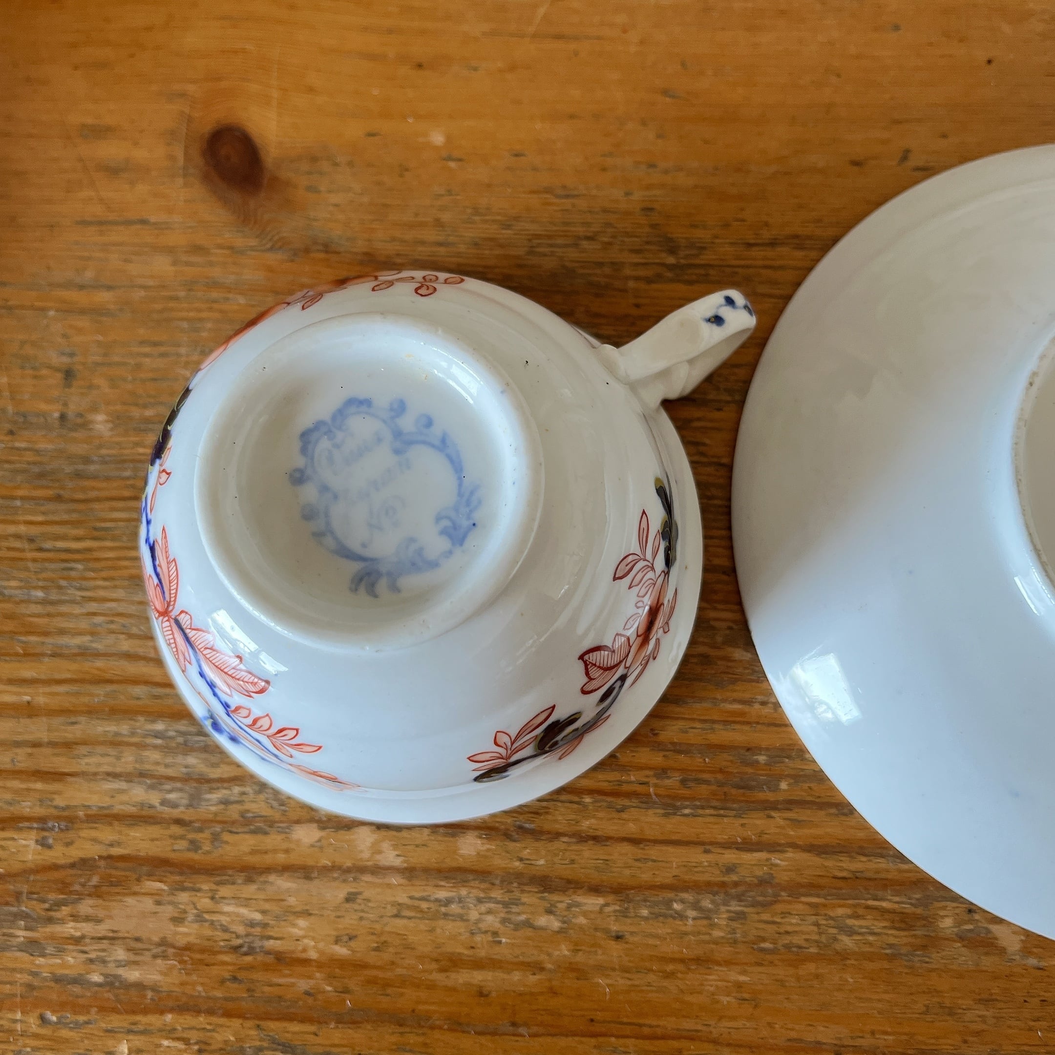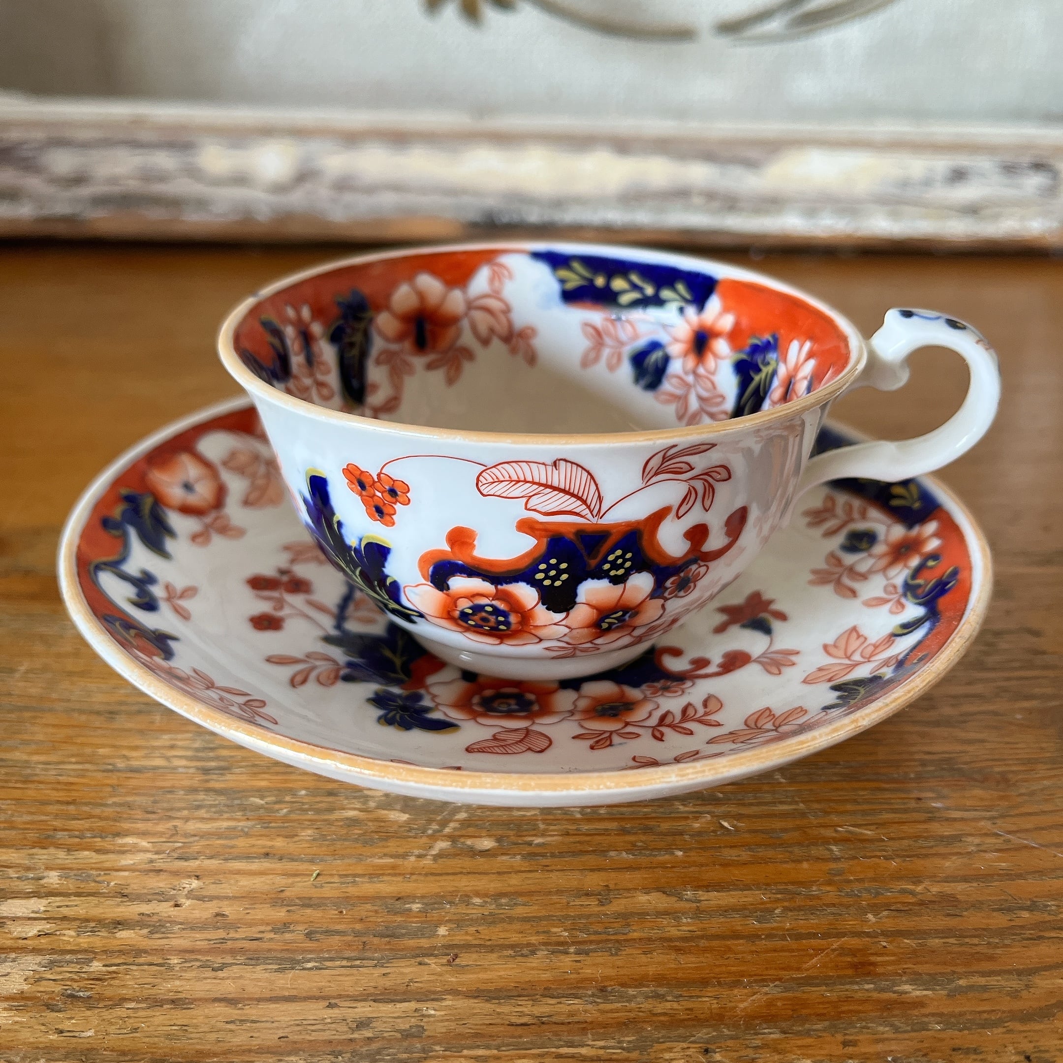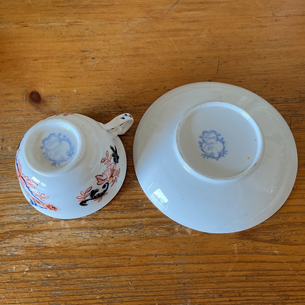 JAPANの文字があるように、日本の伊万里焼きをモチーフに、赤、青、金の彩色の美しいカップ&ソーサーです。