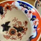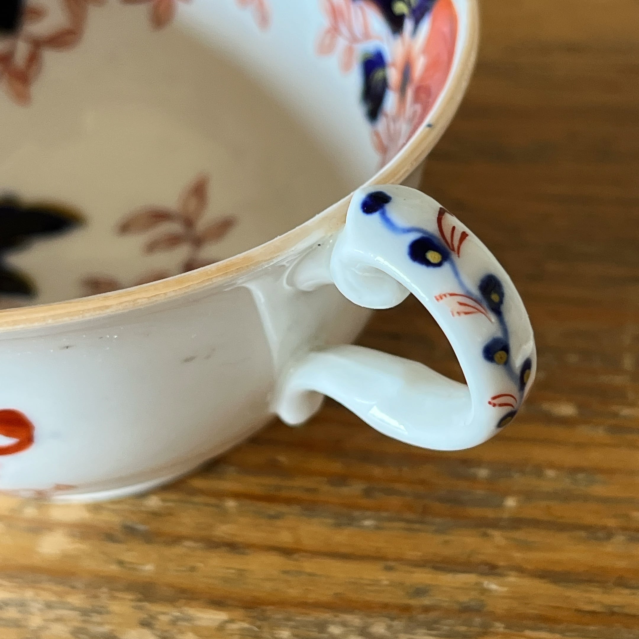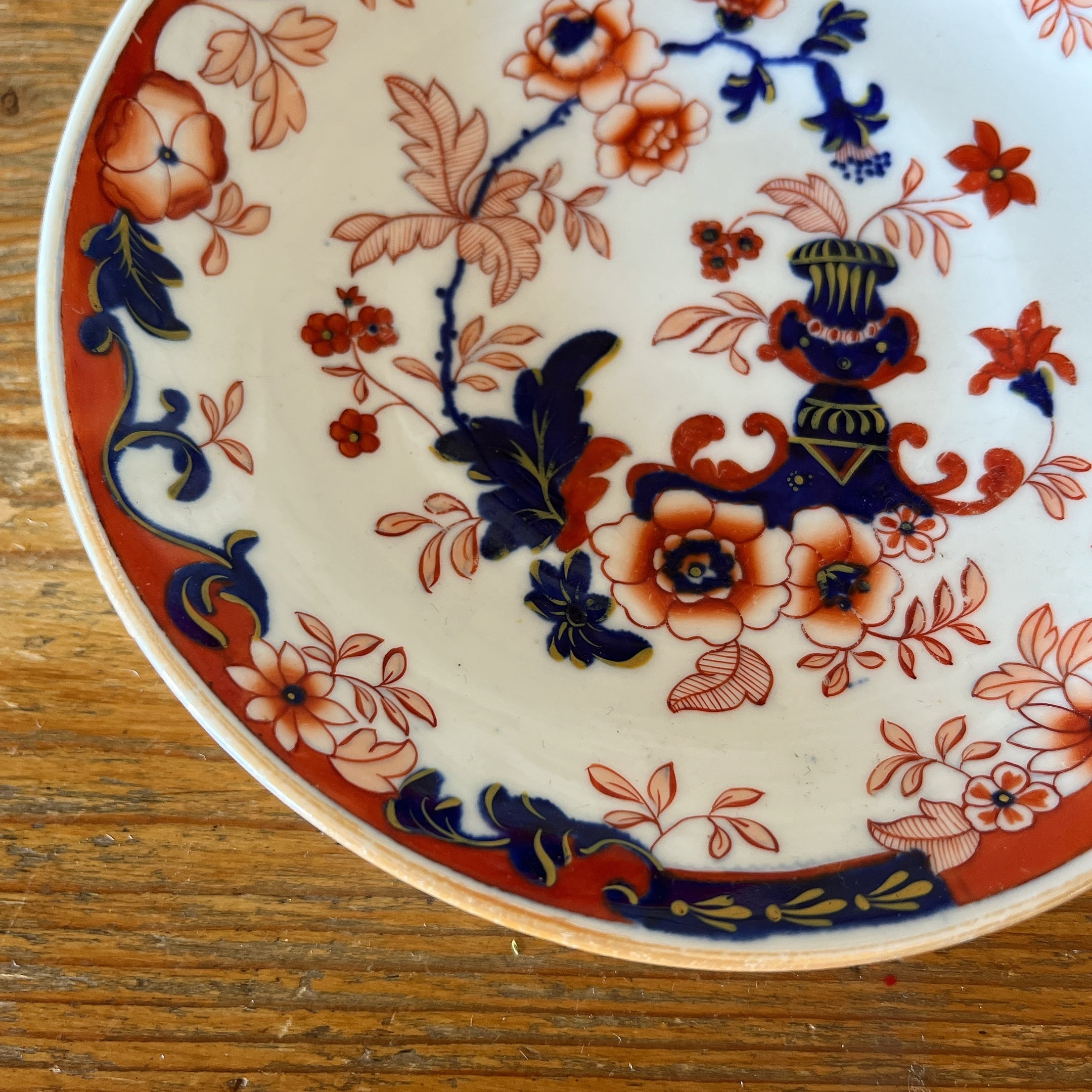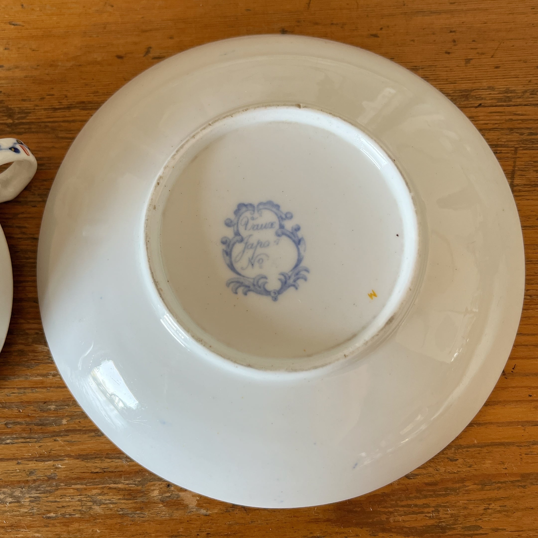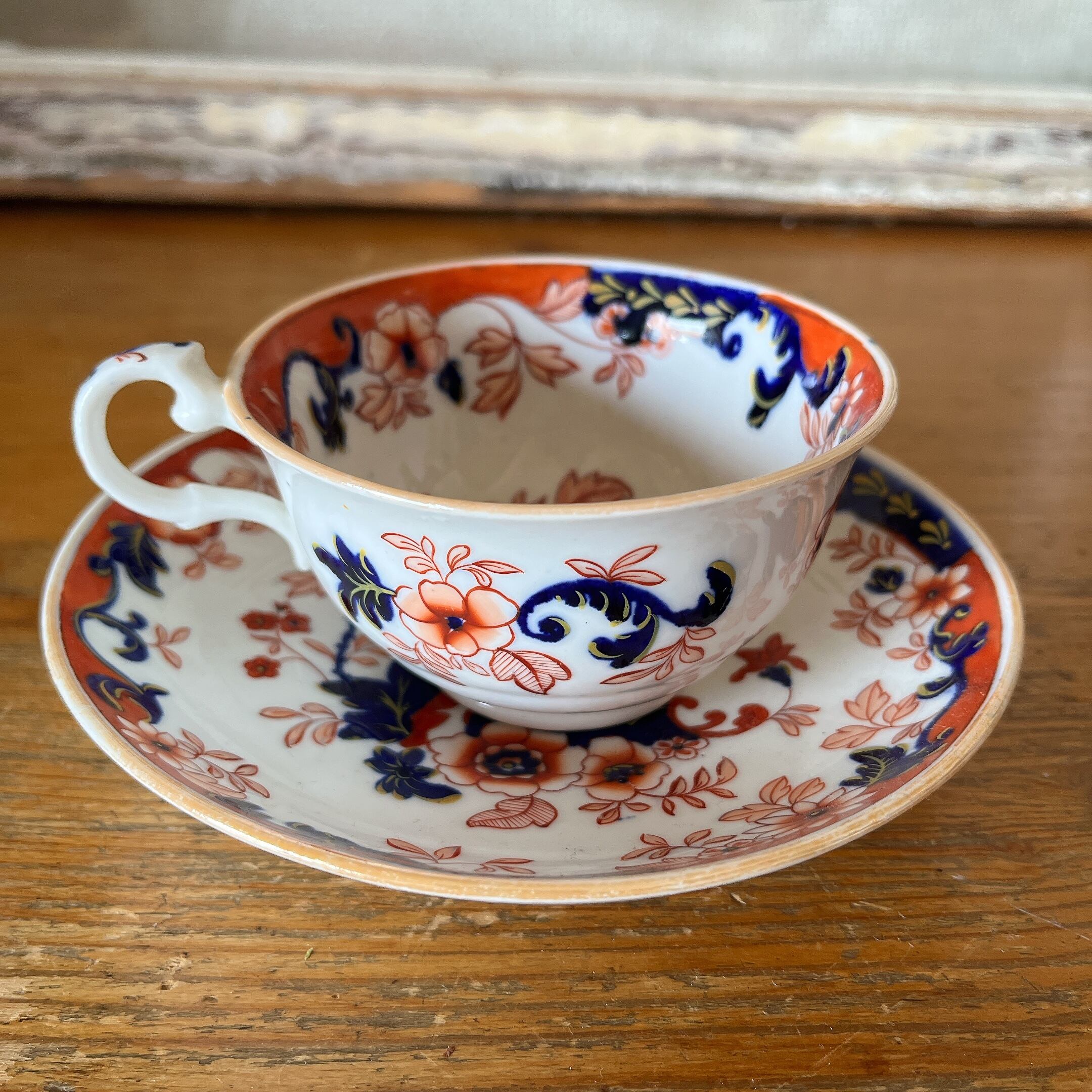 JAPANの文字があるように、日本の伊万里焼きをモチーフに、赤、青、金の彩色の美しいカップ&ソーサーです。
