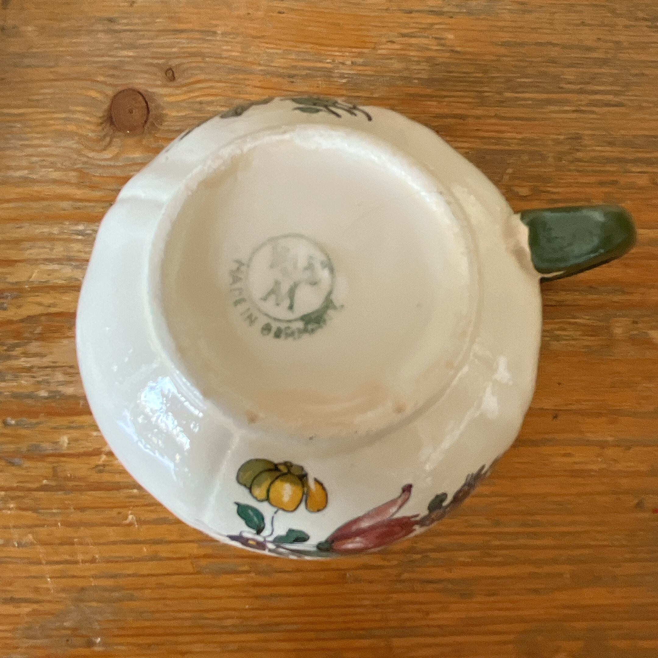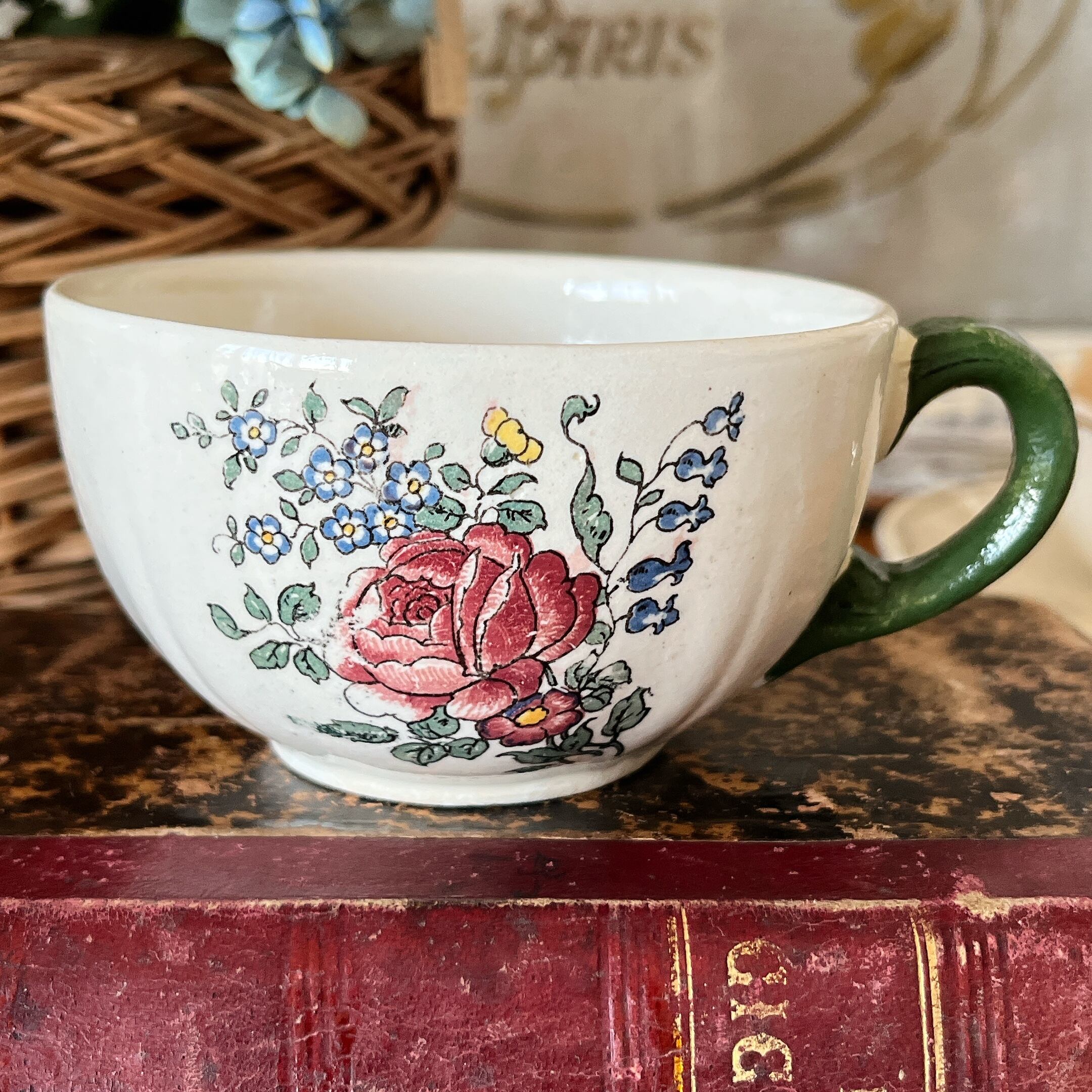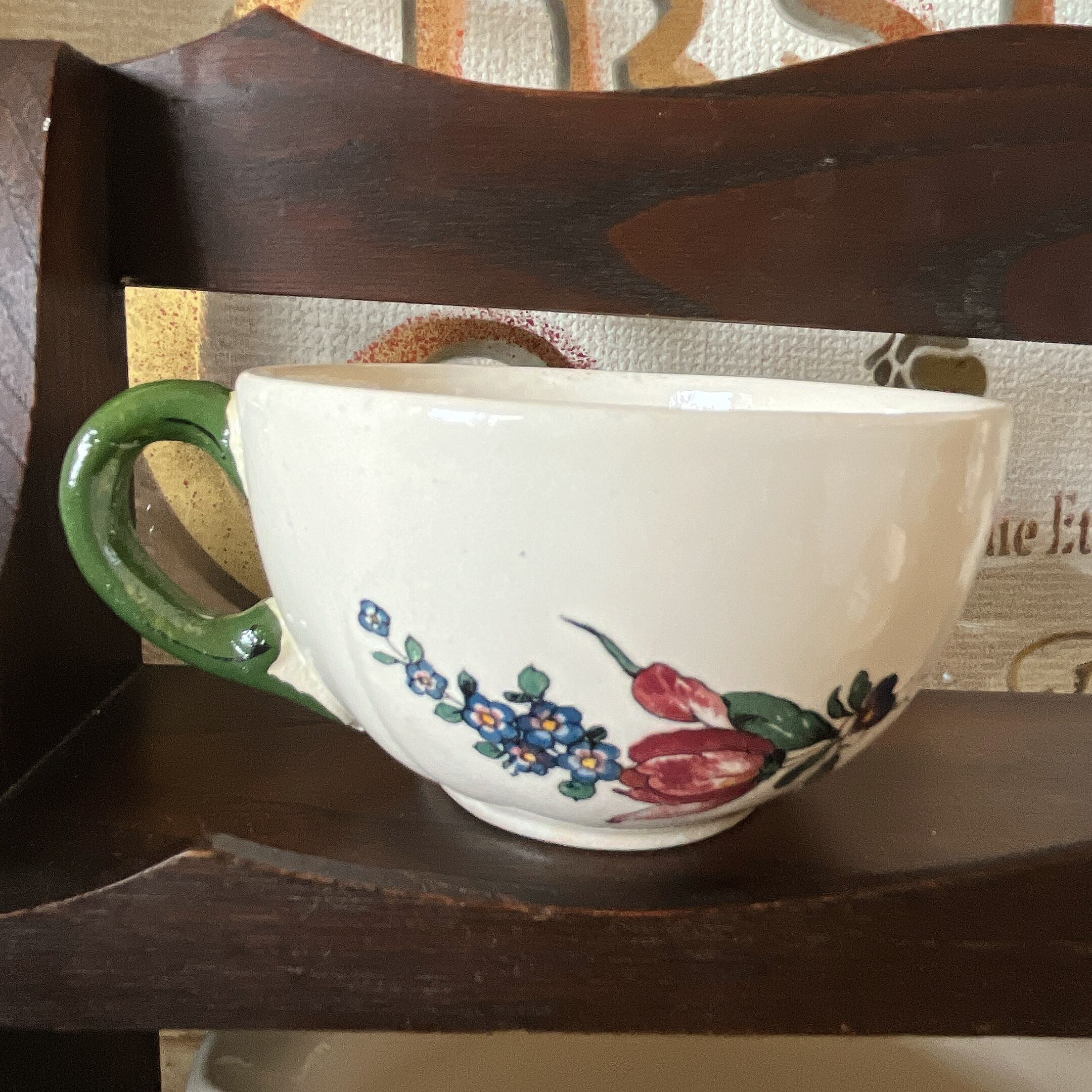 グリーンを基調に、美しい花柄で飾られたカップ&ソーサーです。持ち手がグリーンのレアなタイプです。こちらの正面はバラと小花になります。