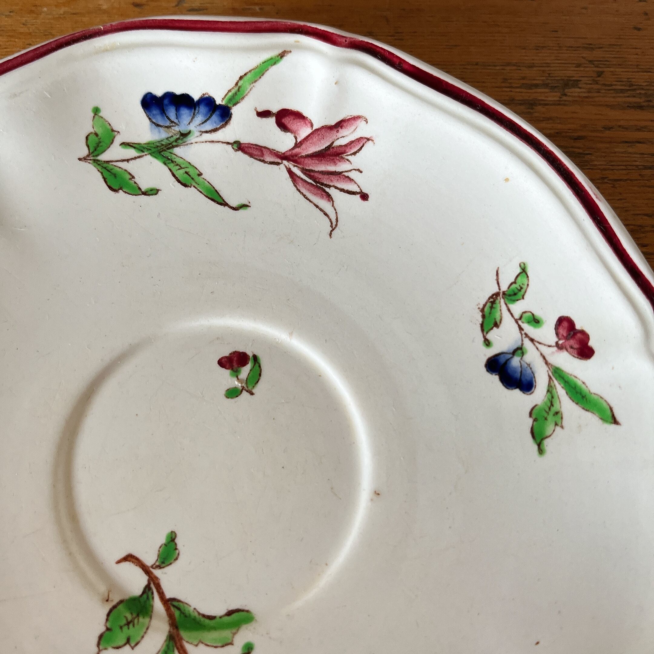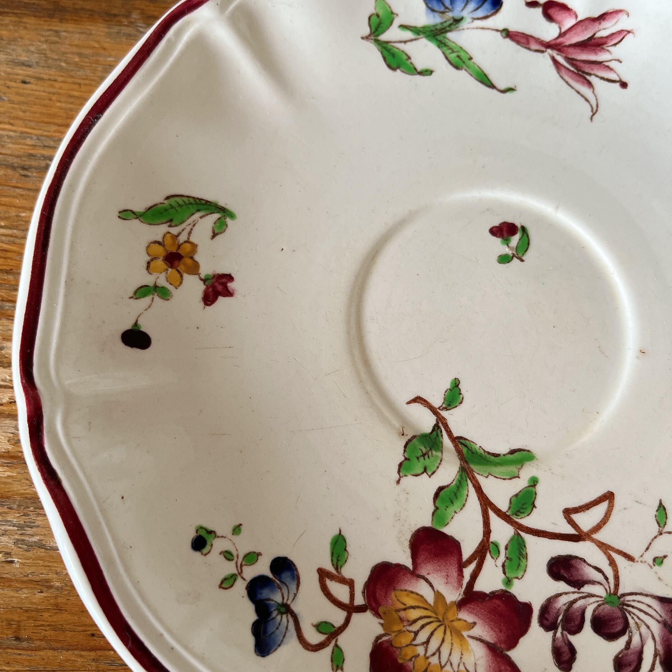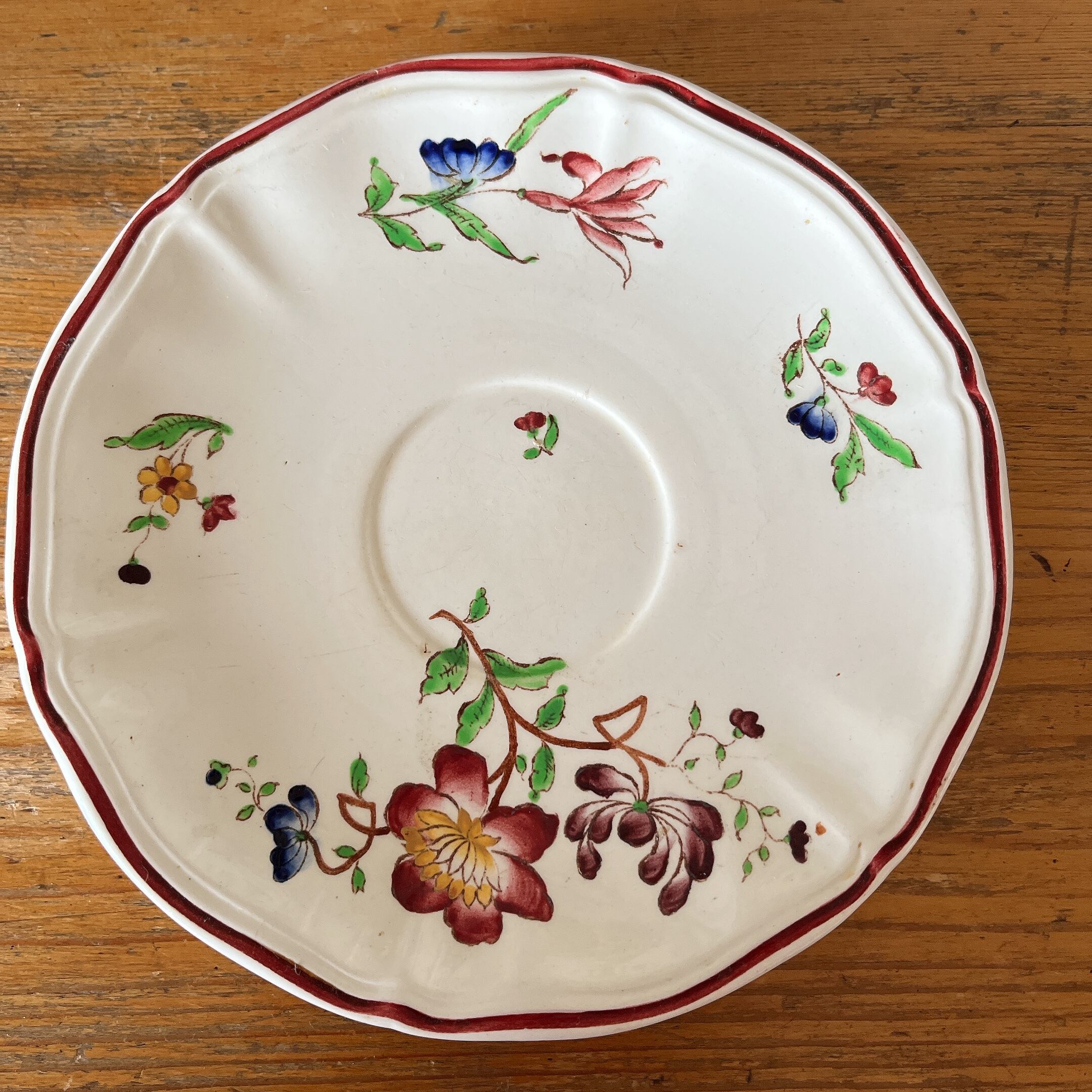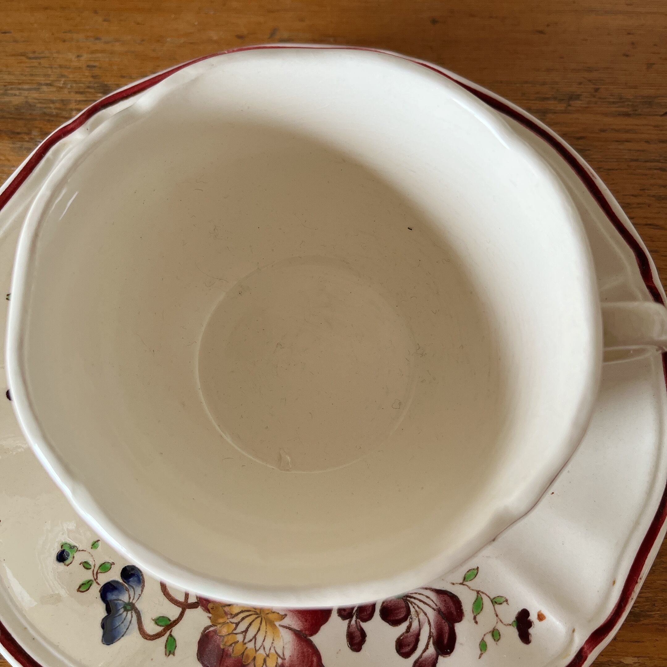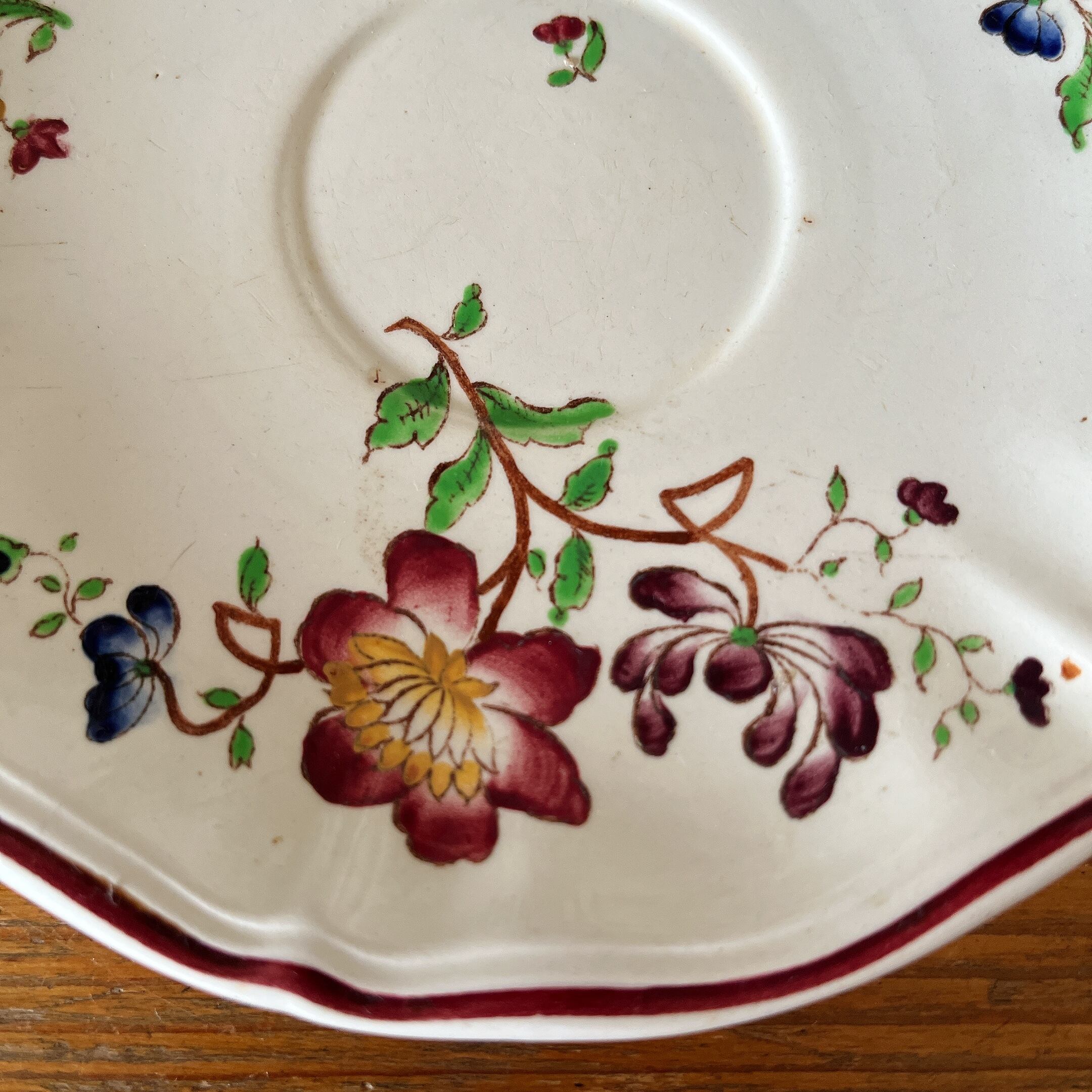 花リムのアイボリーに、赤いフチ取りに赤系の花柄が散りばめられた可愛いカップ&ソーサーです。