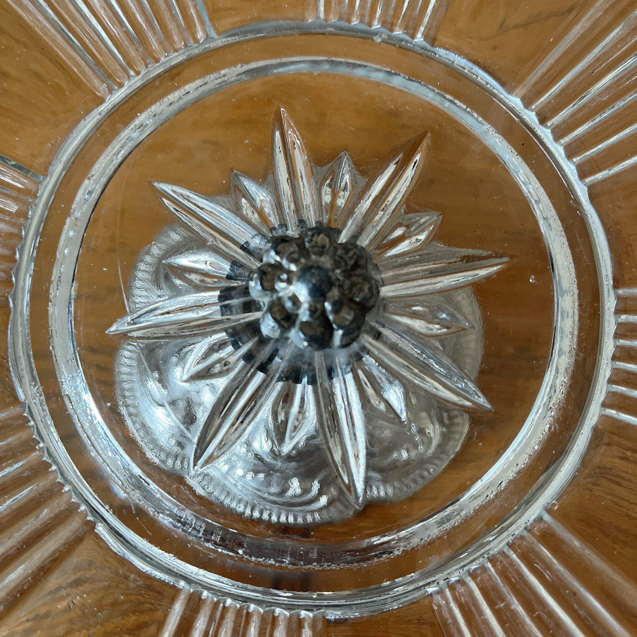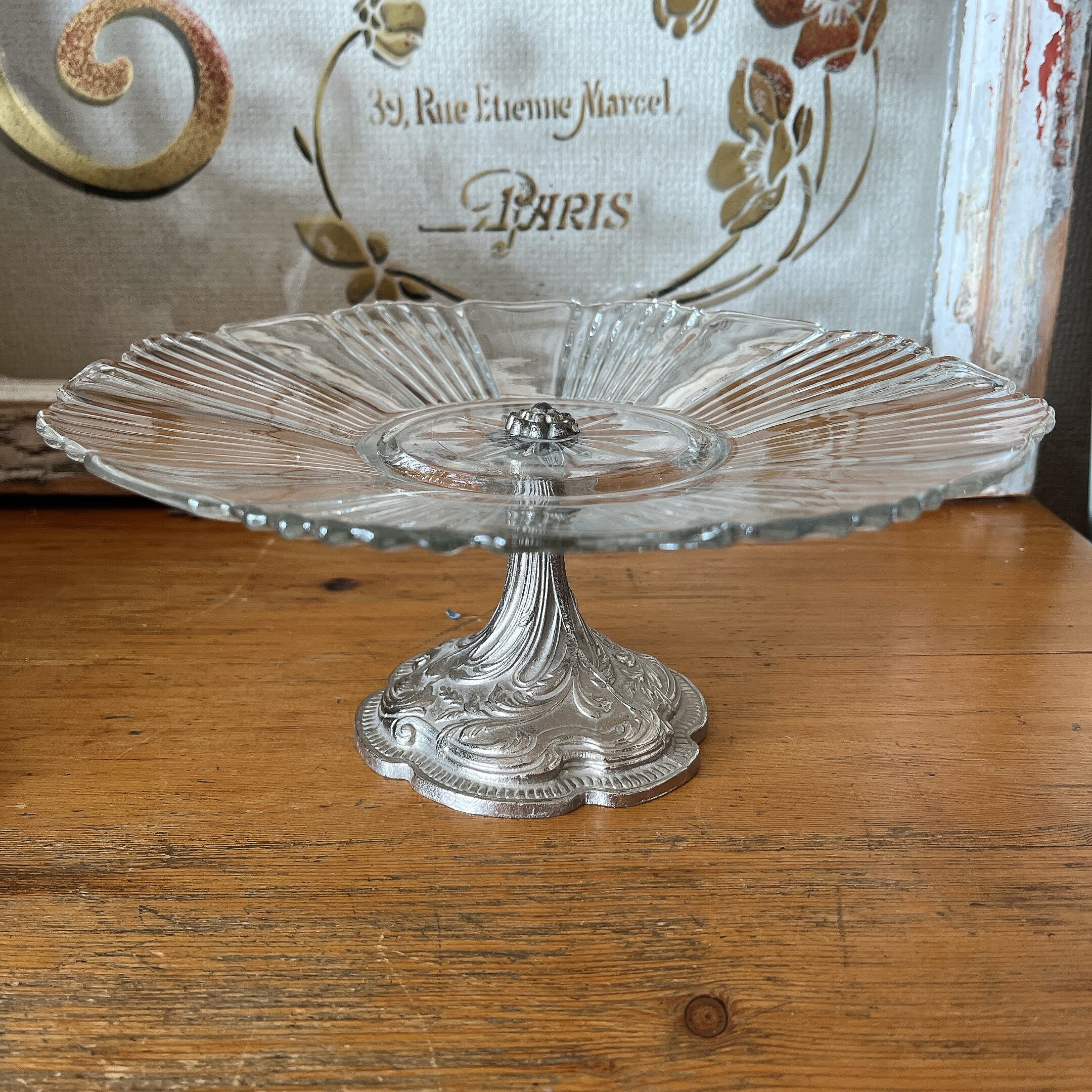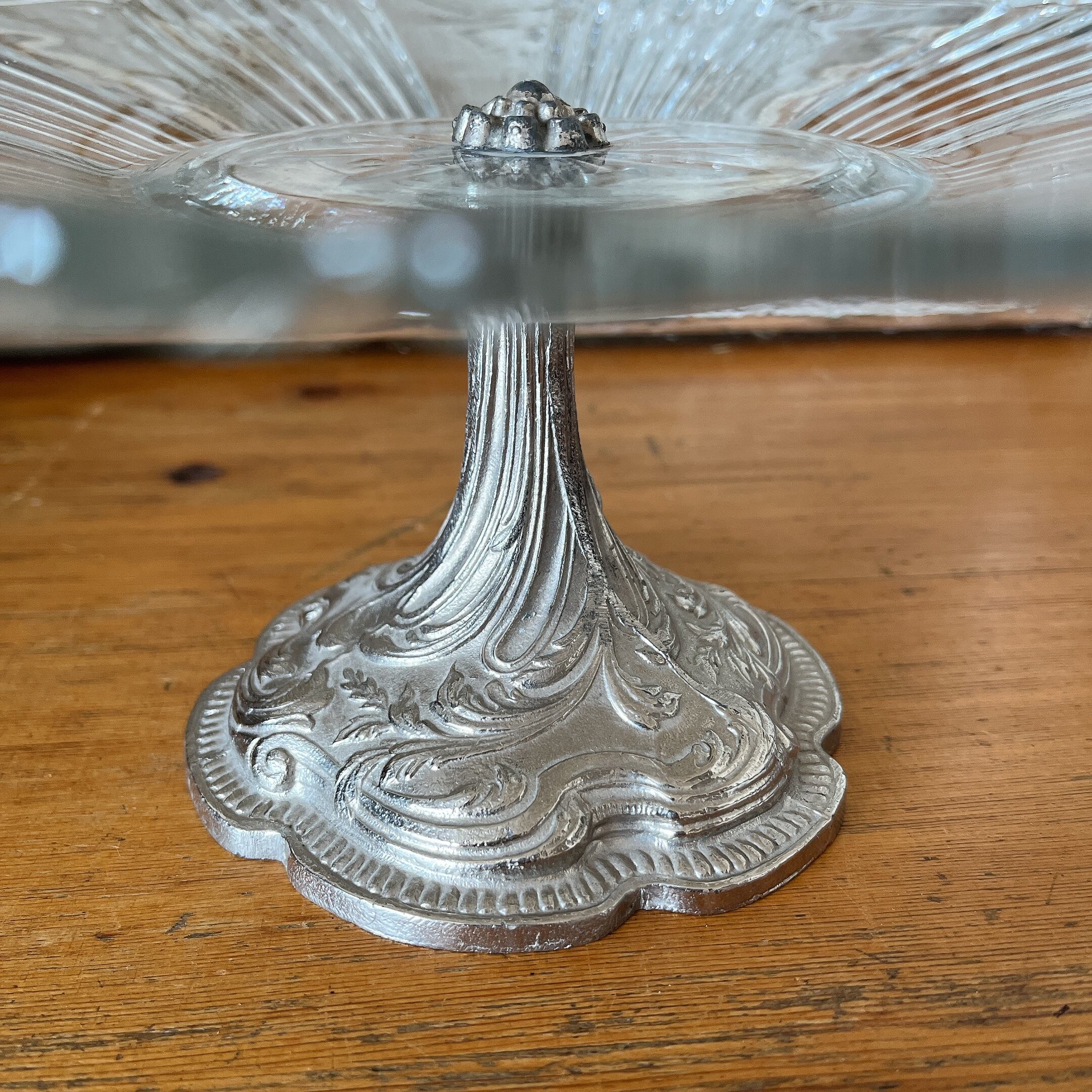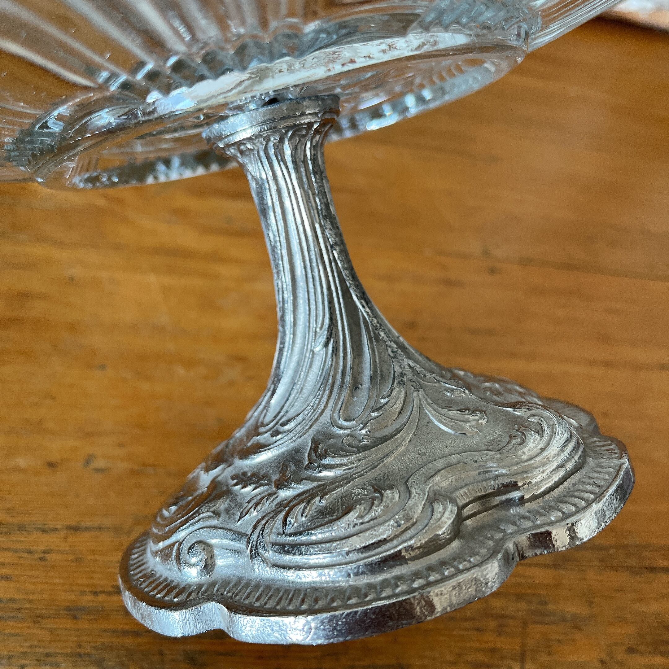 美しい彫りが入ったガラスとアイアンのコンポティエ。気泡が見られるので、古い物だと思います。
