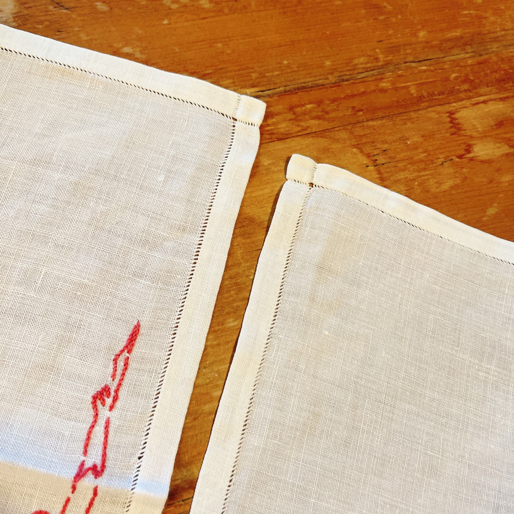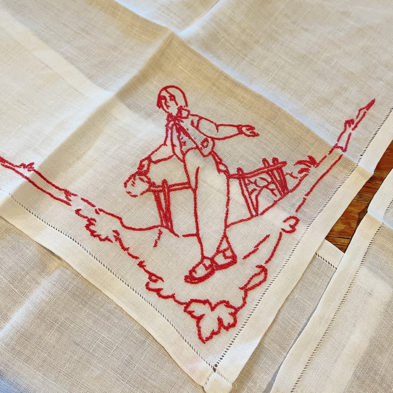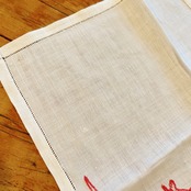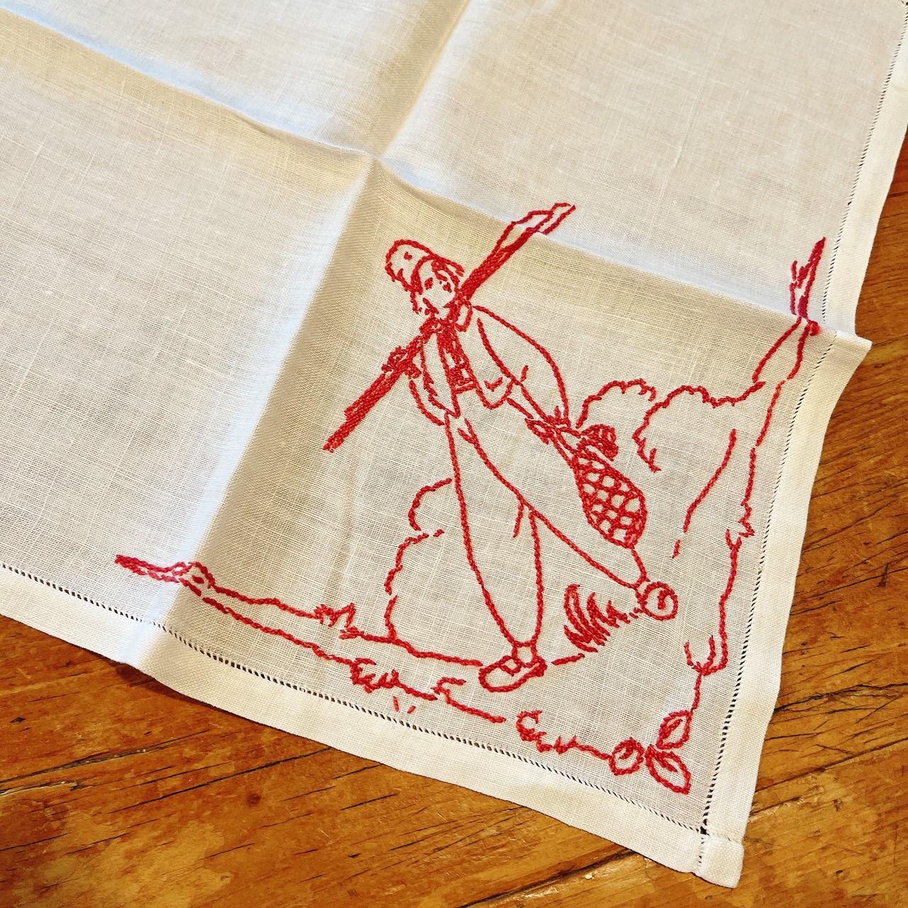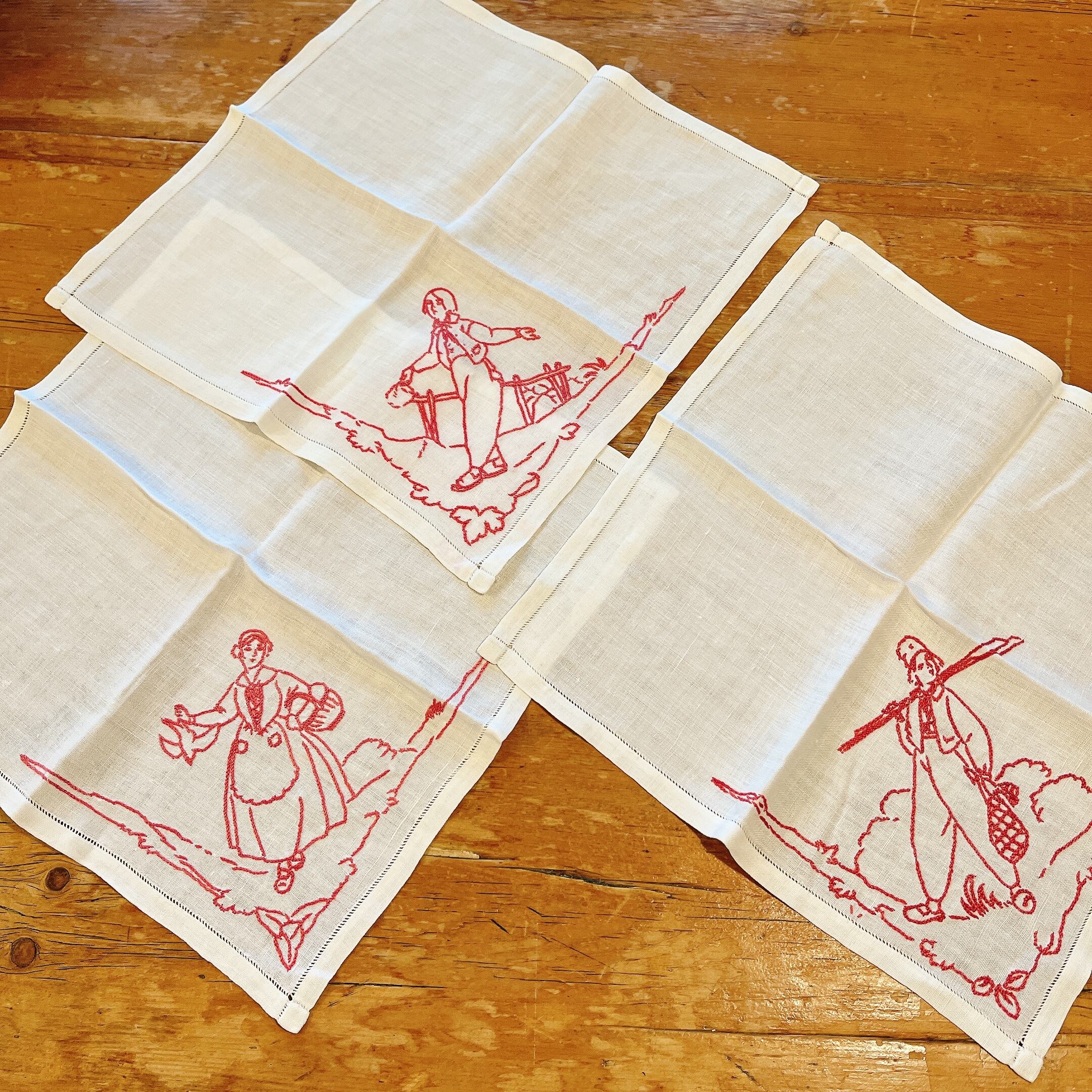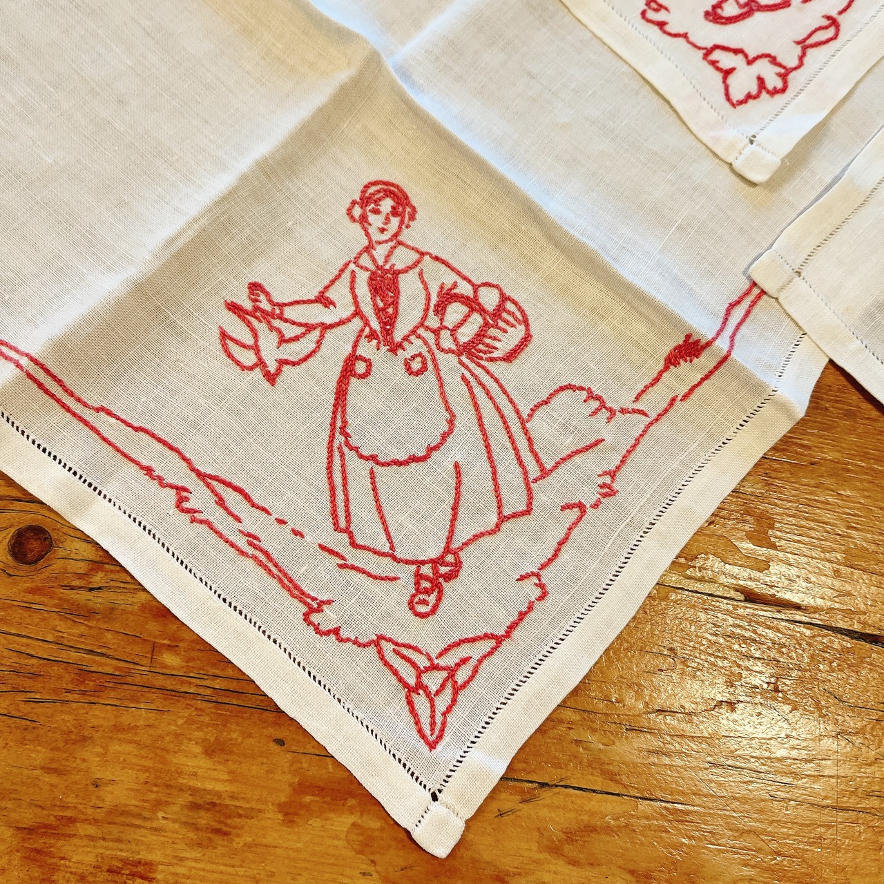 赤い刺繍で村での暮らしが描かれている可愛いナプキン3枚セットです。