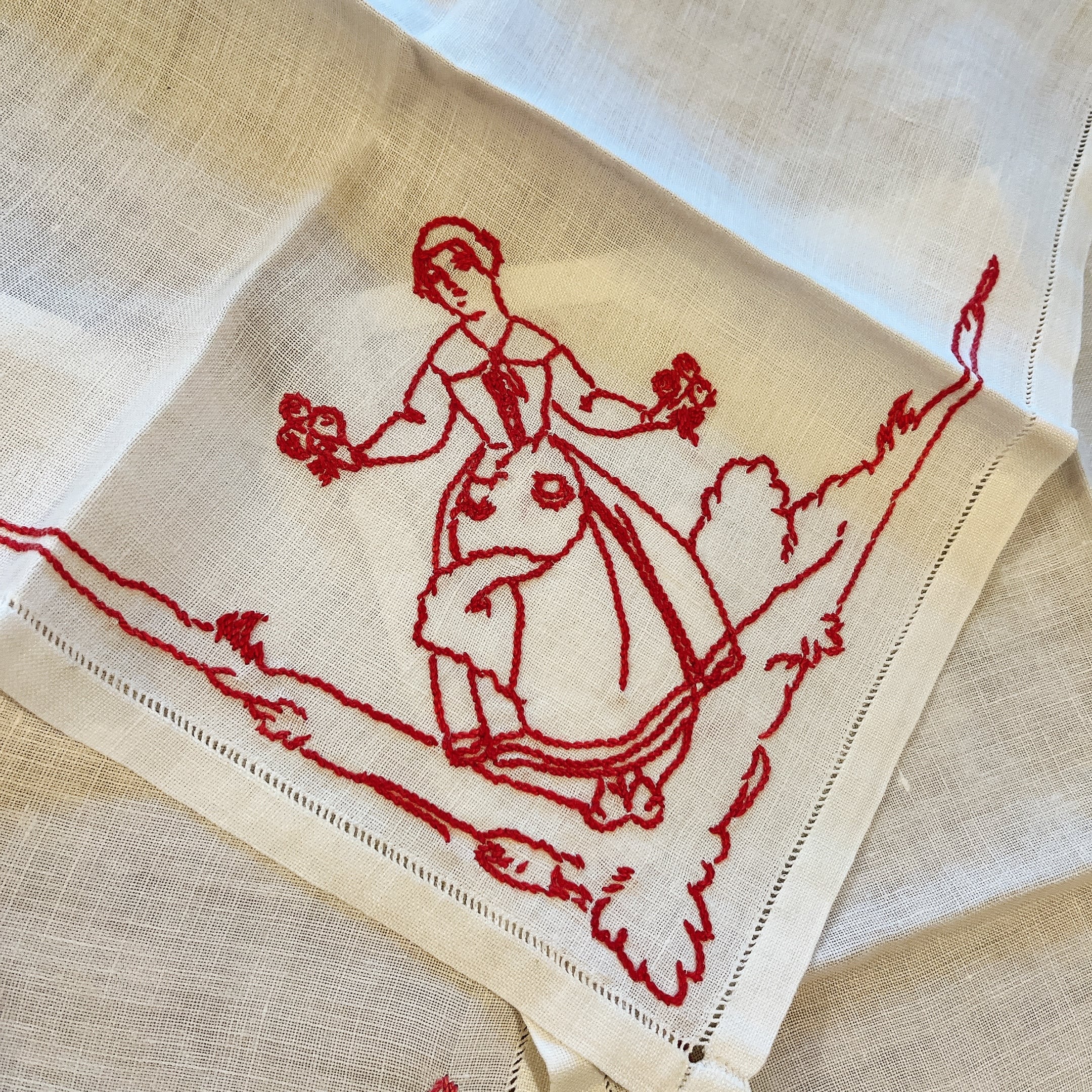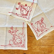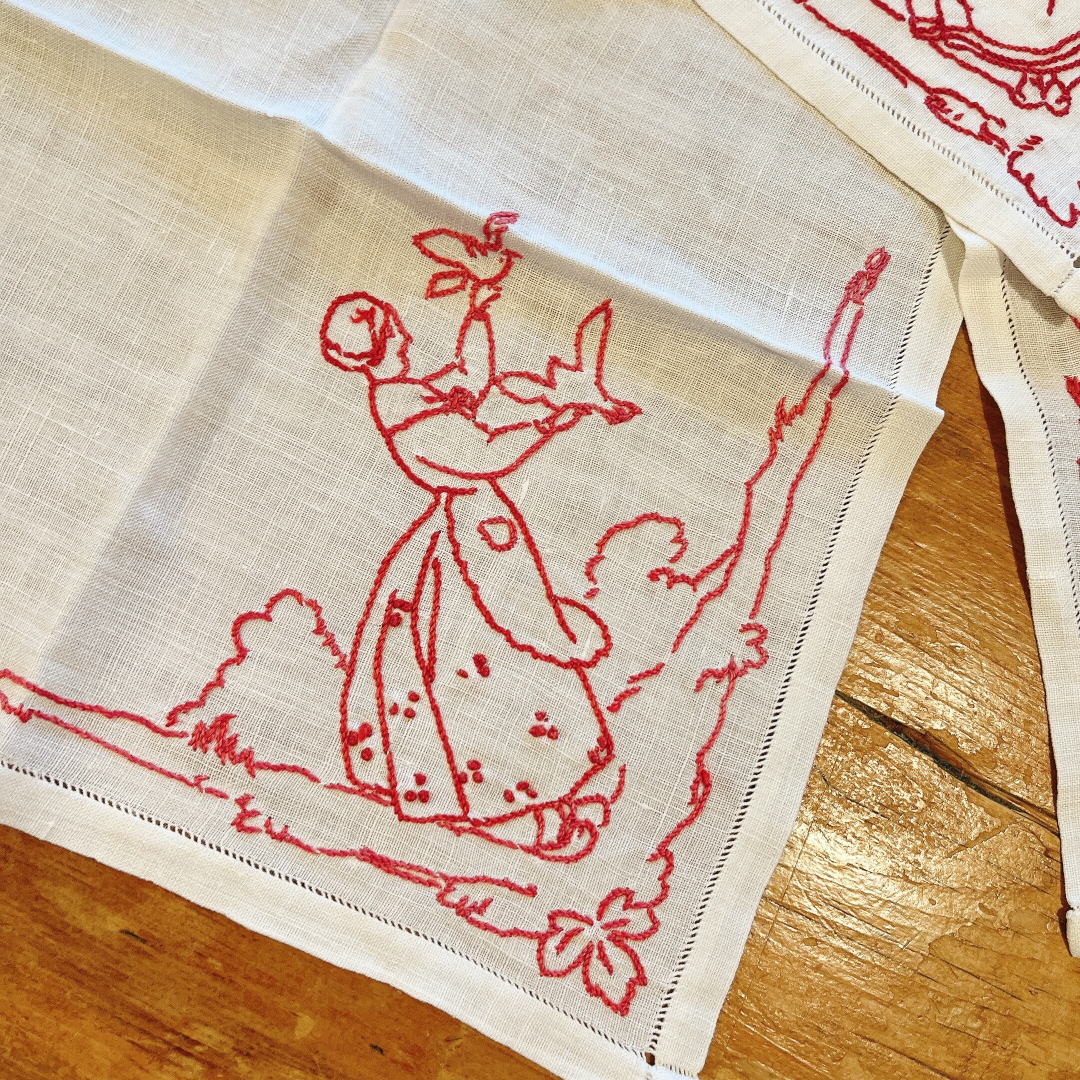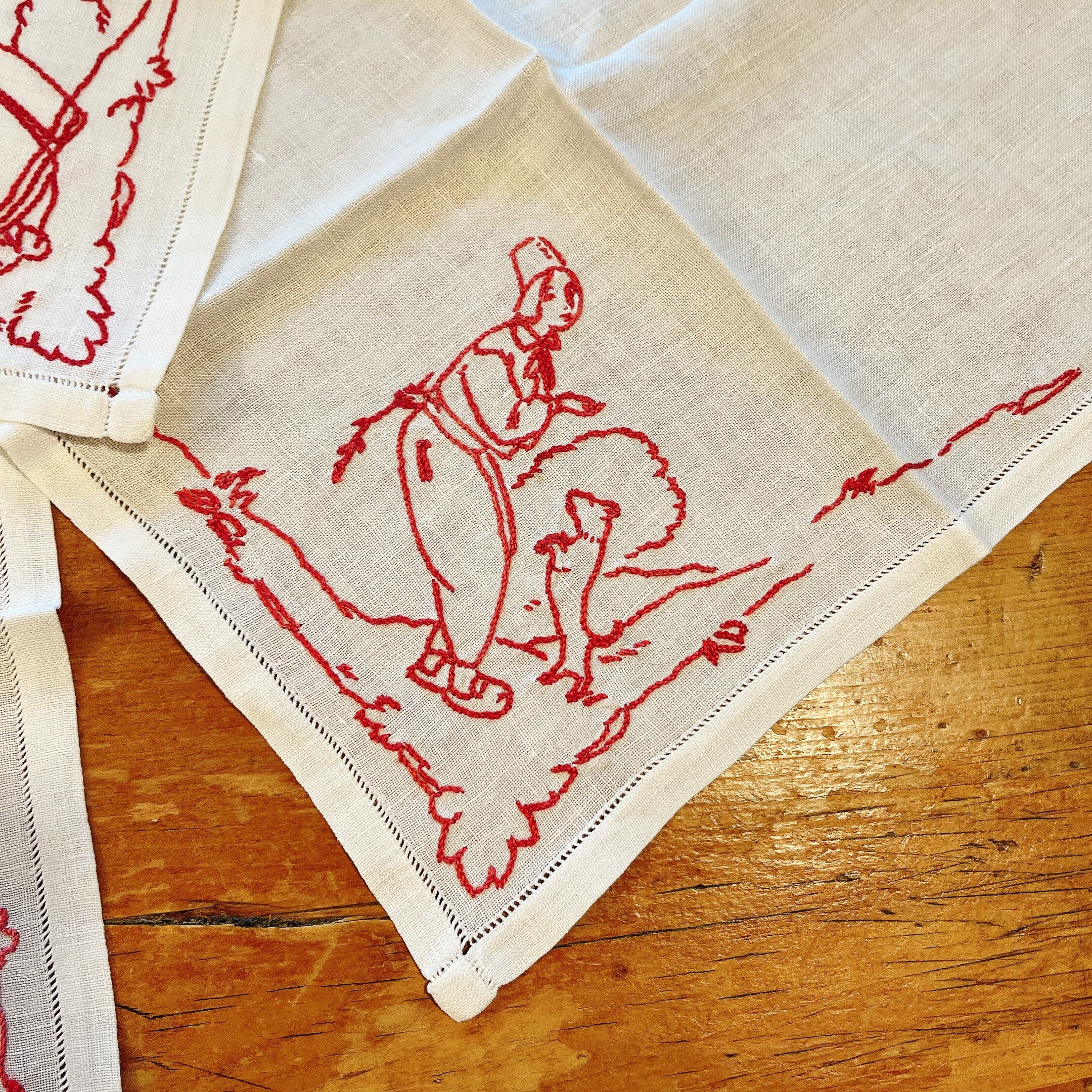 赤い刺繍で村での暮らしが描かれている可愛いナプキン3枚セットです。