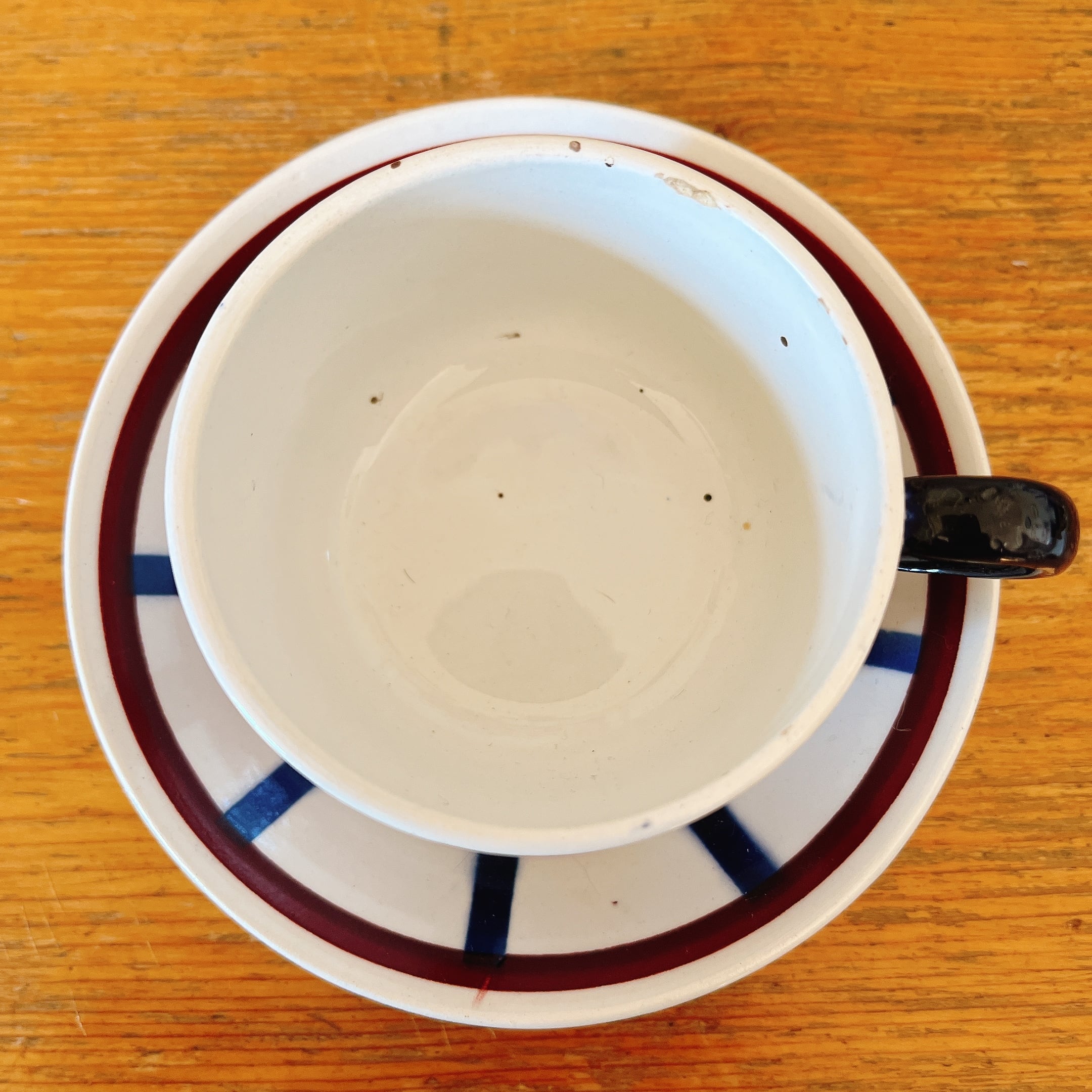 カップ内側にインク染み、フチにチップ、持ち手に剥げがありますが、貫入、ヒビはありません。ソーサーはヒビ、欠けなく美品です。