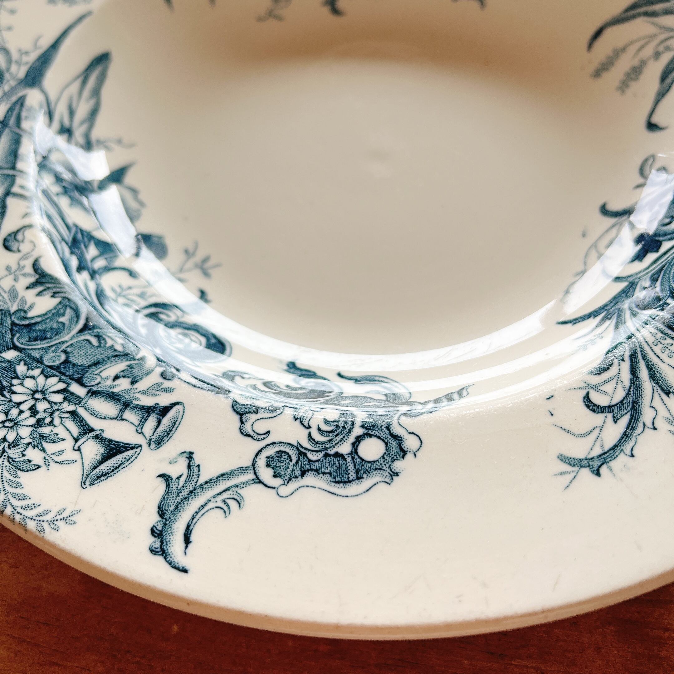 ロカイユ模様と美しいブルーの花が描かれたスーププレート。