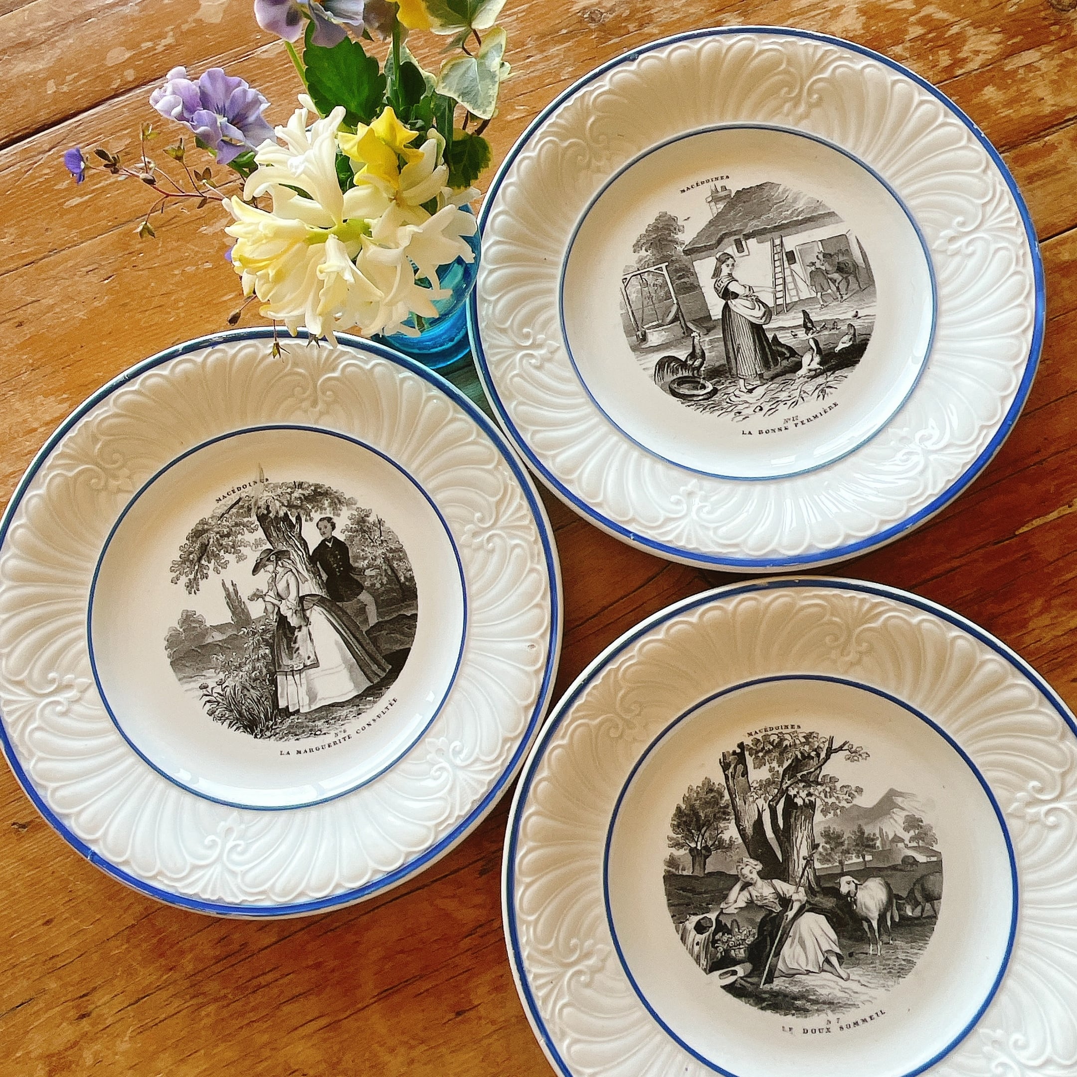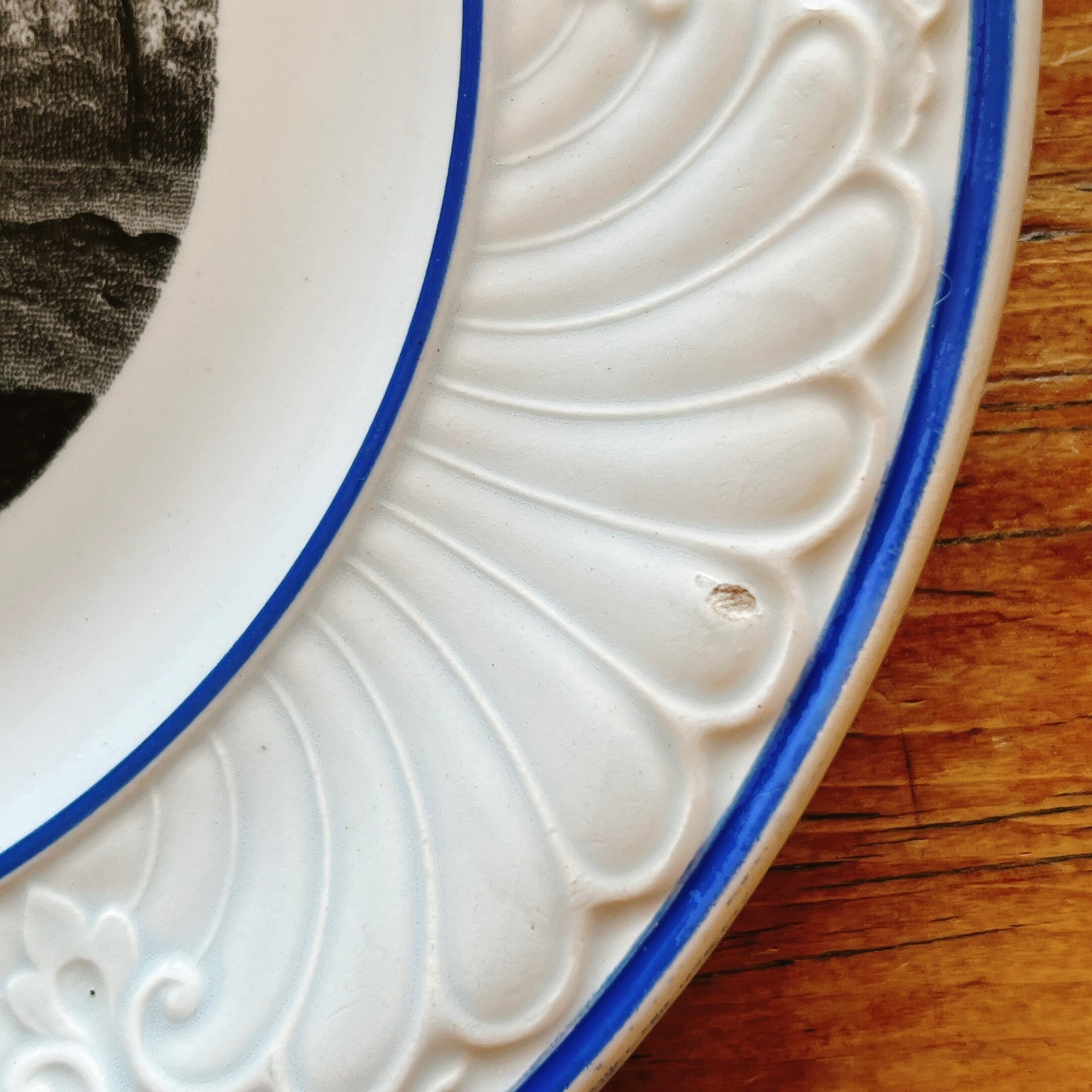 フチのブルーとレリーフが美しい、飾って眺めたくなるプレートです。