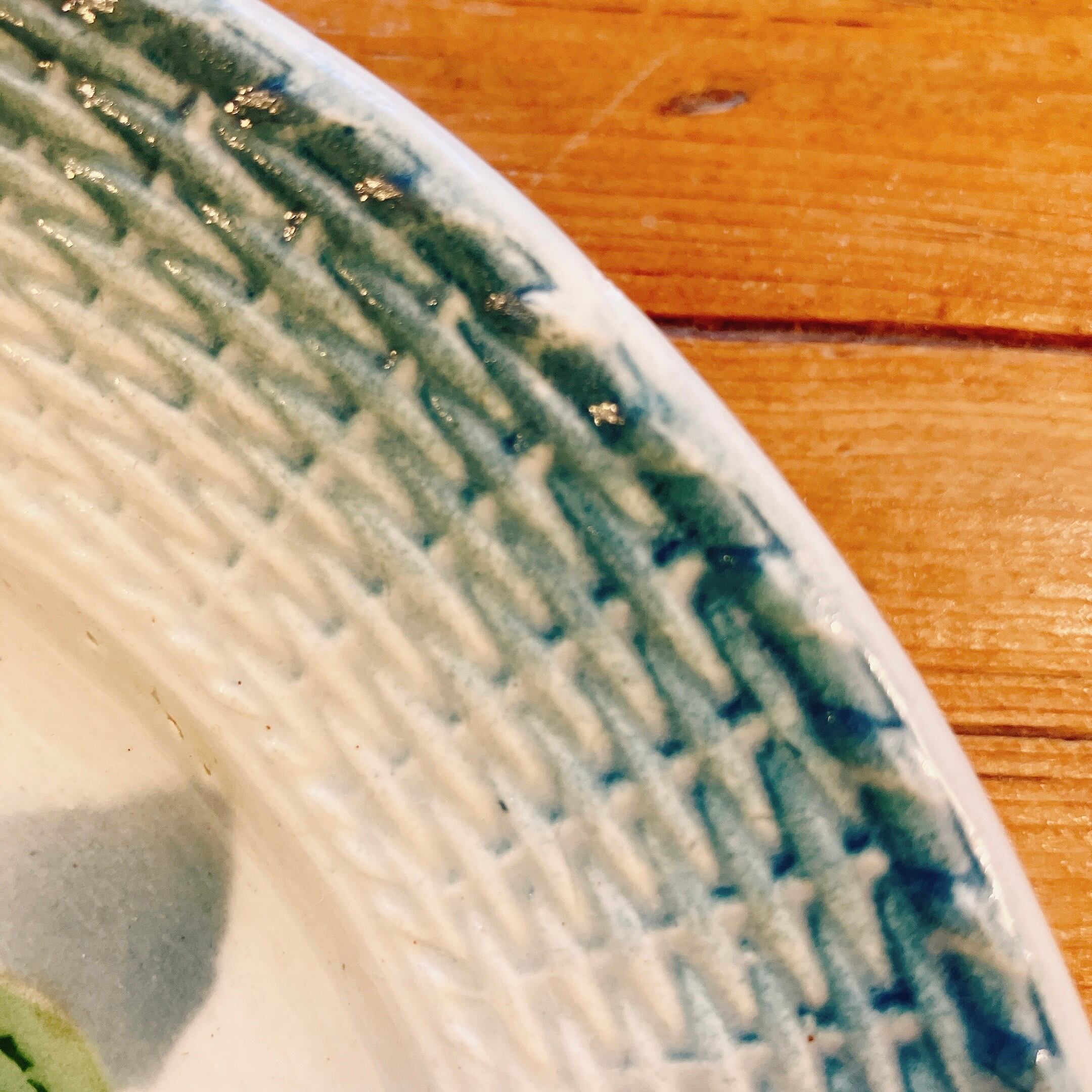 全体的に貫入があり、貫入に一部染み、表側パニエ部分にチップがありますが、欠け、ヒビは無く美品です。