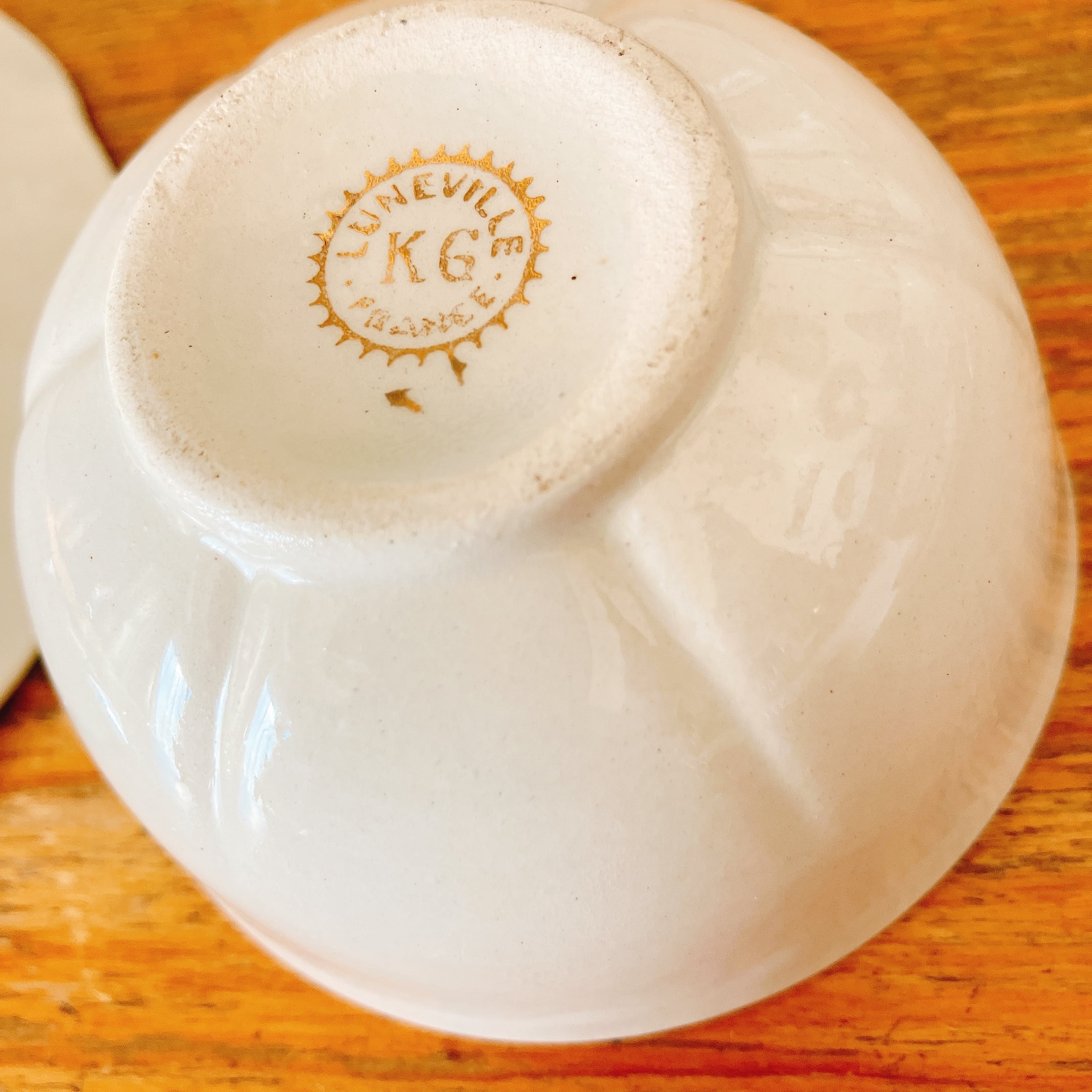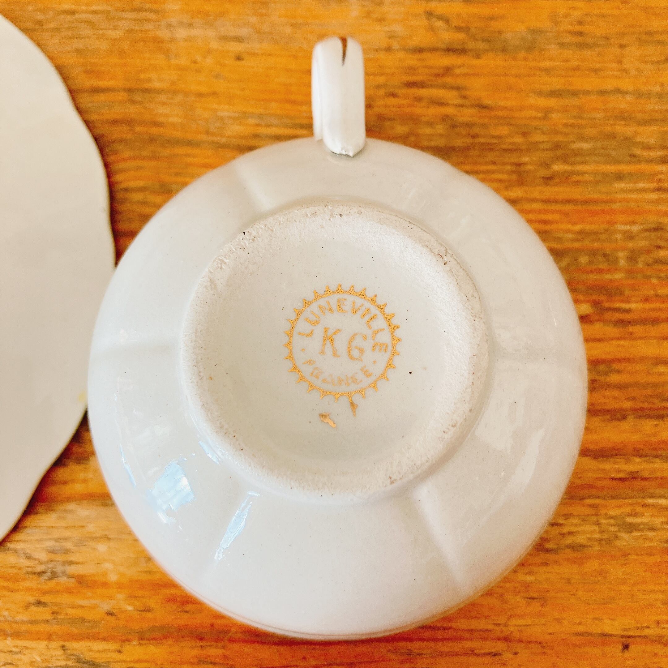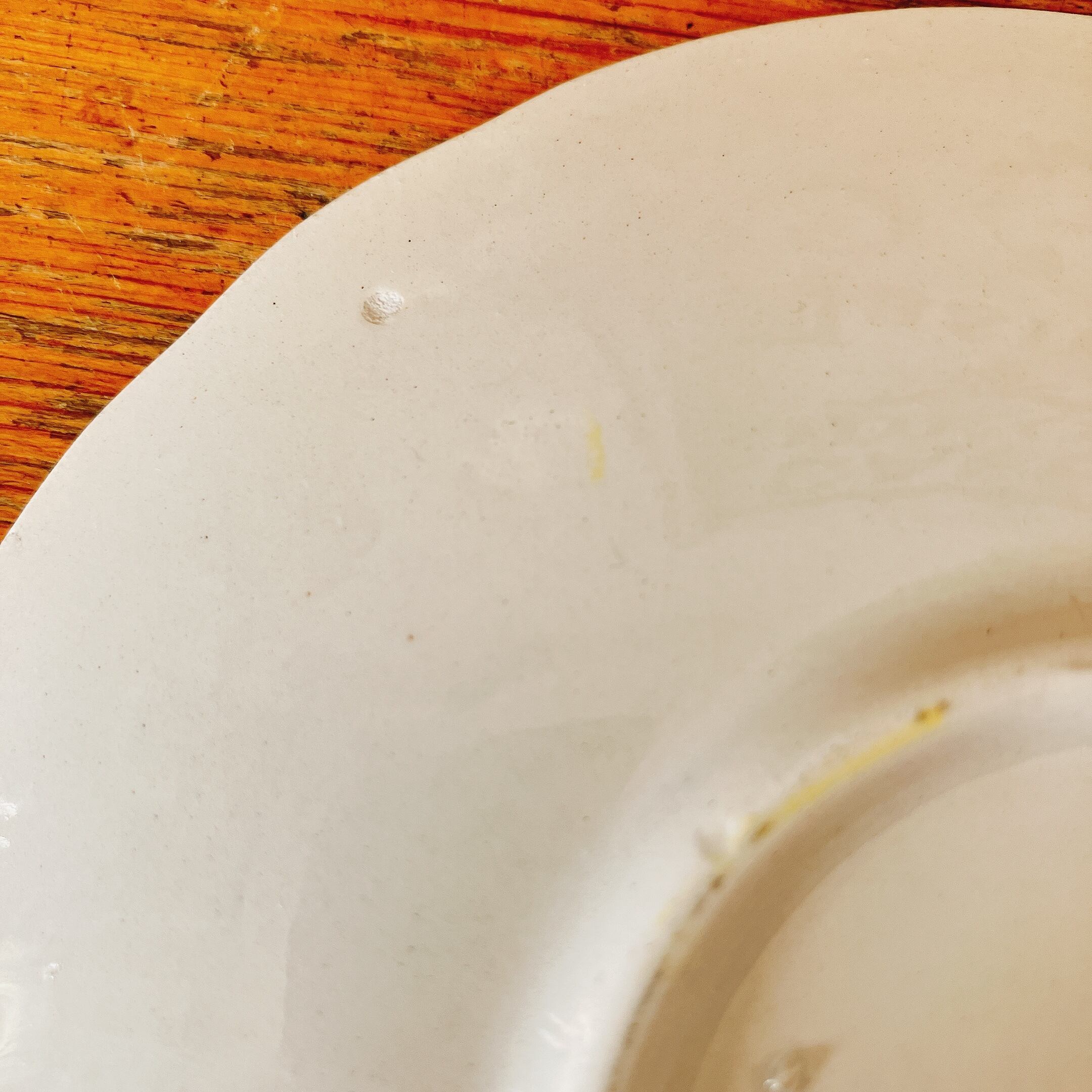 フチには、金彩が入っていて、ほんの少し擦れがあります。ソーサーの表側に良く見ると釉薬が溜まった所があり、裏側に小さい穴がありますが、ヒビ、欠け無く美品です。
