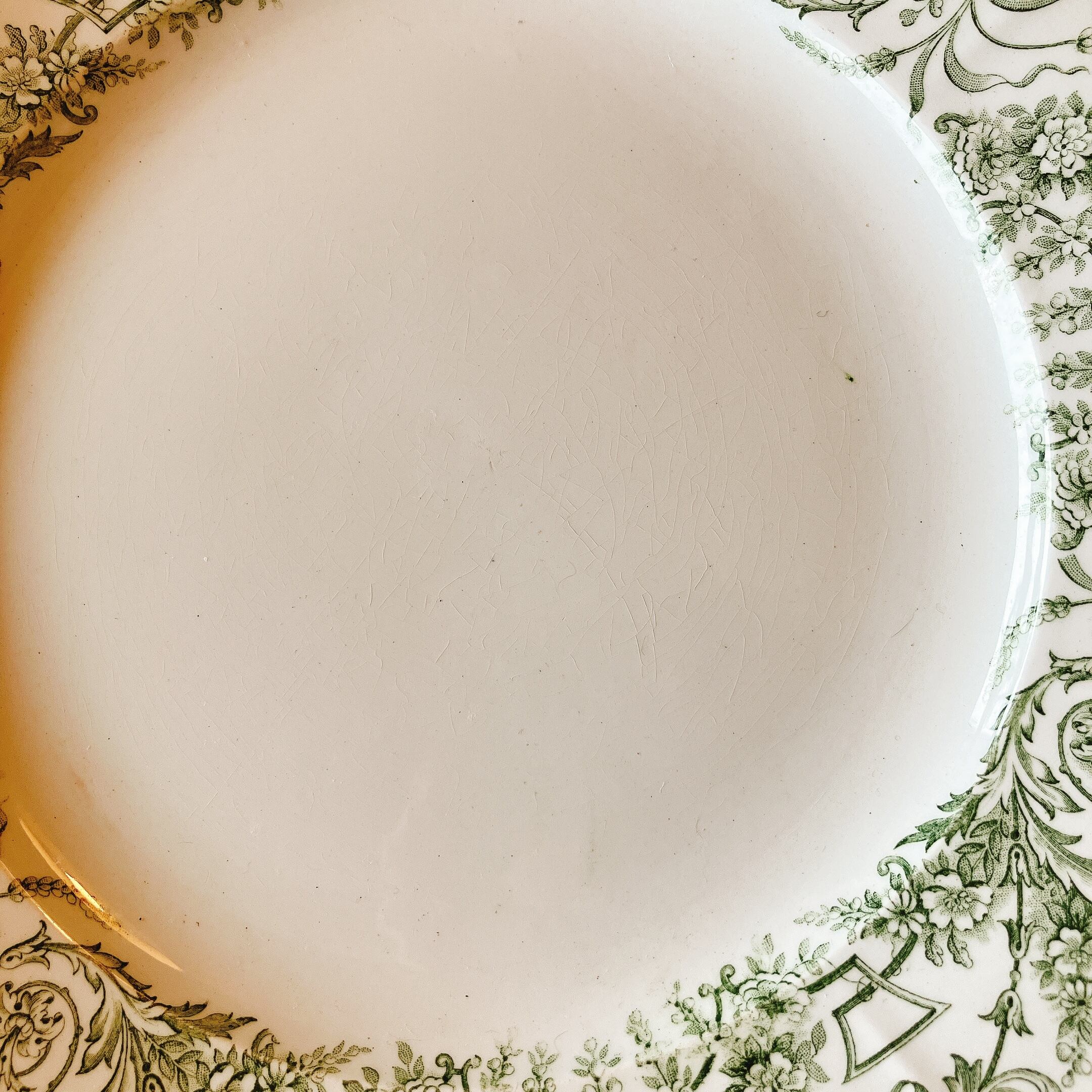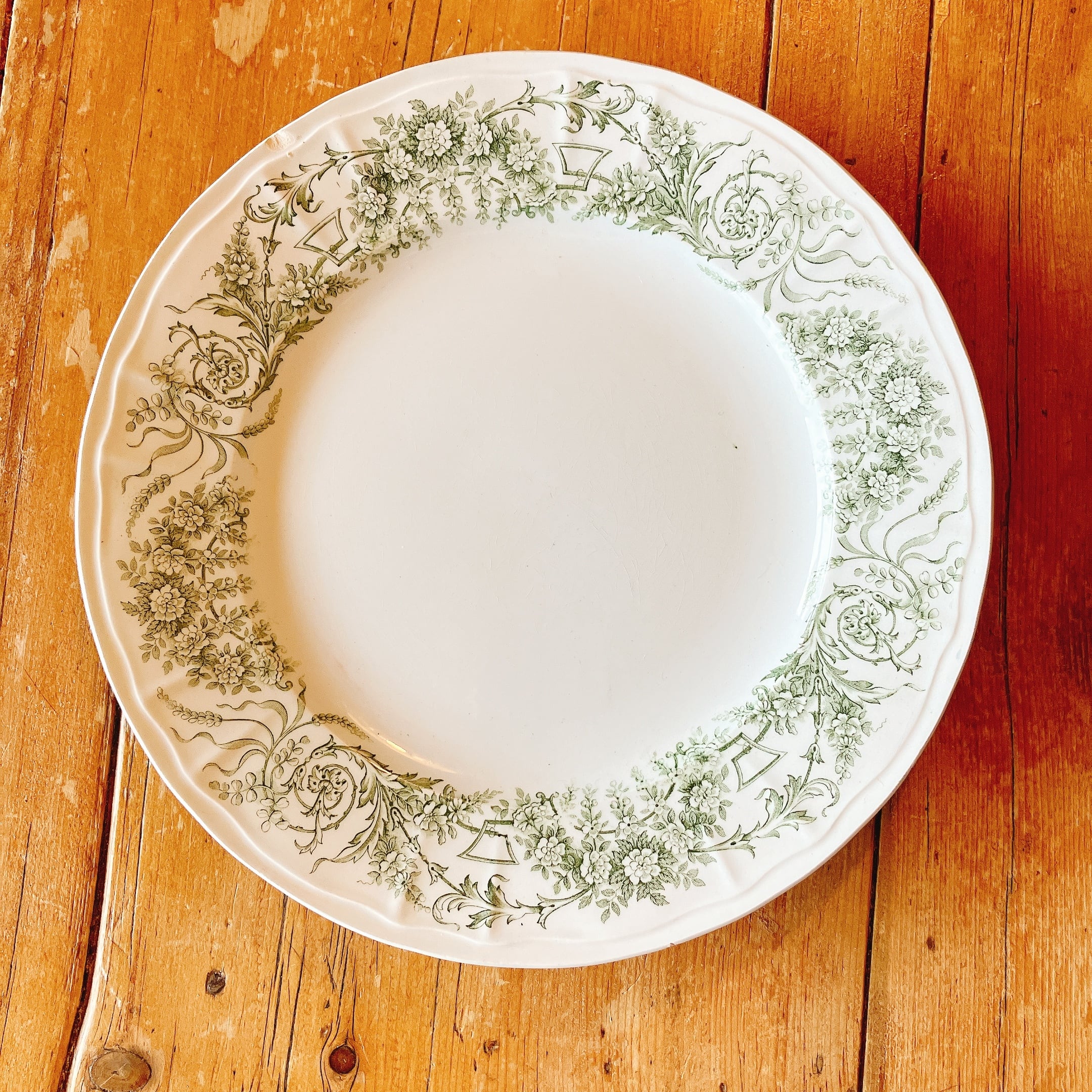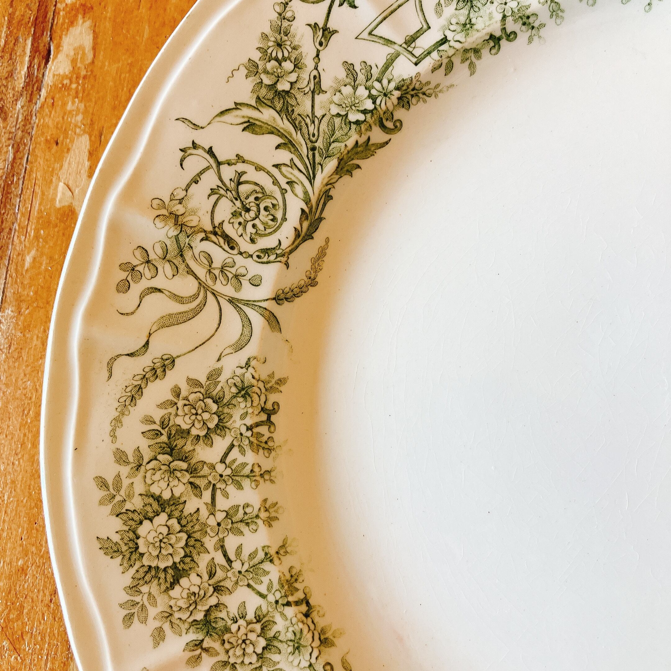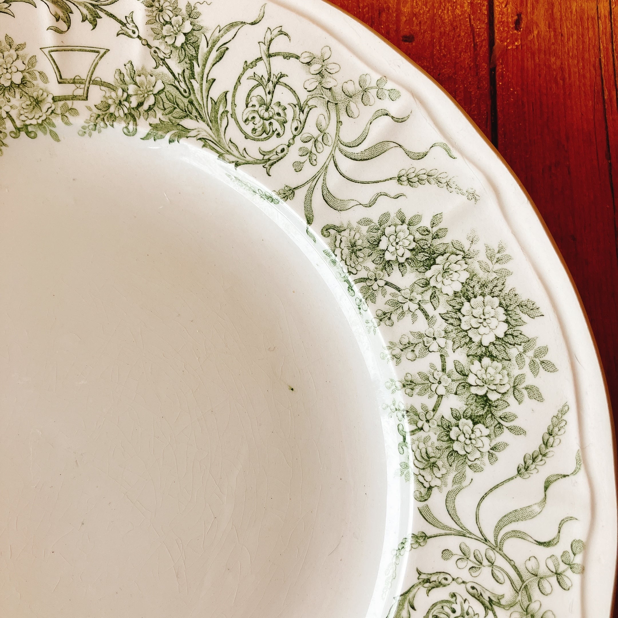 植物モチーフ柄が繊細で美しく描かれたディナープレート。フチにもレリーフが入って、グリーンも深い色が素敵です。