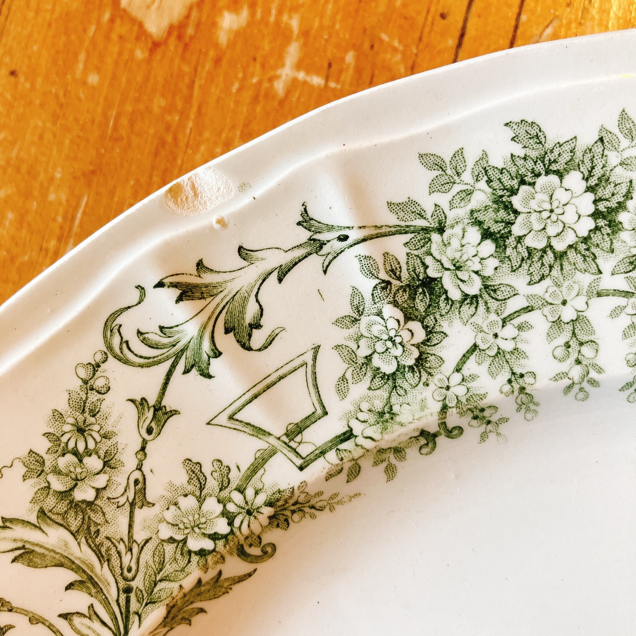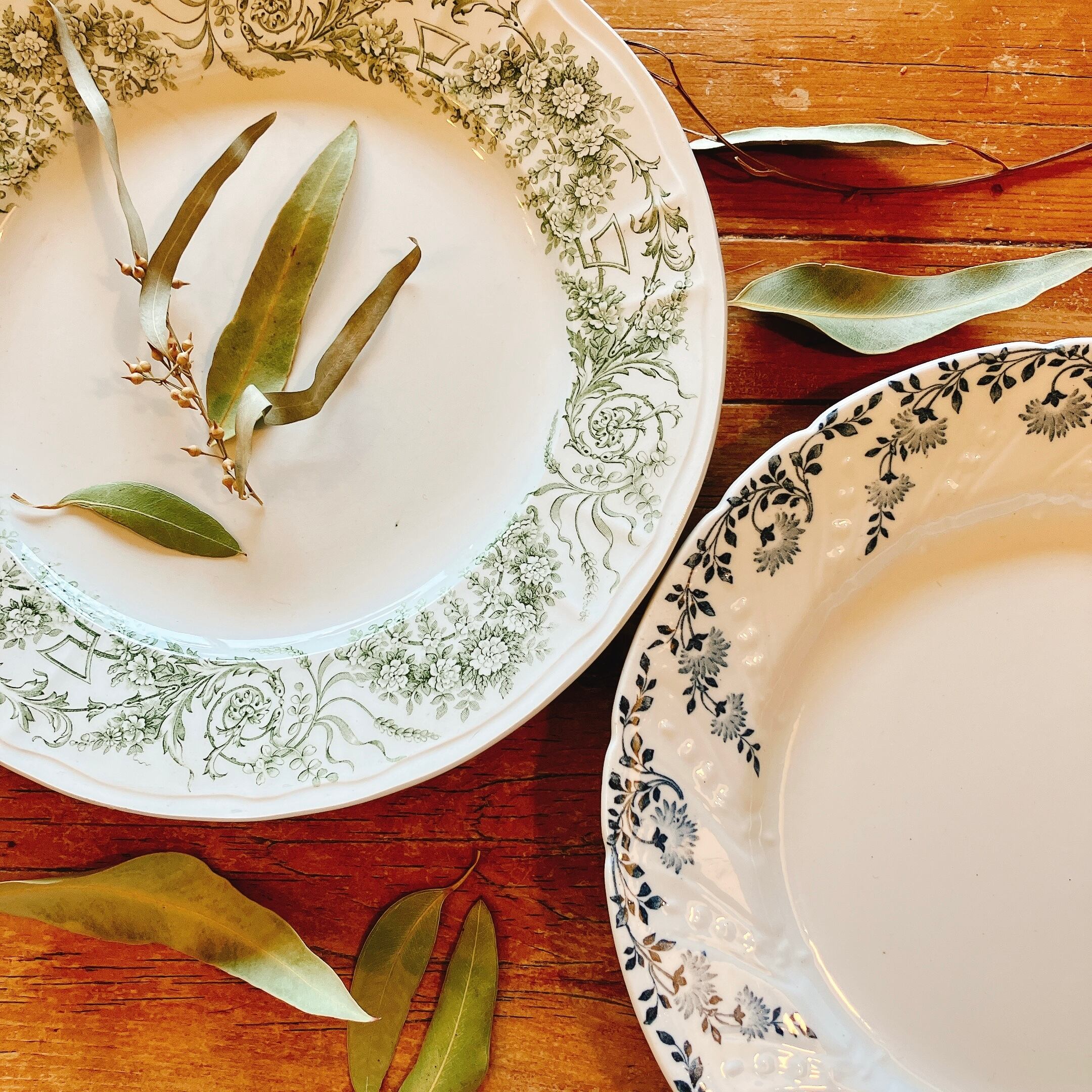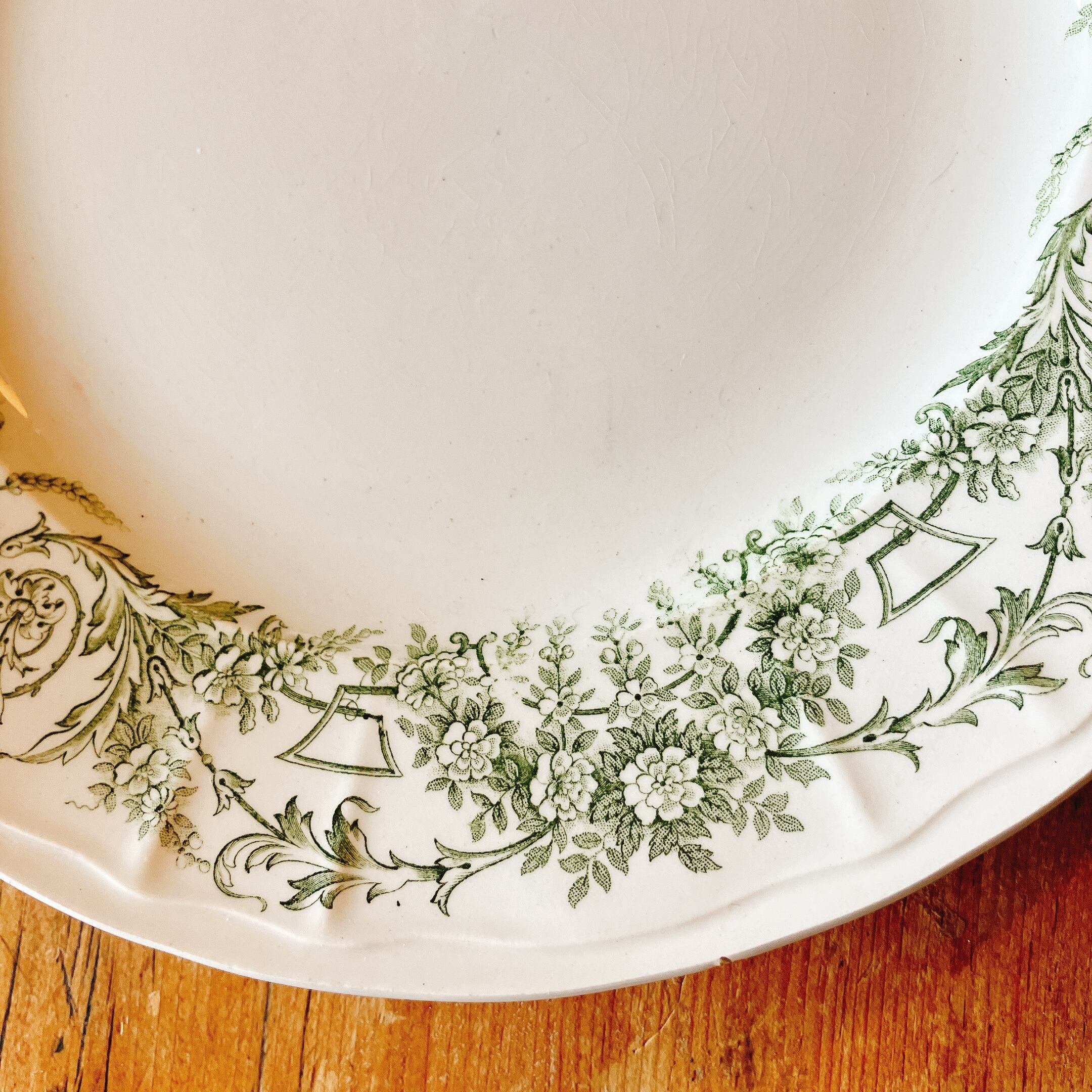 植物モチーフ柄が繊細で美しく描かれたディナープレート。フチにもレリーフが入って、グリーンも深い色が素敵です。