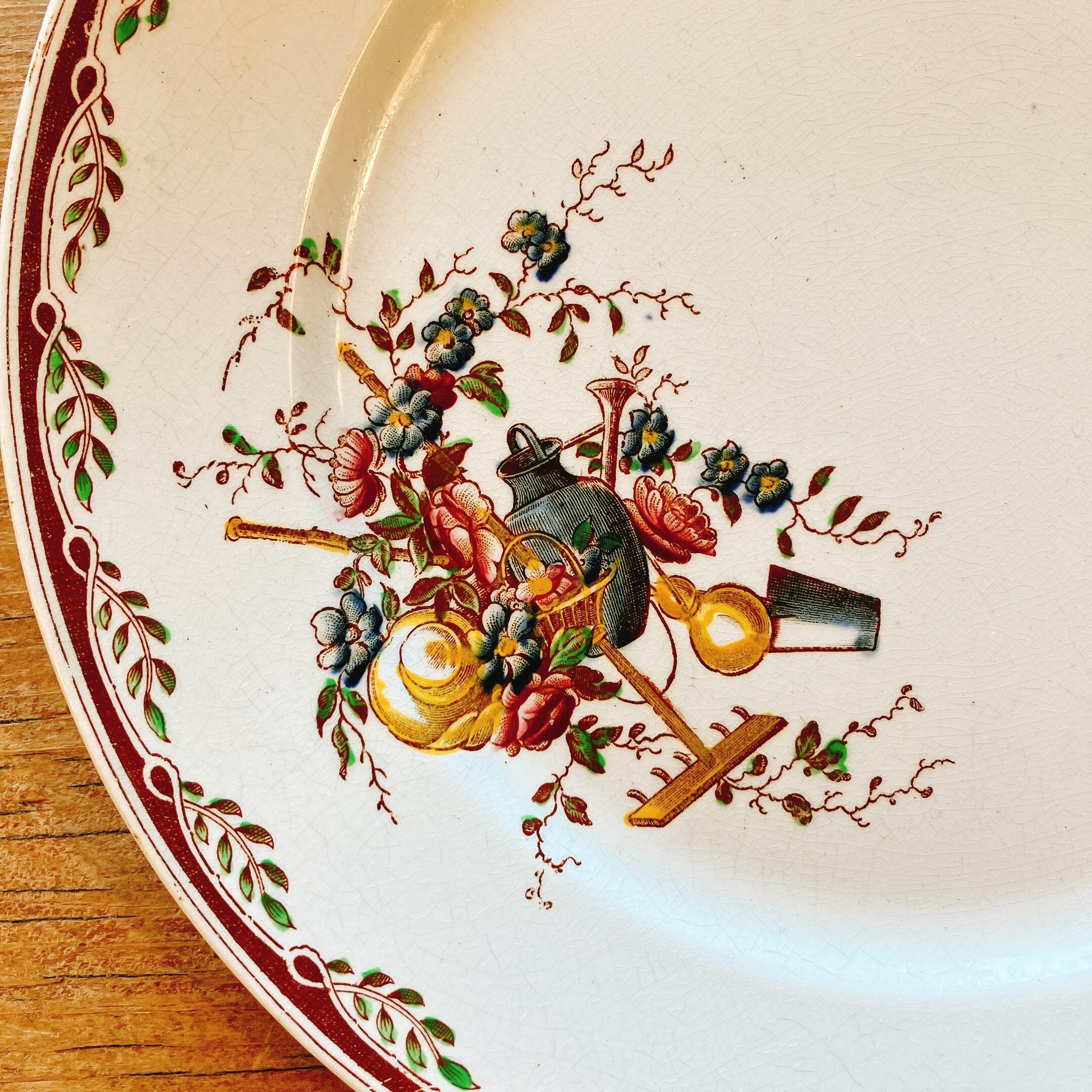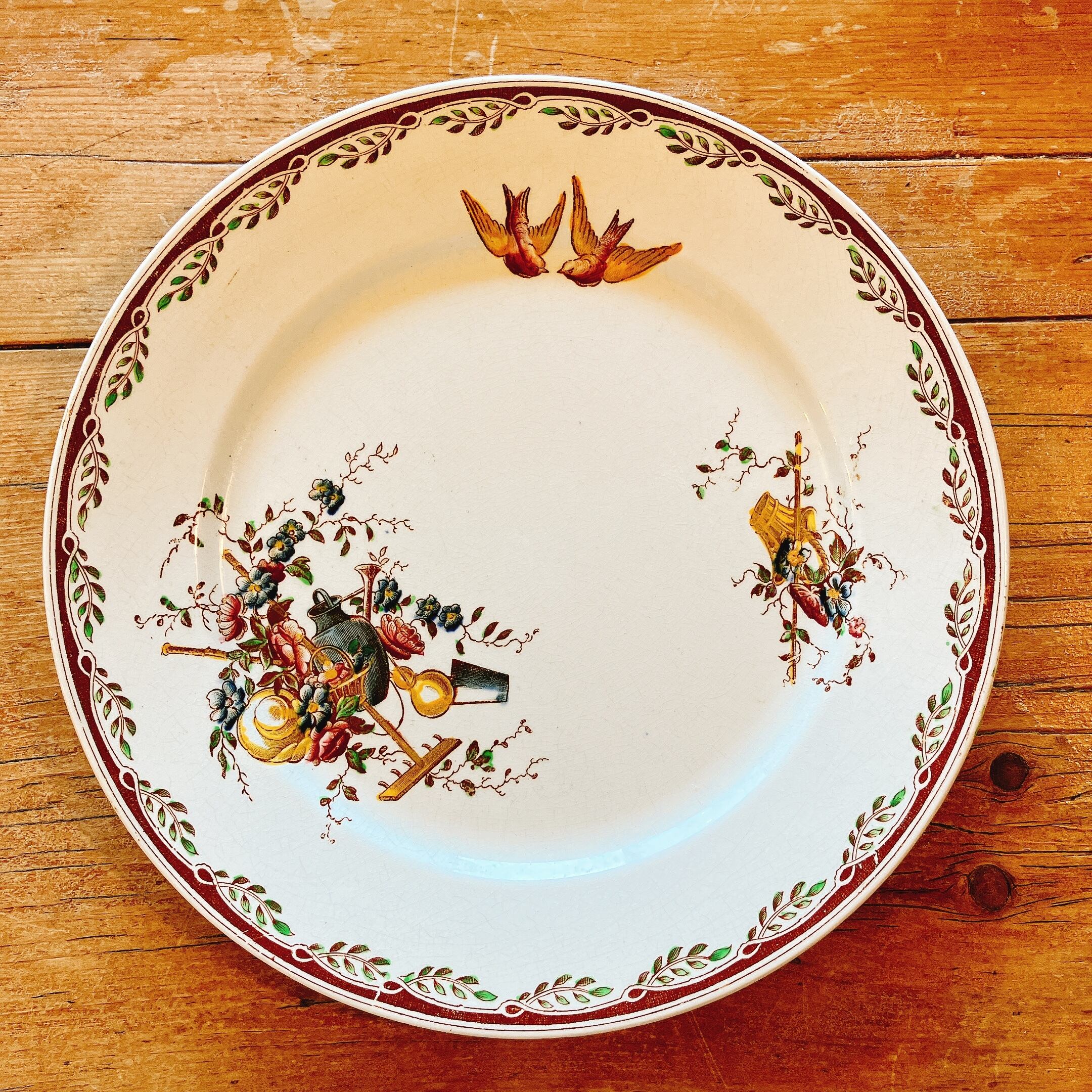 ガーデンツールと花や鳥が美しい色彩で描かれたディナープレート。