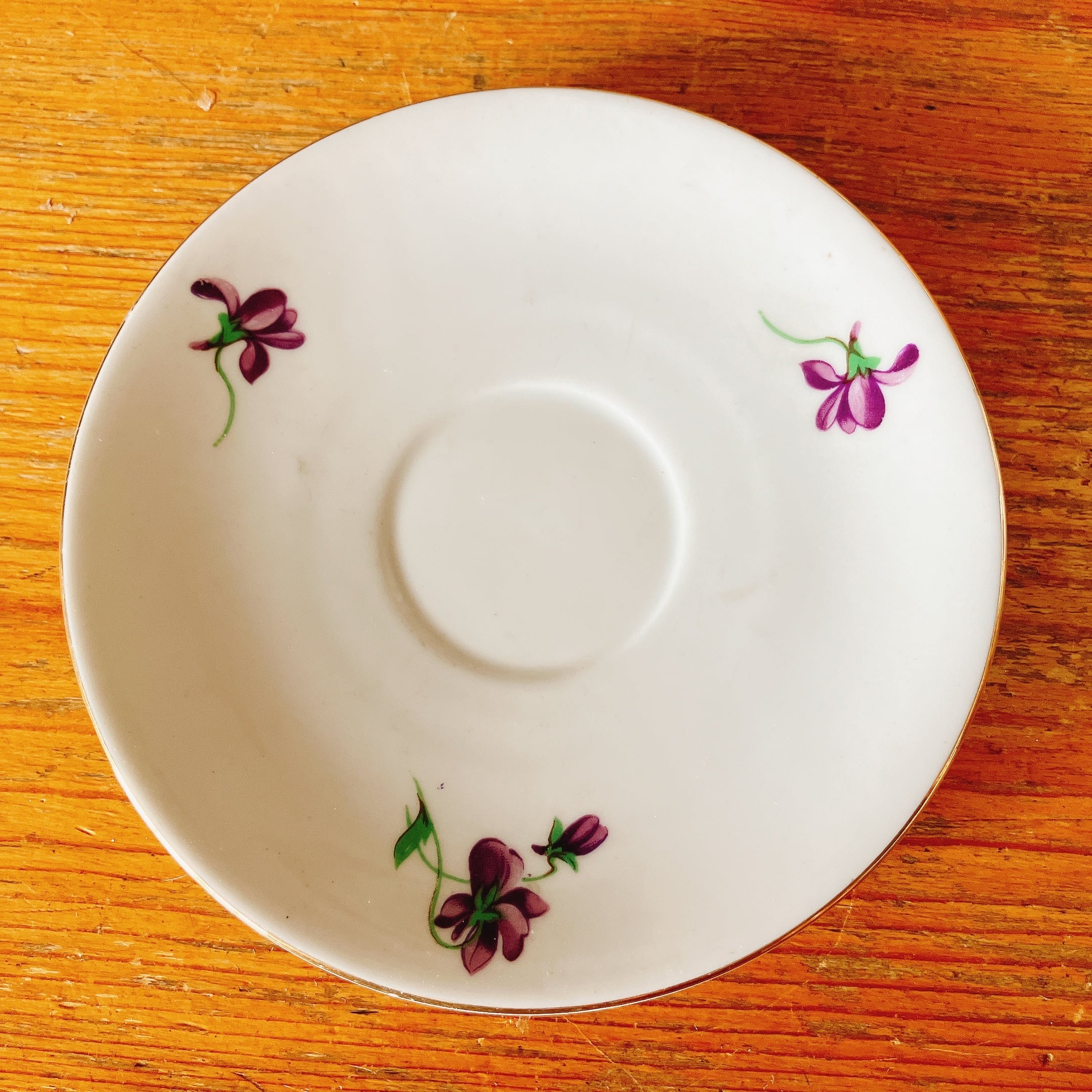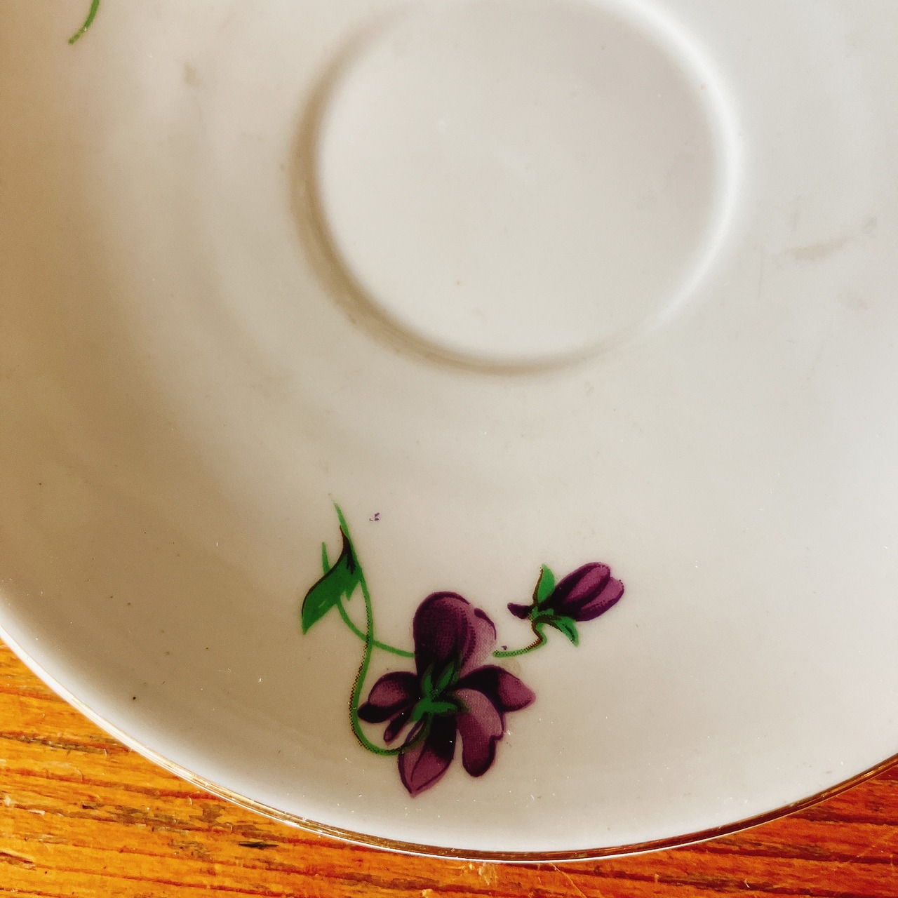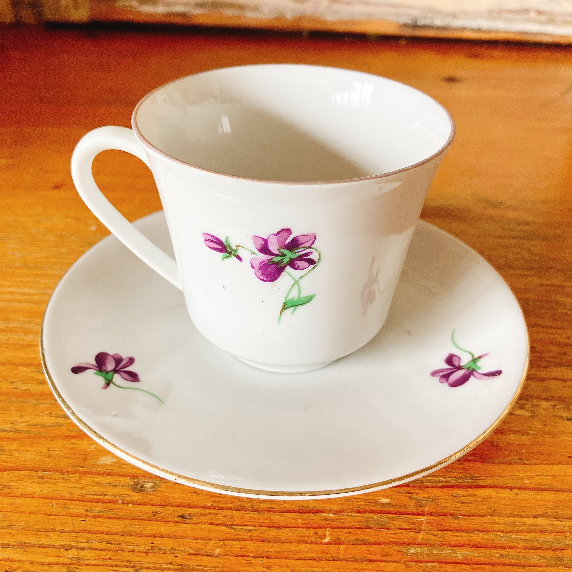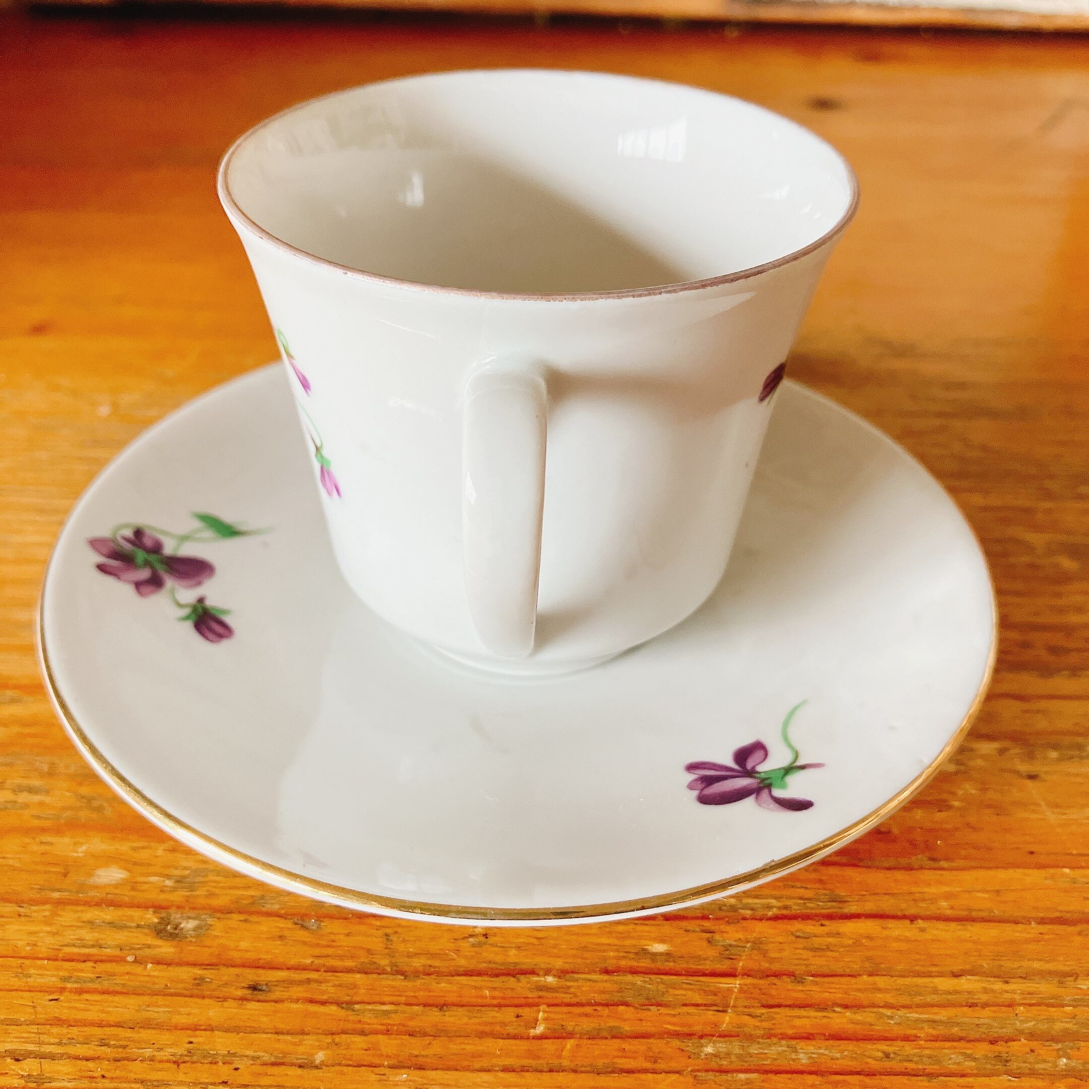 可愛いスミレが描かれた小さめカップ&ソーサーです。フチには金彩があります。