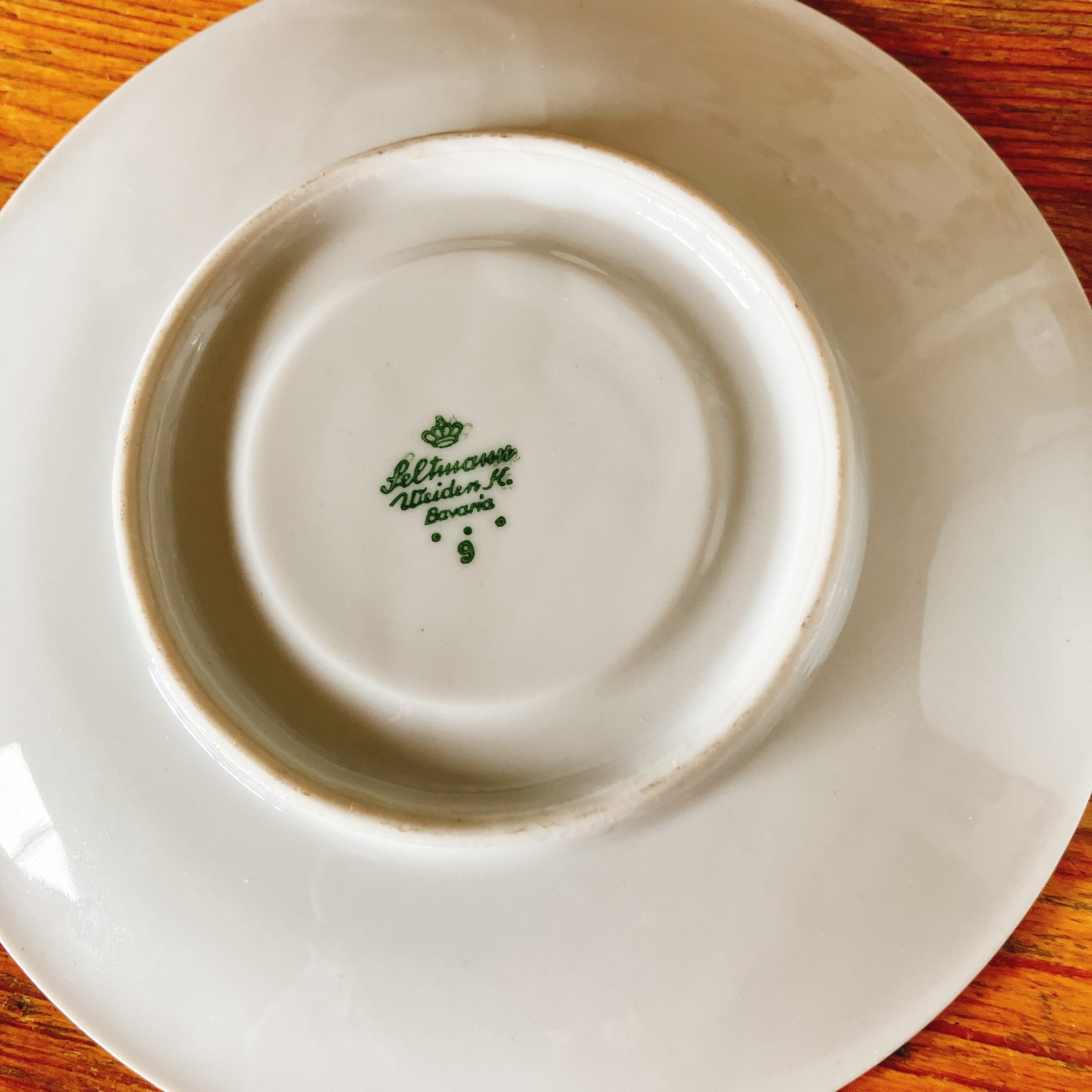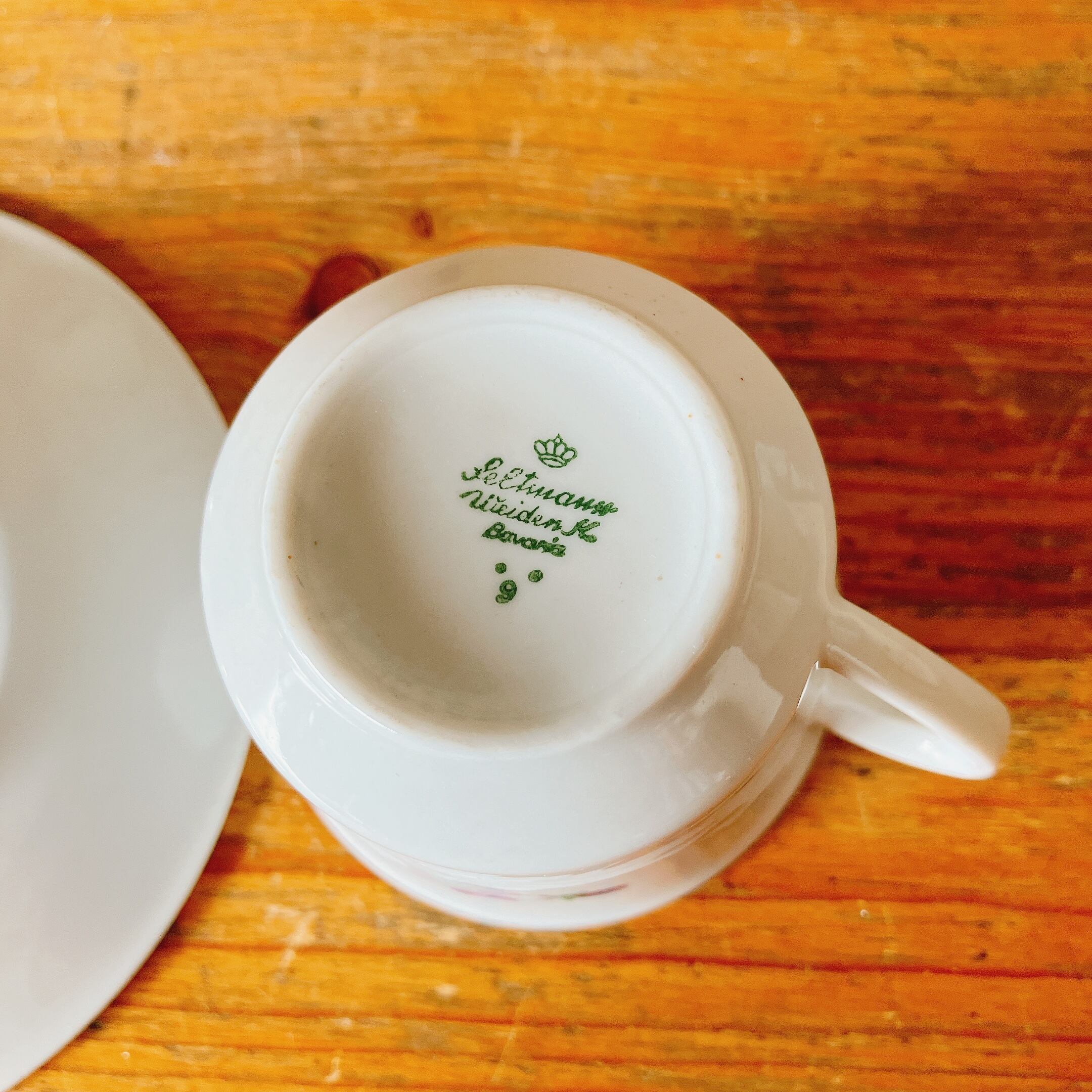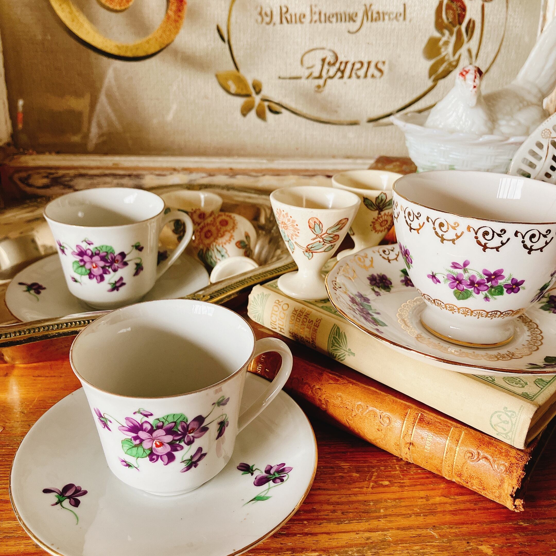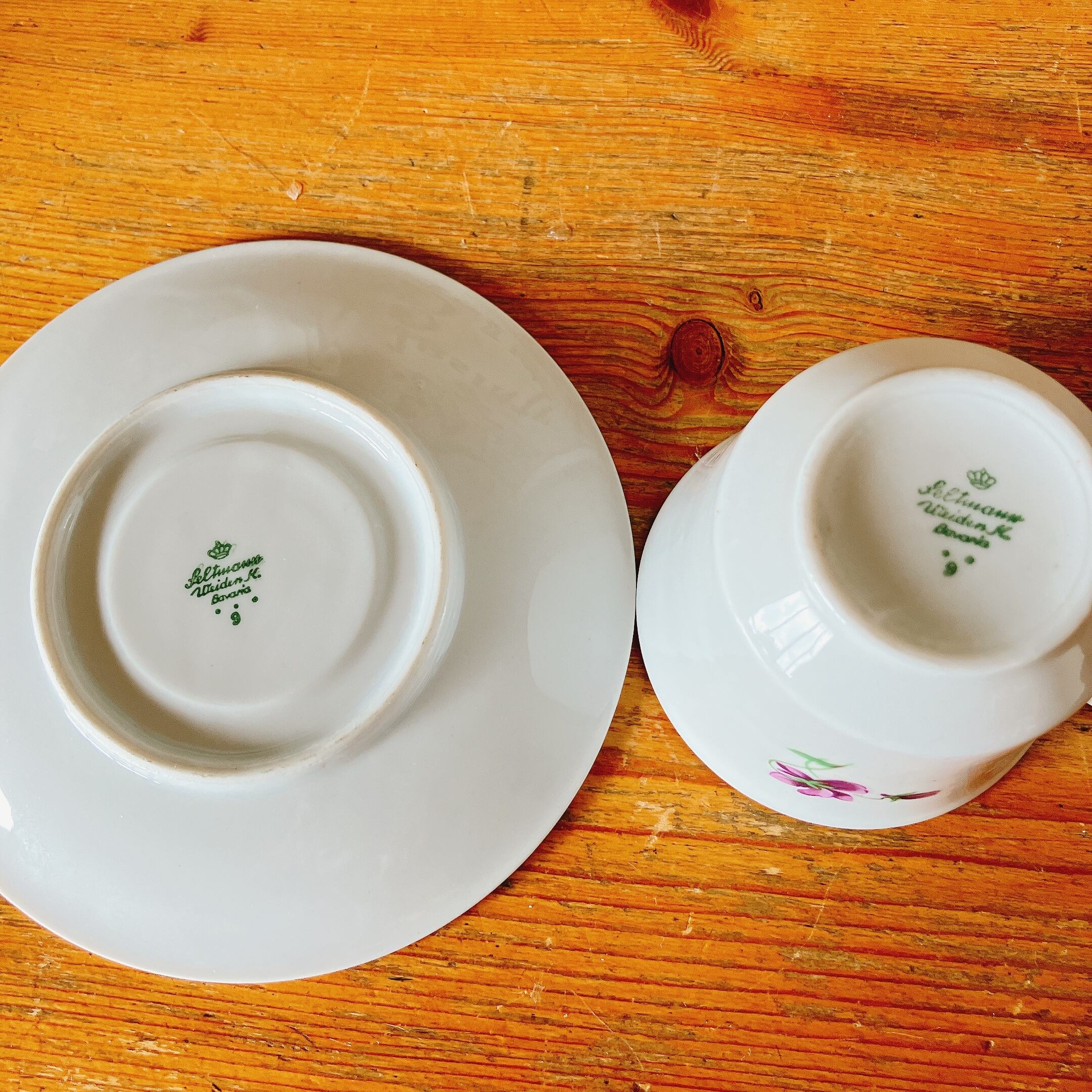 可愛いスミレが描かれた小さめカップ&ソーサーです。フチには金彩があります。