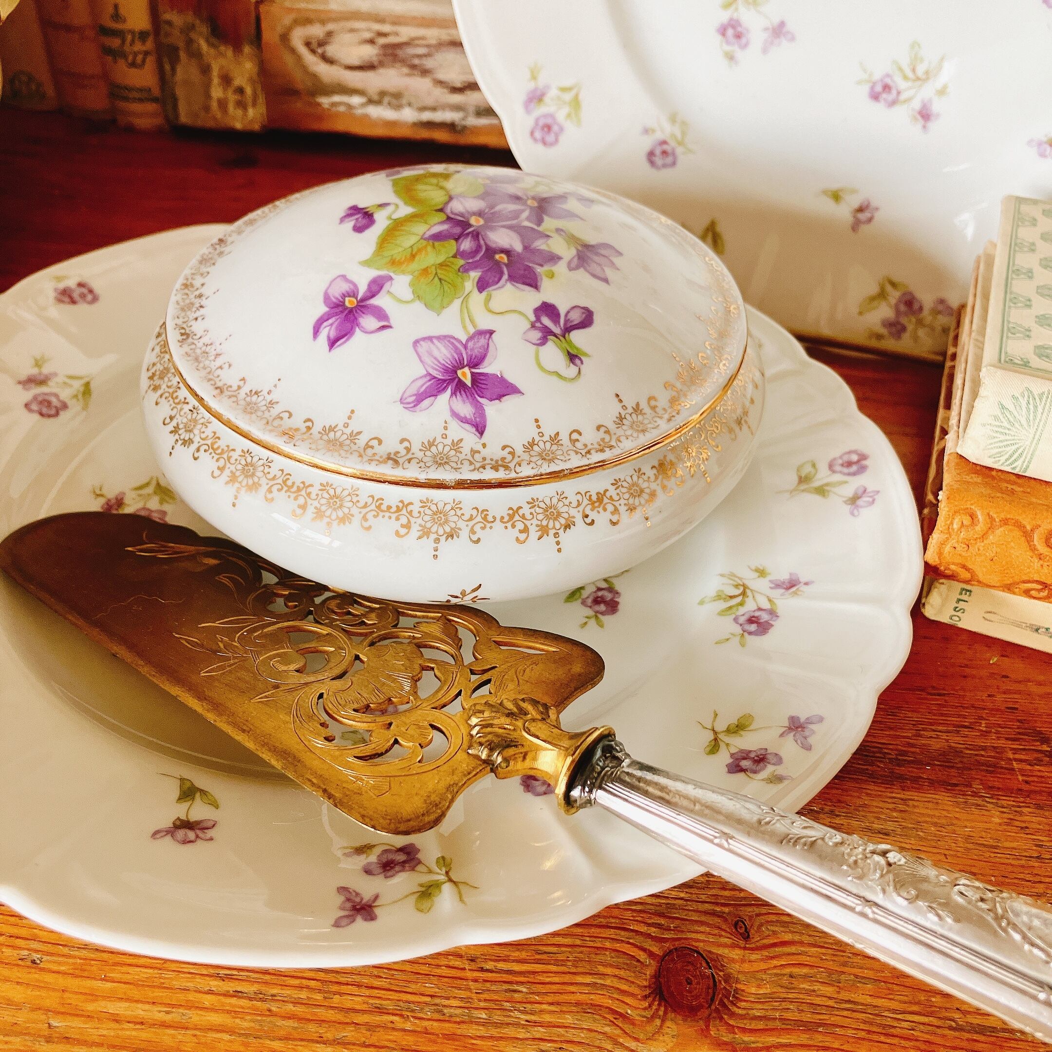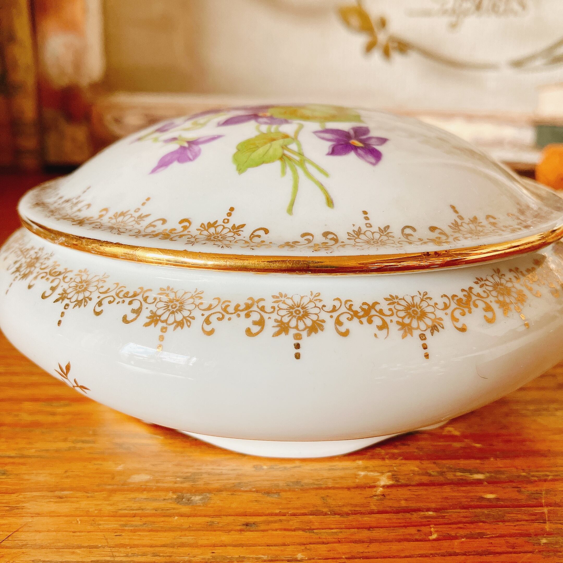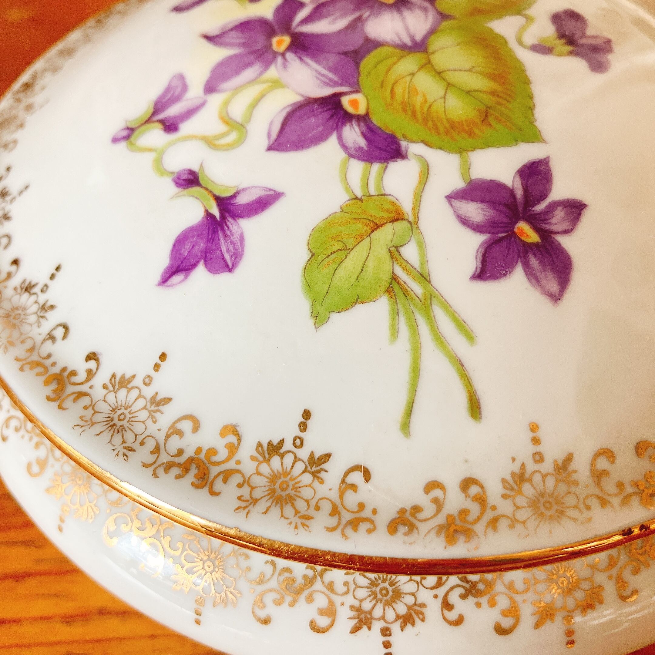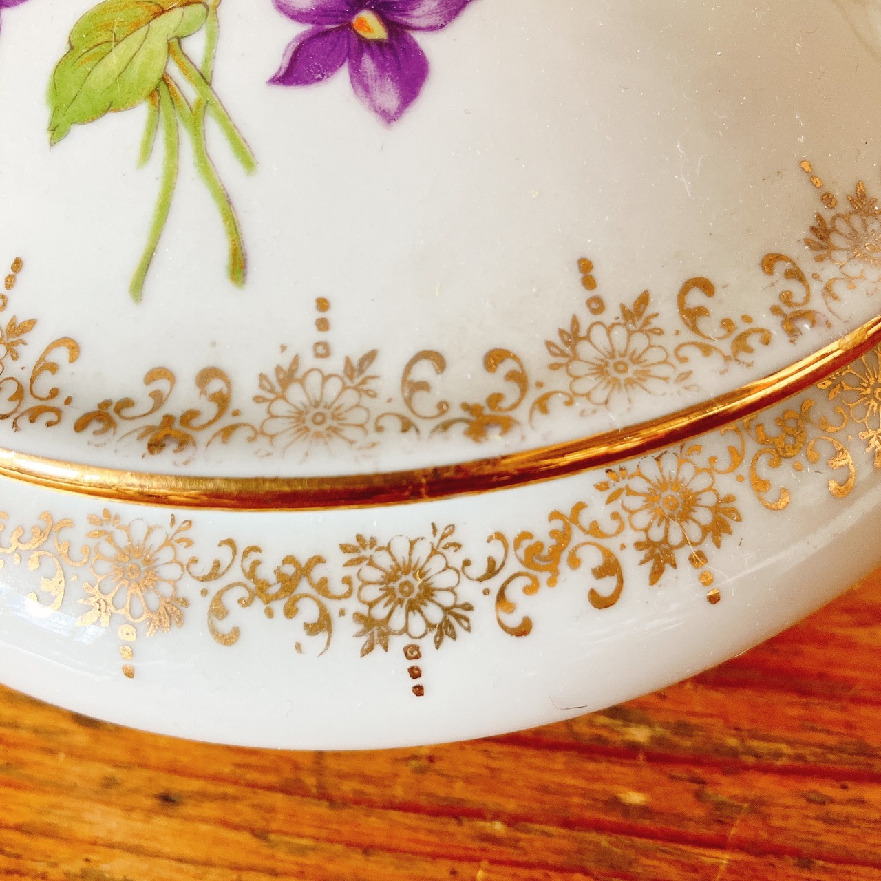 中央のスミレを細かい金彩が取り囲み,足の部分には波打つようなデザインが施されていて、華やかでエレガントな印象です。