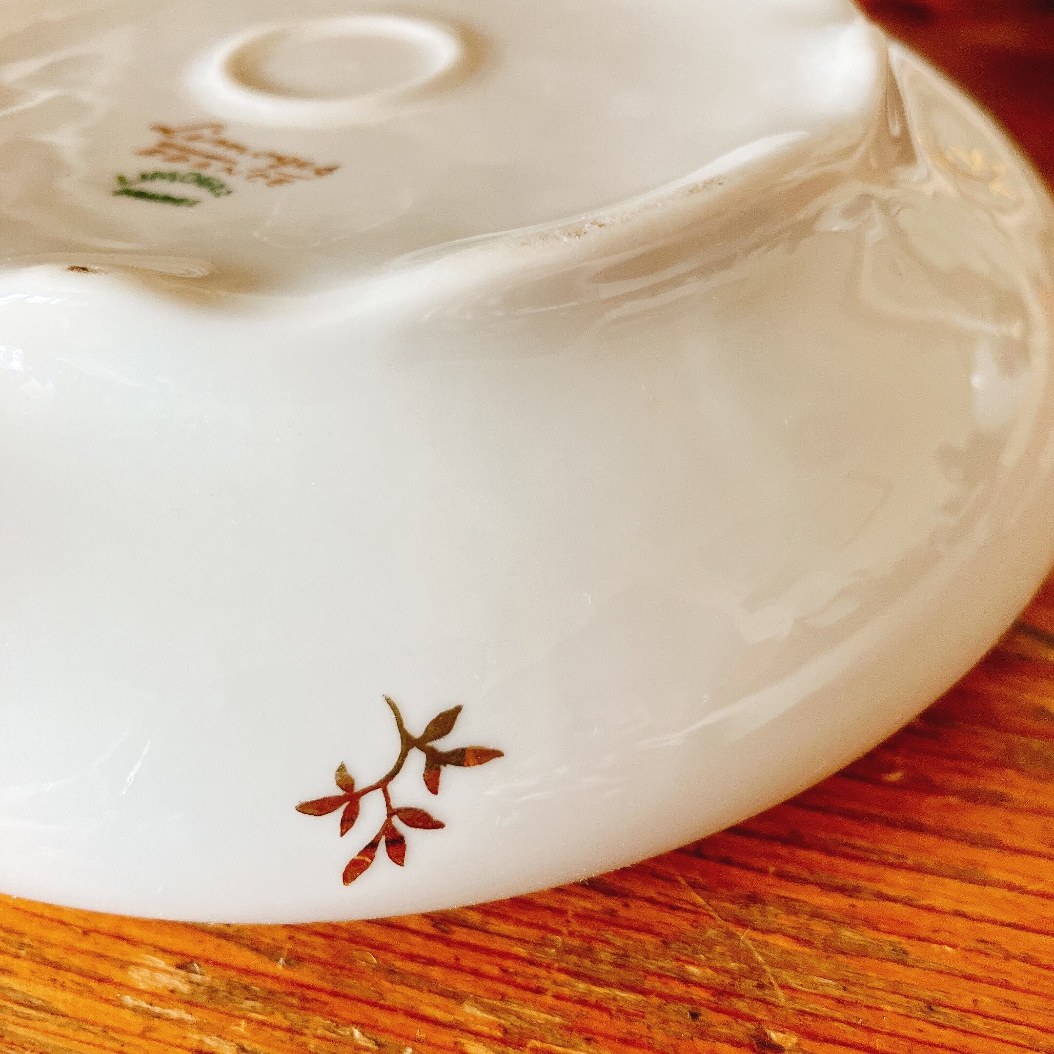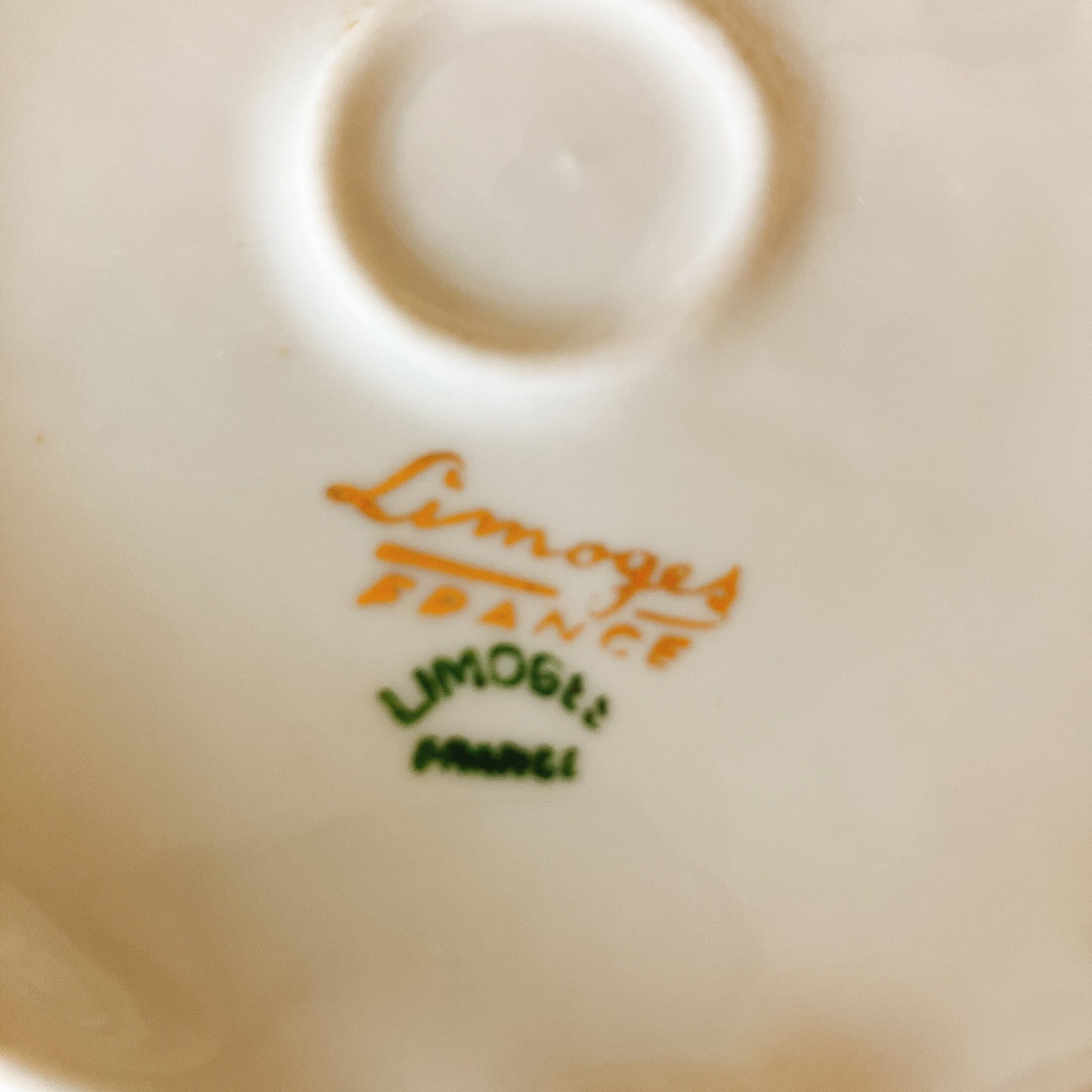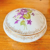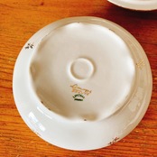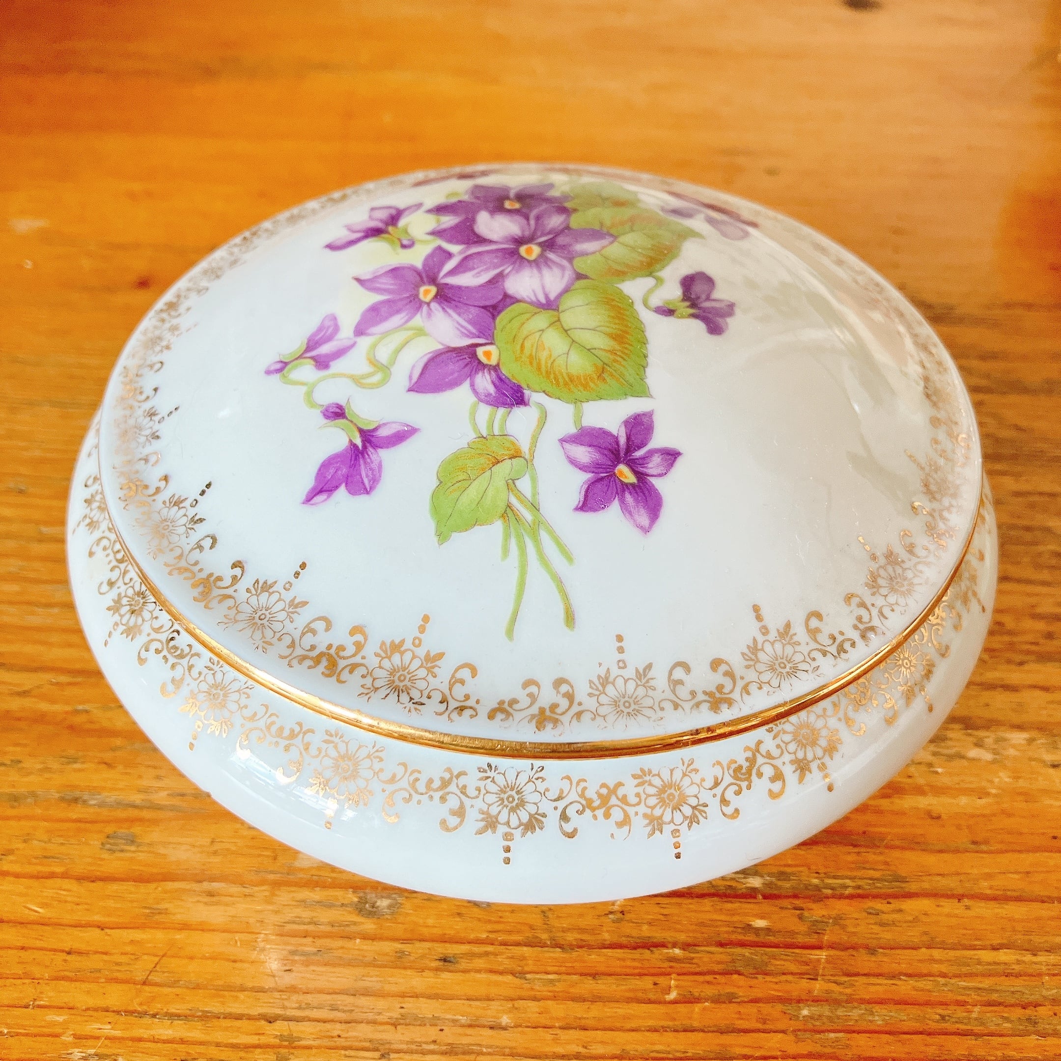中央のスミレを細かい金彩が取り囲み,足の部分には波打つようなデザインが施されていて、華やかでエレガントな印象です。