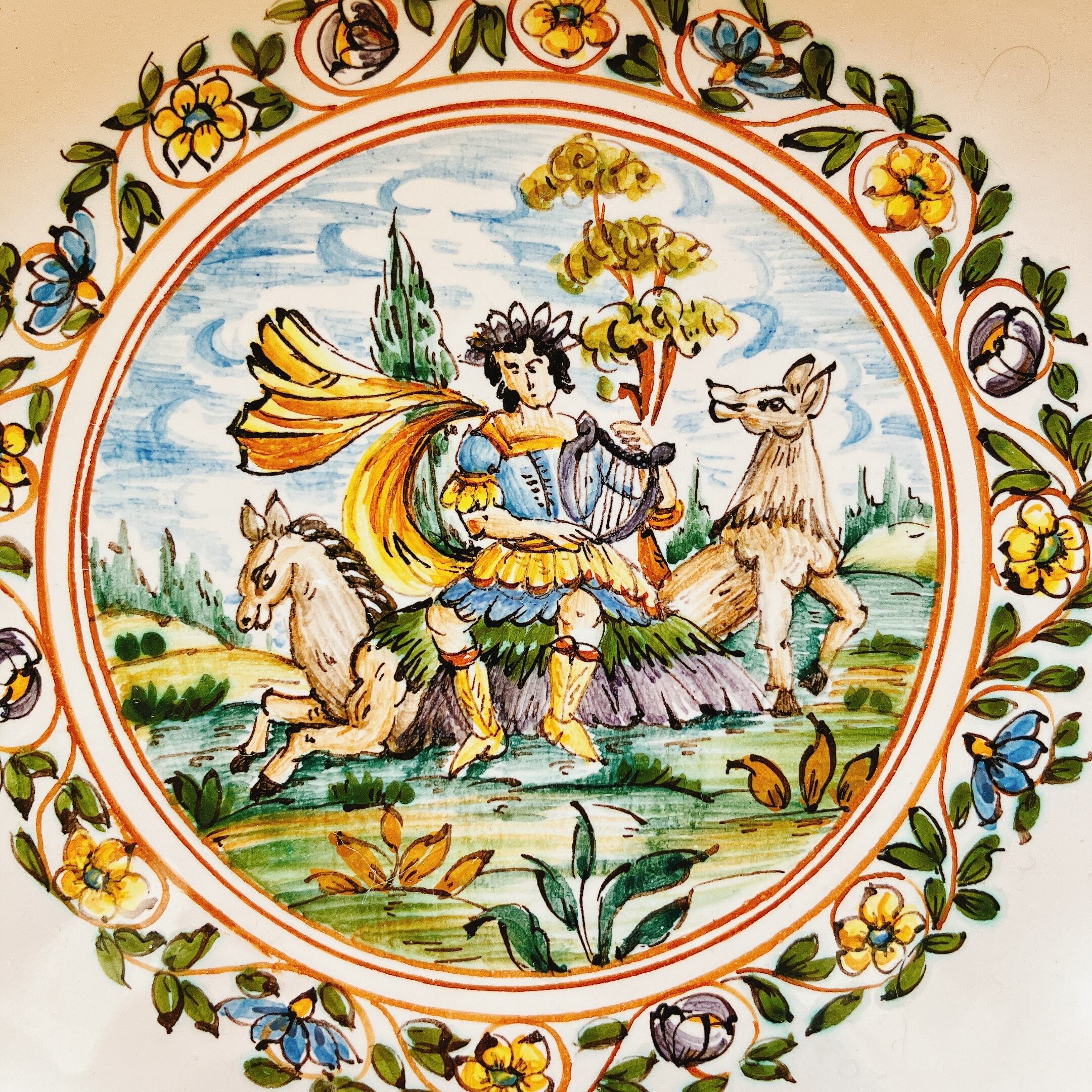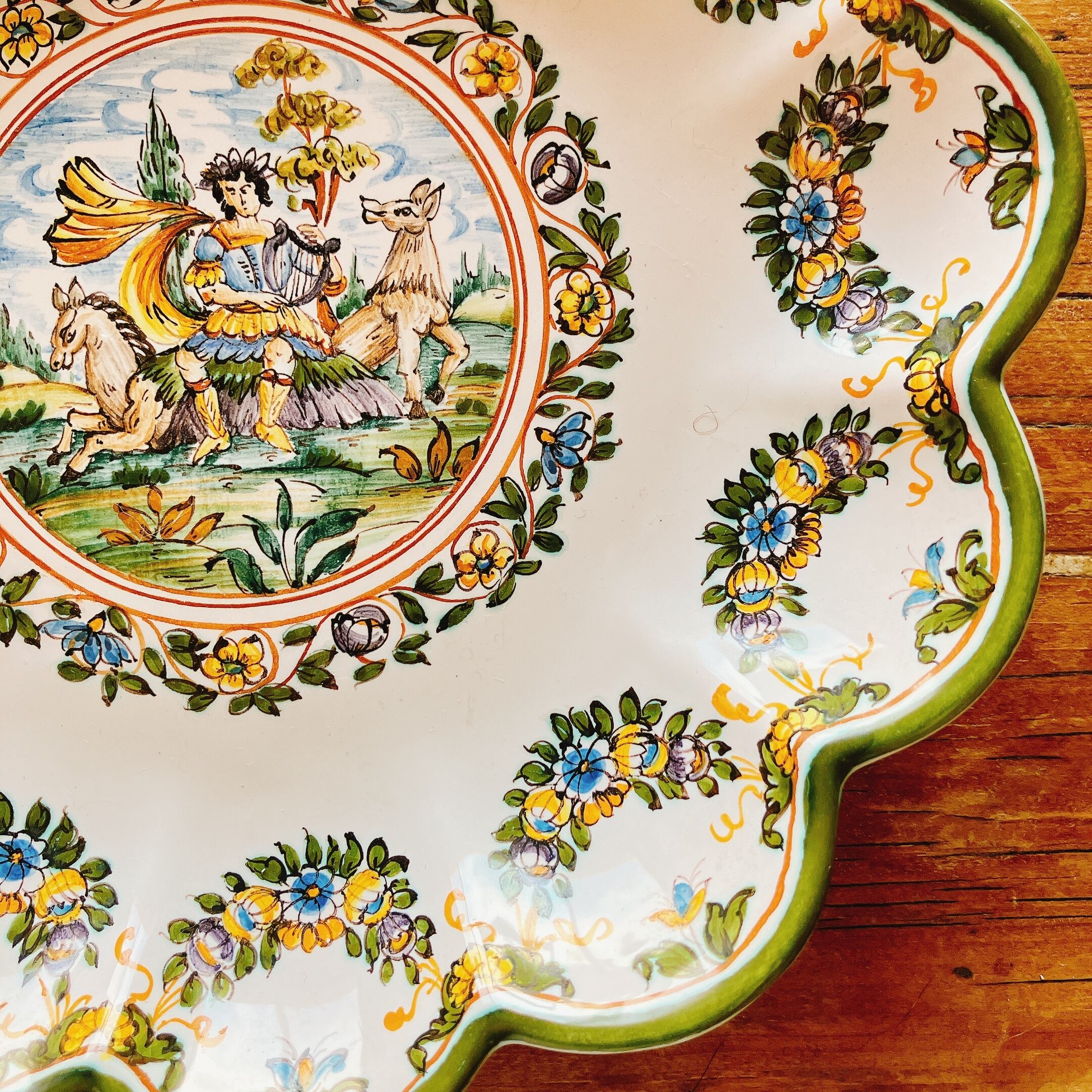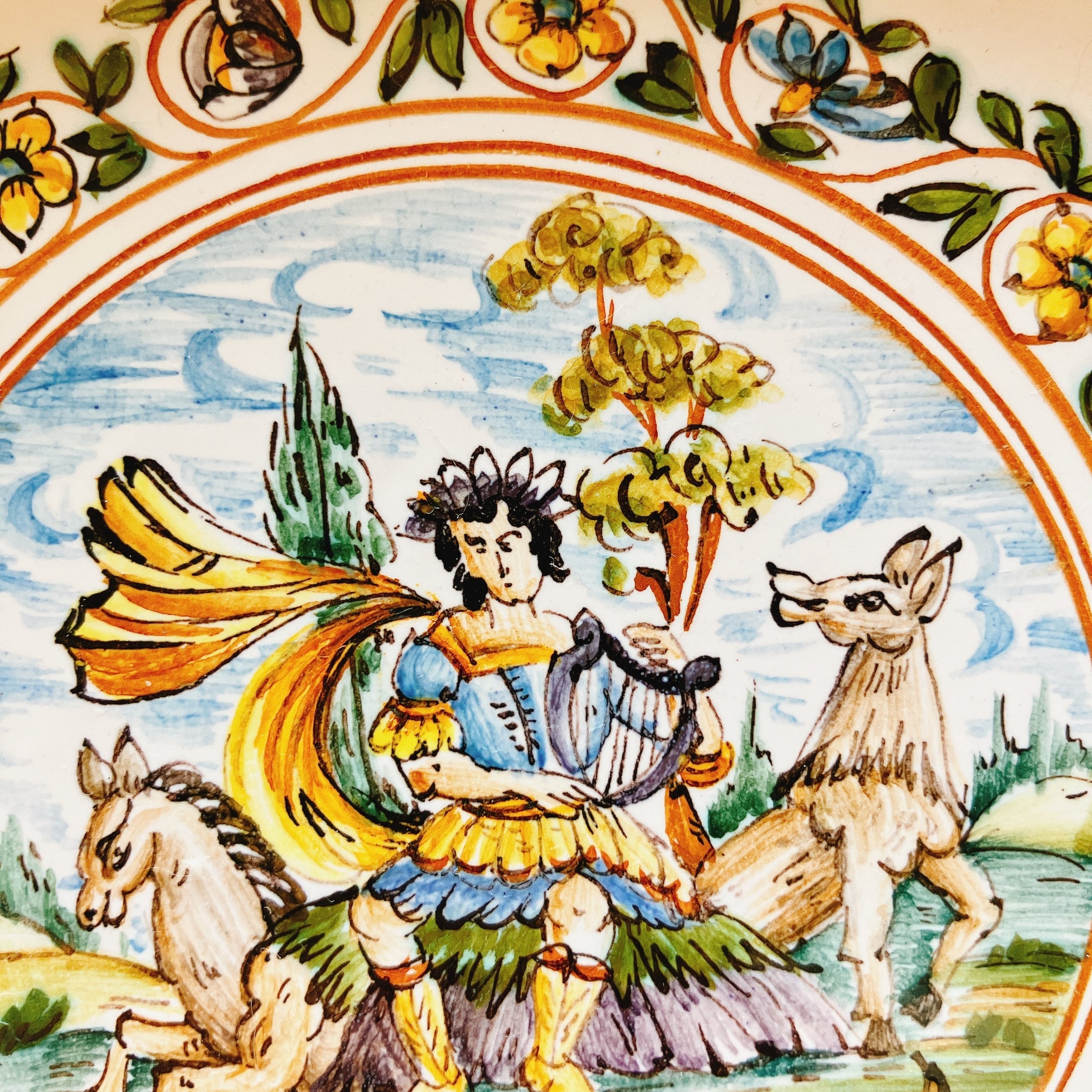 カラフルな色彩で竪琴を弾く人や馬などが描かれた素敵なお皿です。