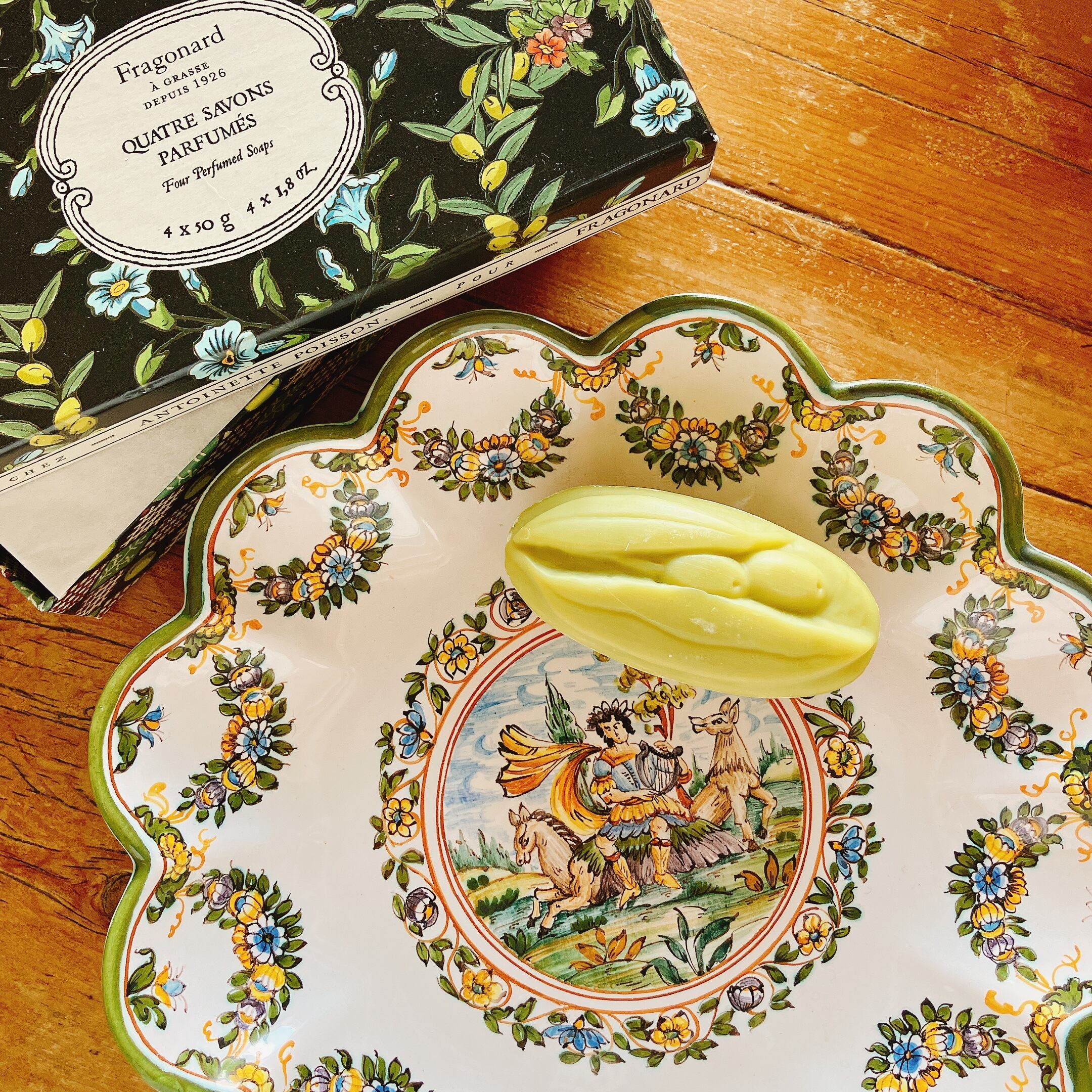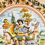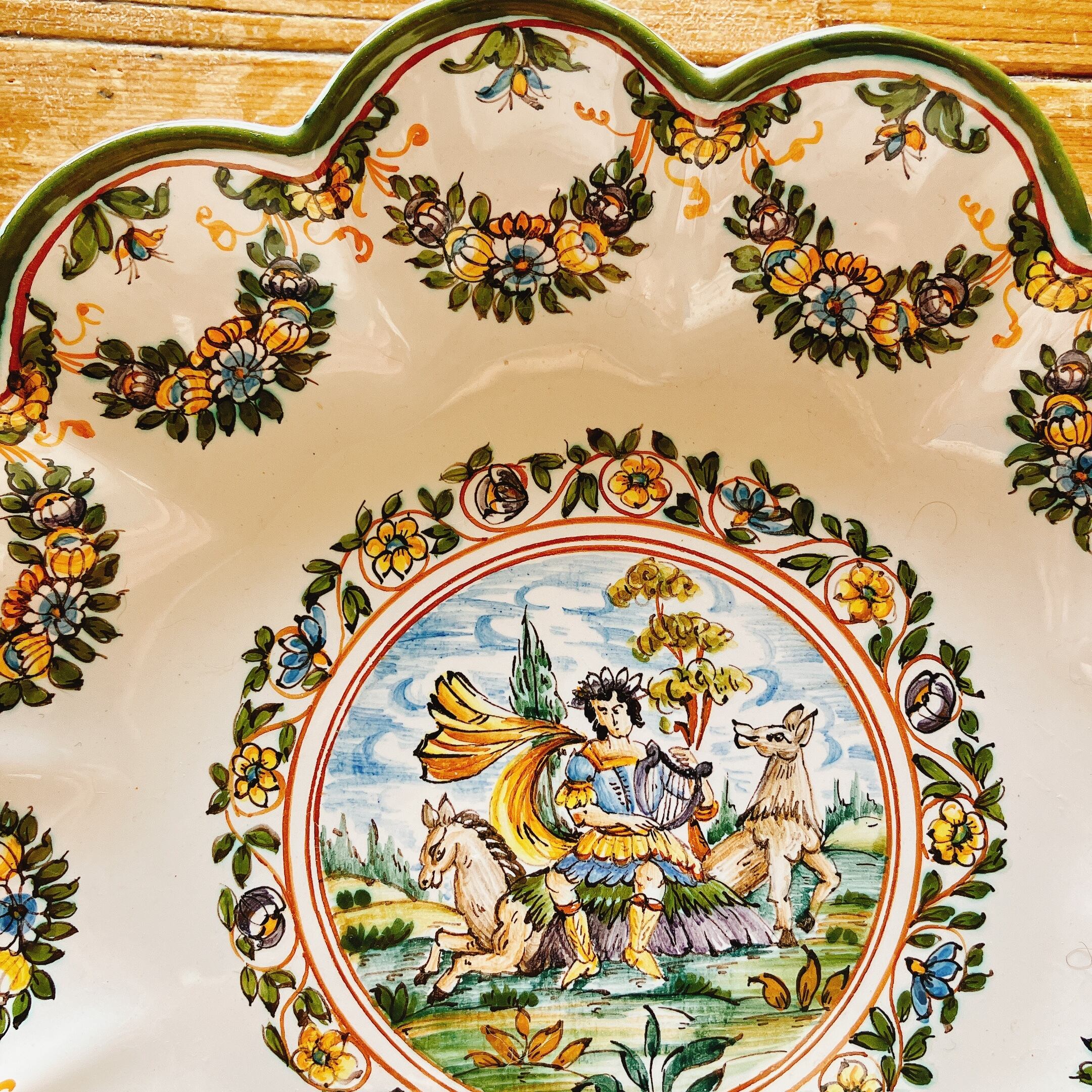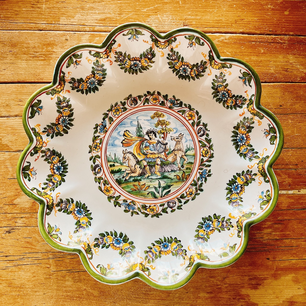 カラフルな色彩で竪琴を弾く人や馬などが描かれた素敵なお皿です。