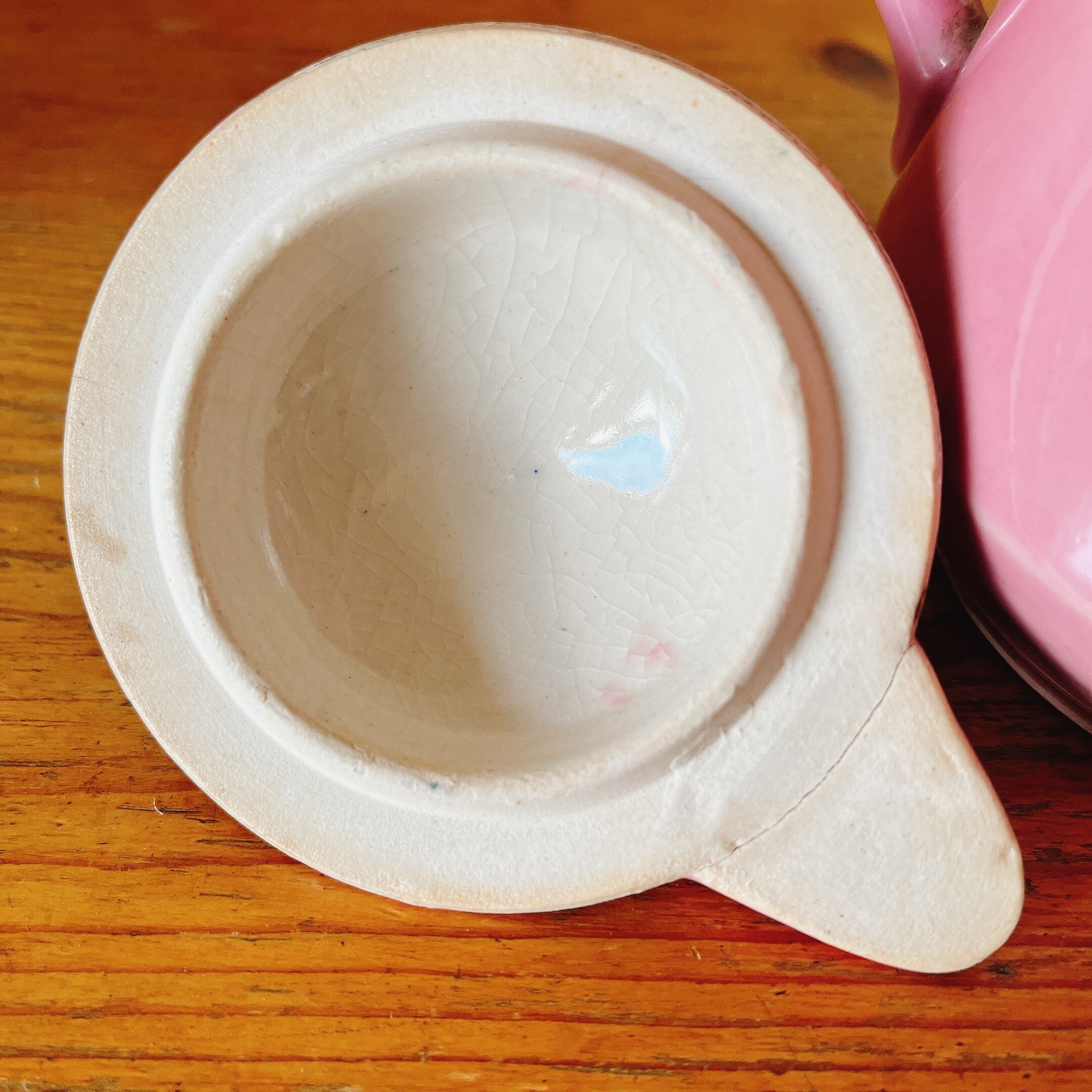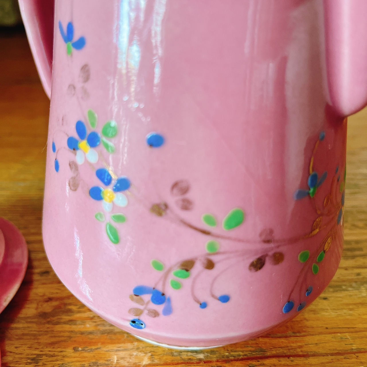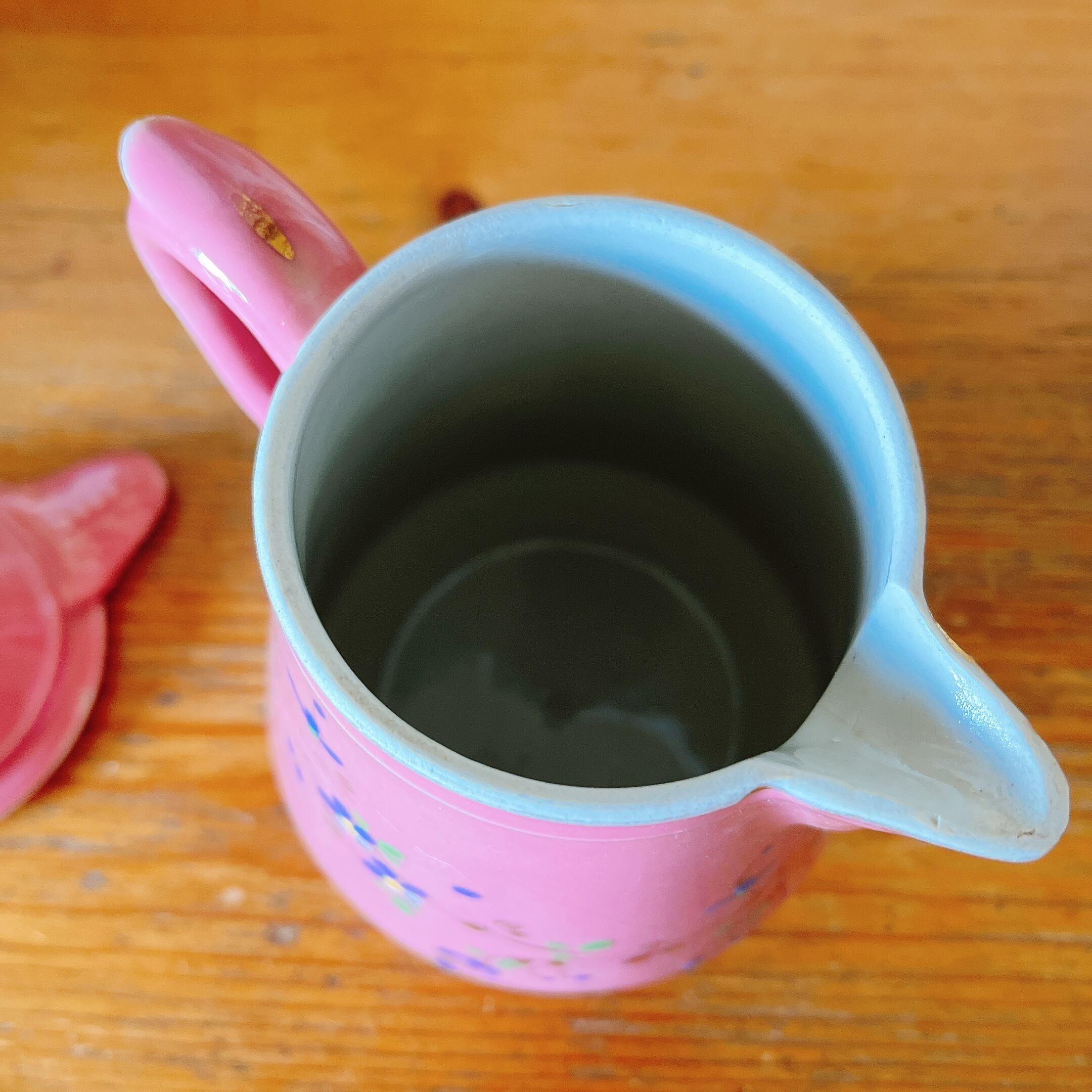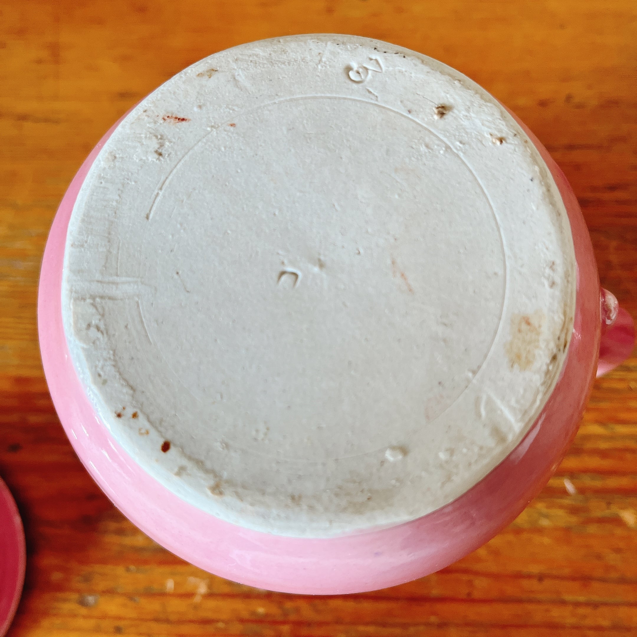サンチューズの食器は、白地にブルーの柄が有名ですが、ピンク地にカラフルな色の絵柄はレアだと思います。