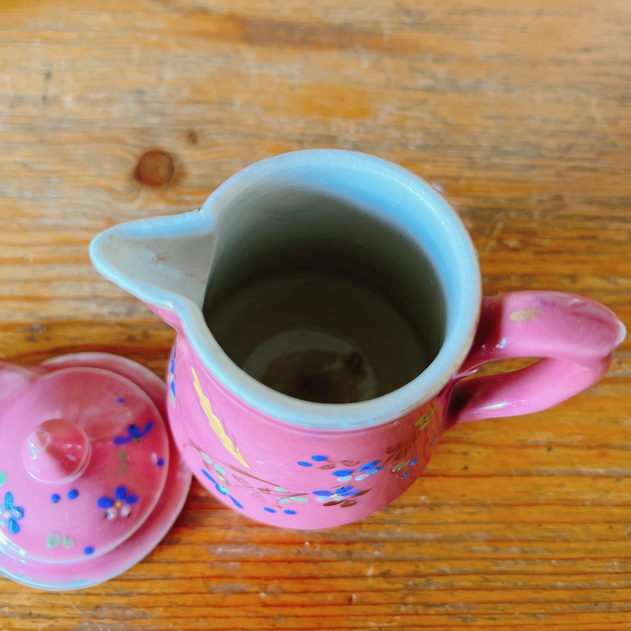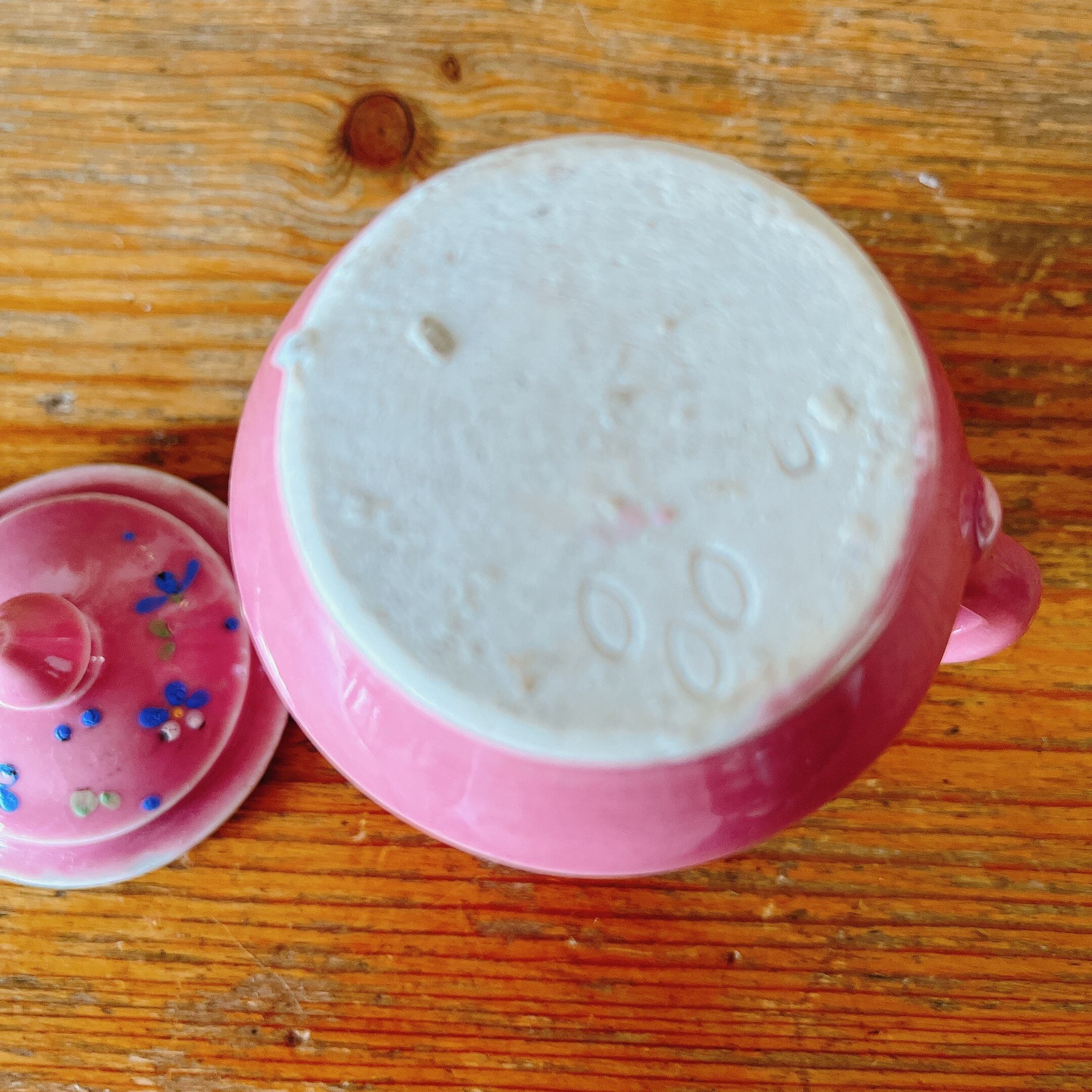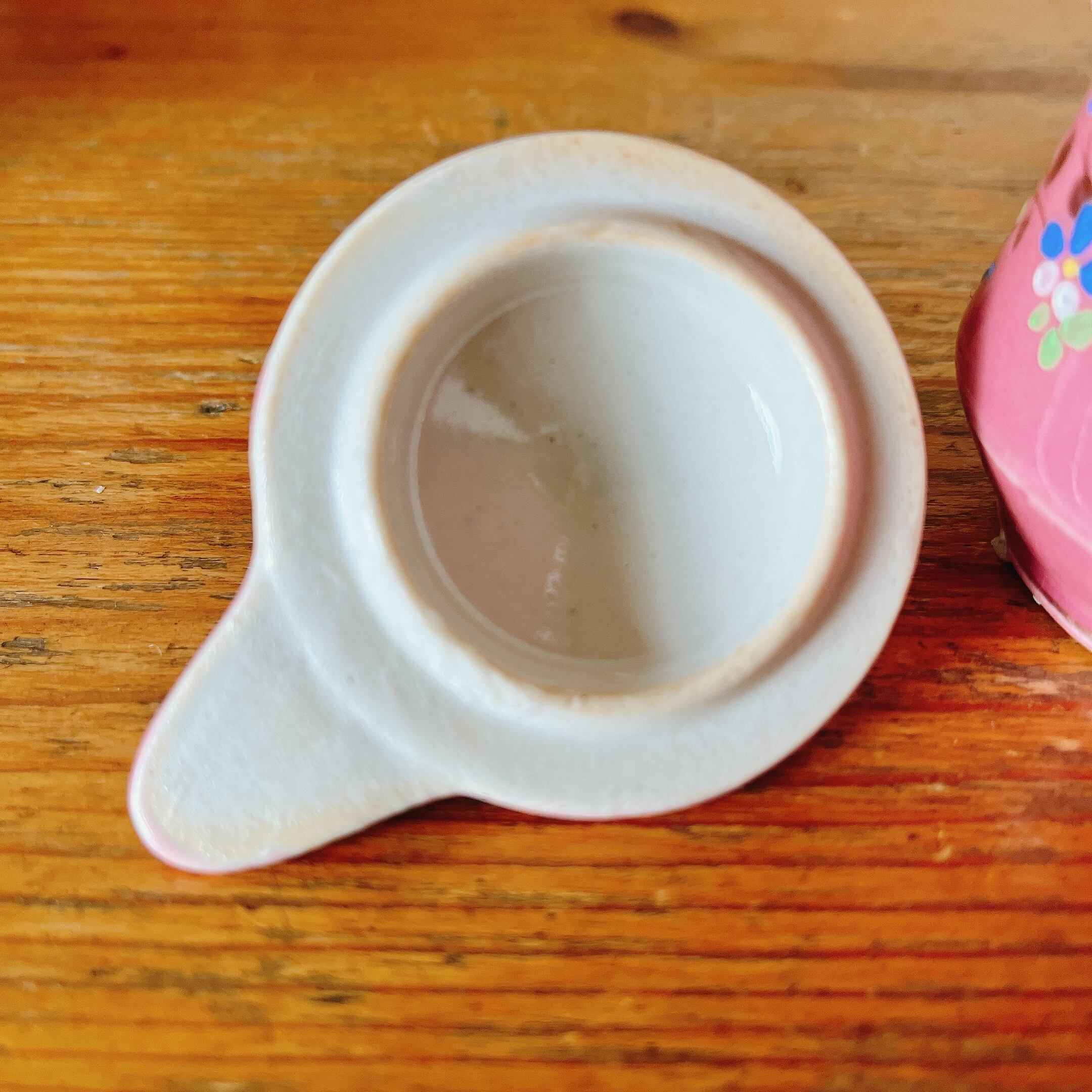 サンチューズの食器は、白地にブルーの柄が有名ですが、ピンク地にカラフルな色の絵柄はレアだと思います。