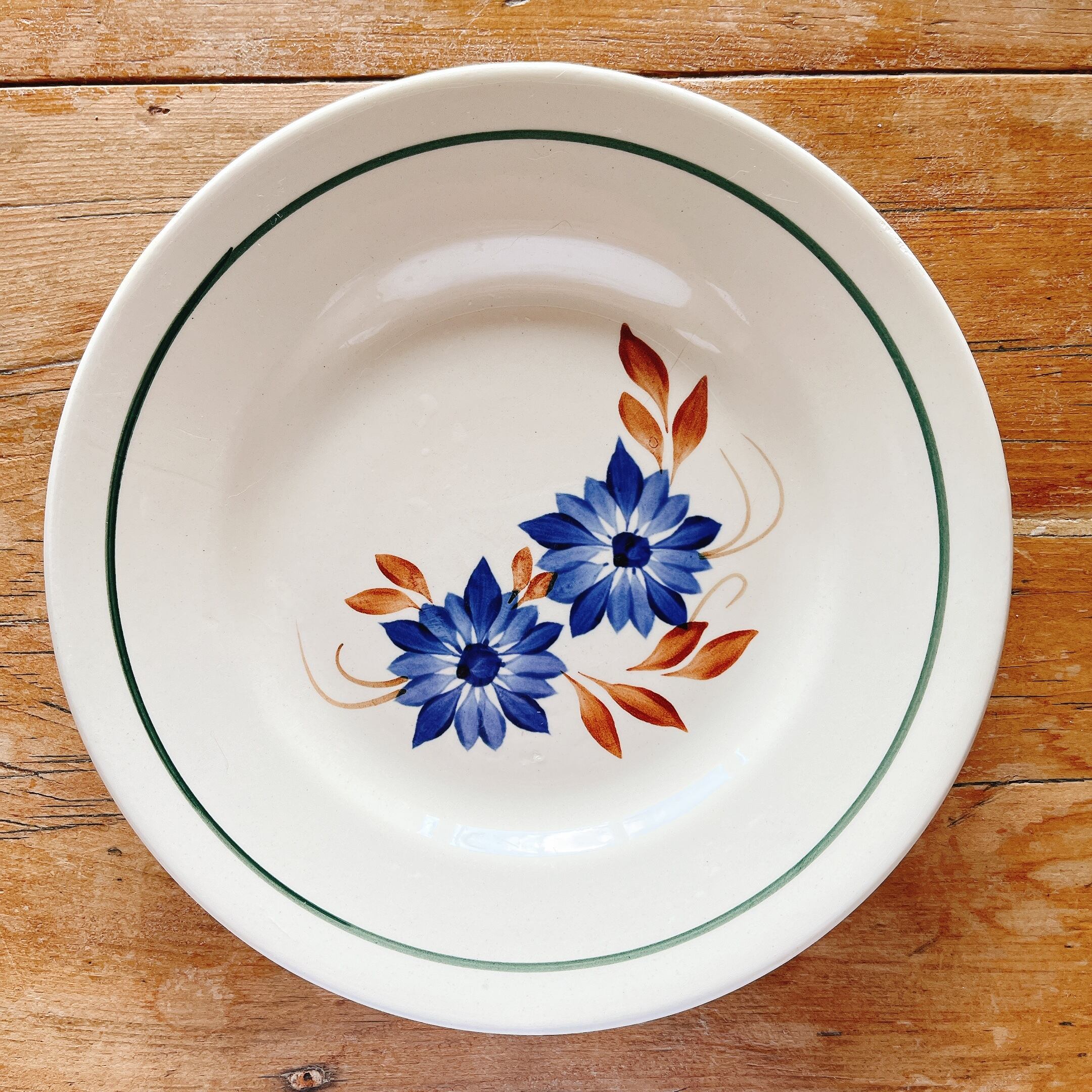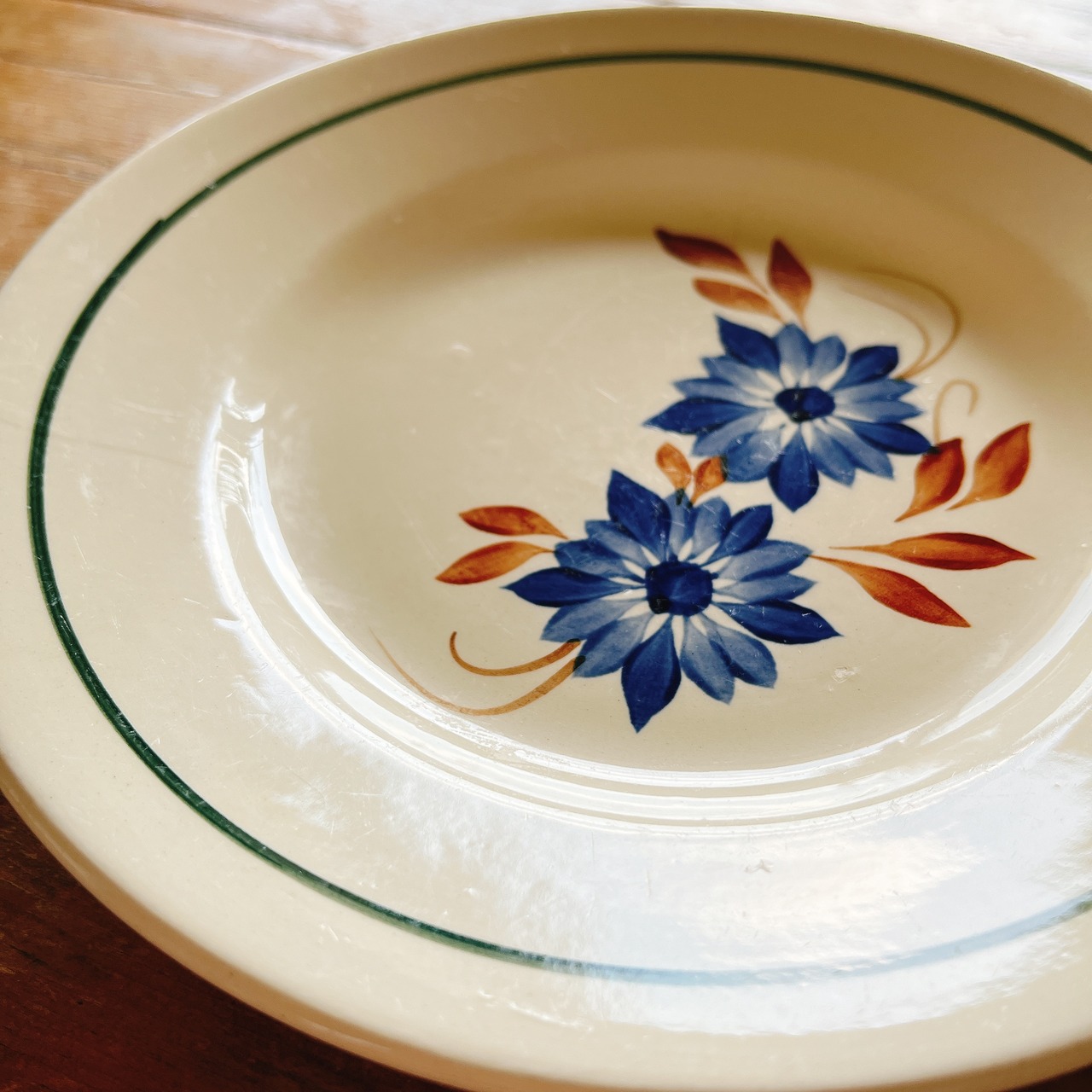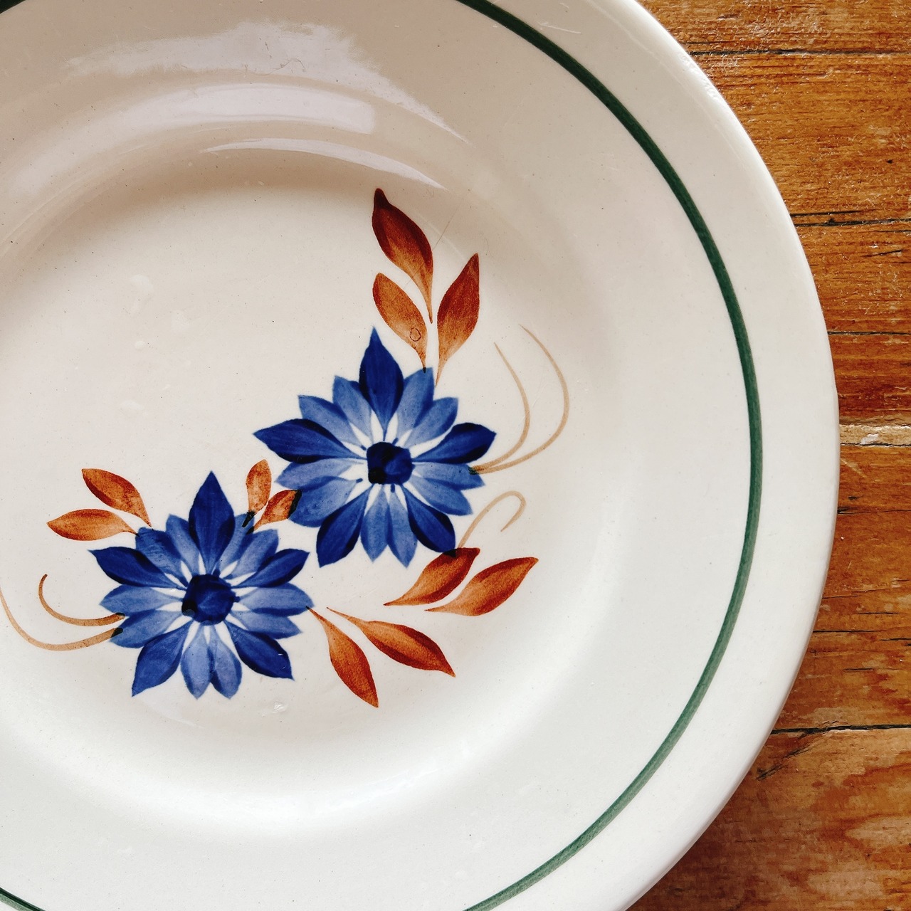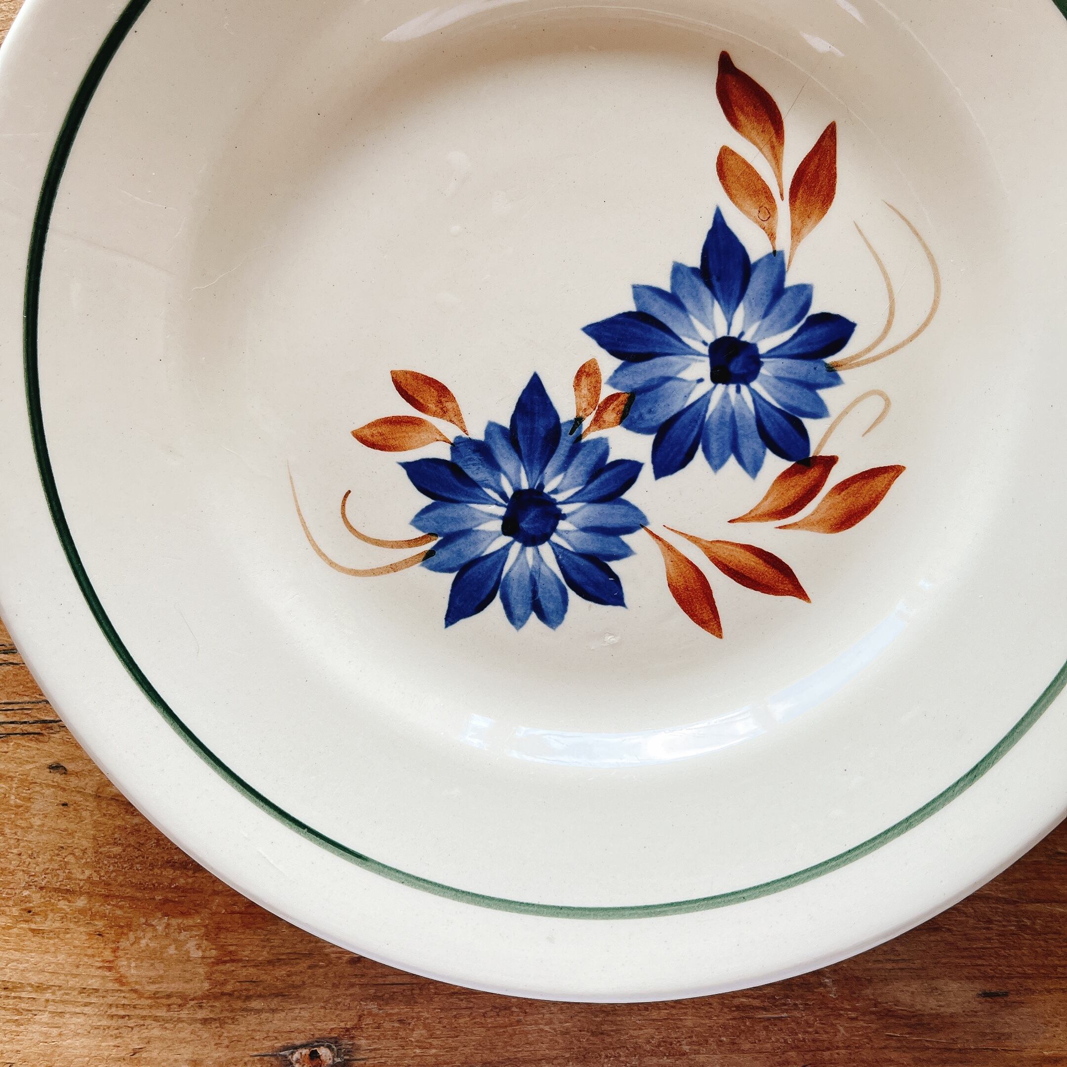 ブルーの手描きの花にブラウンの葉と、シンプルながら可愛いデザートプレートです。