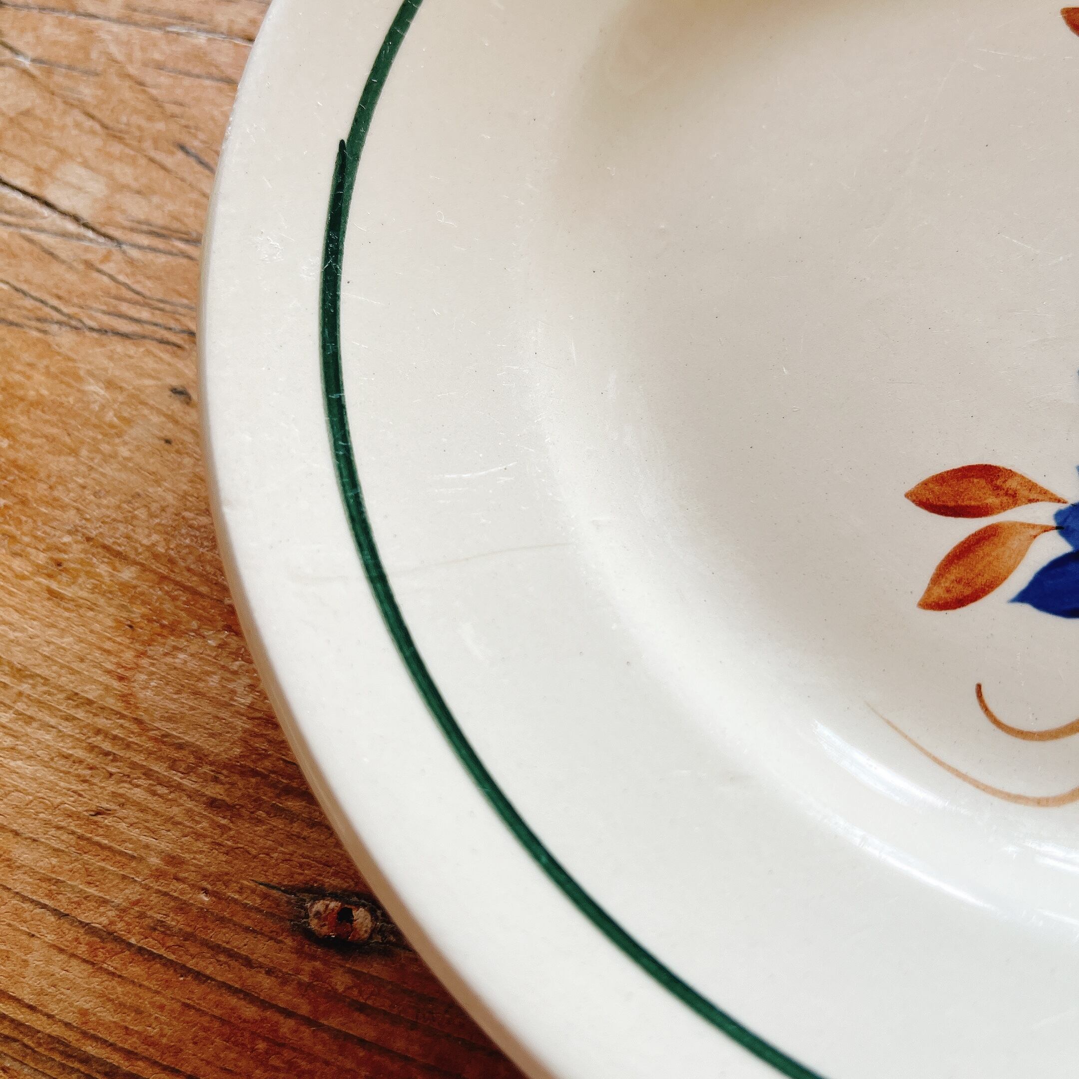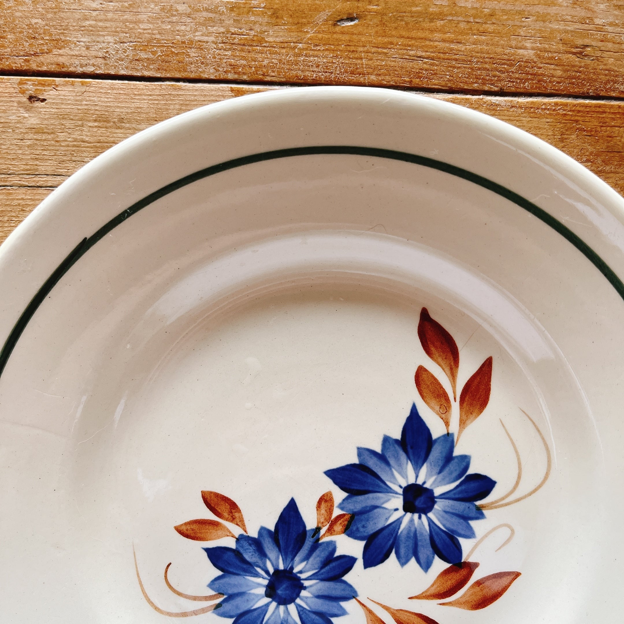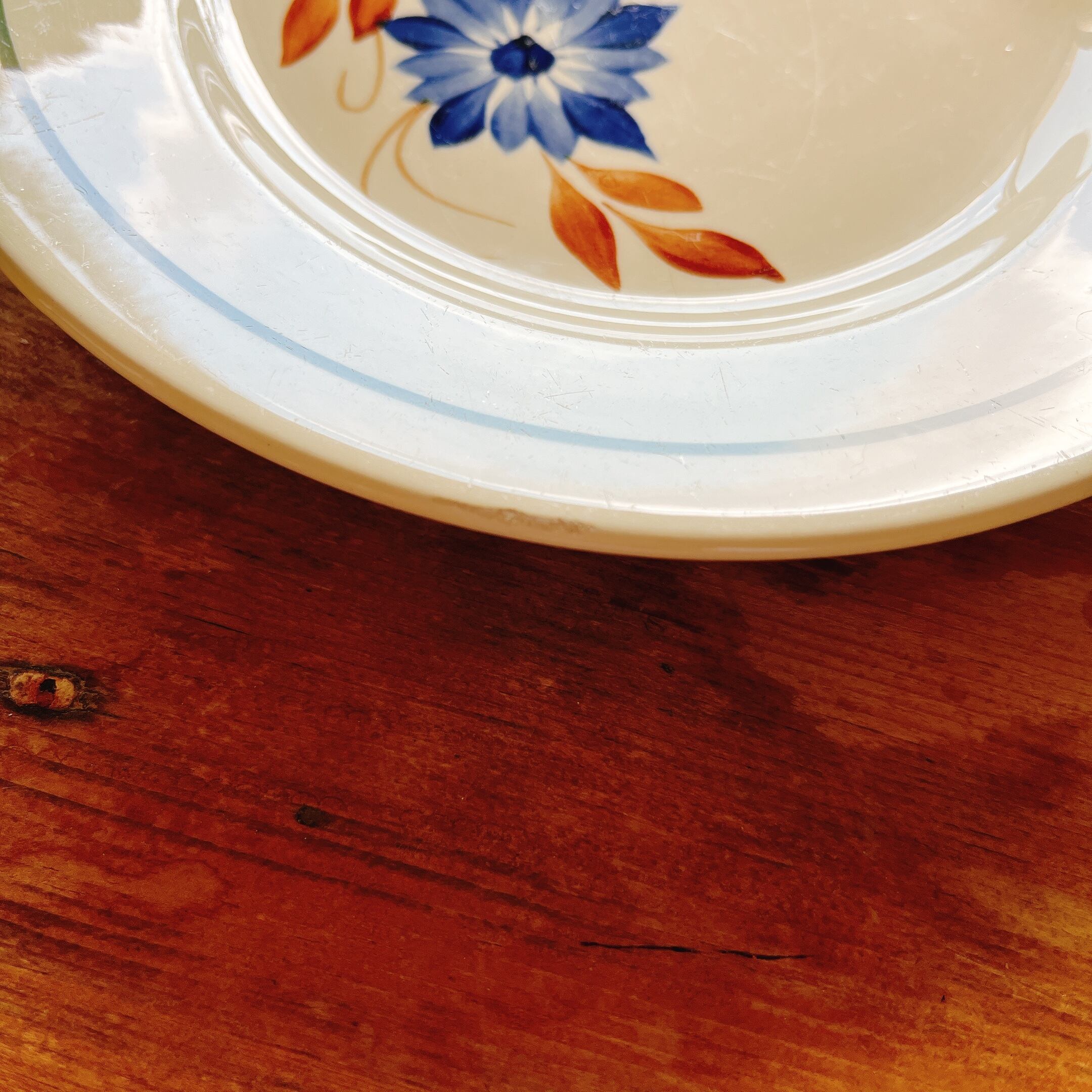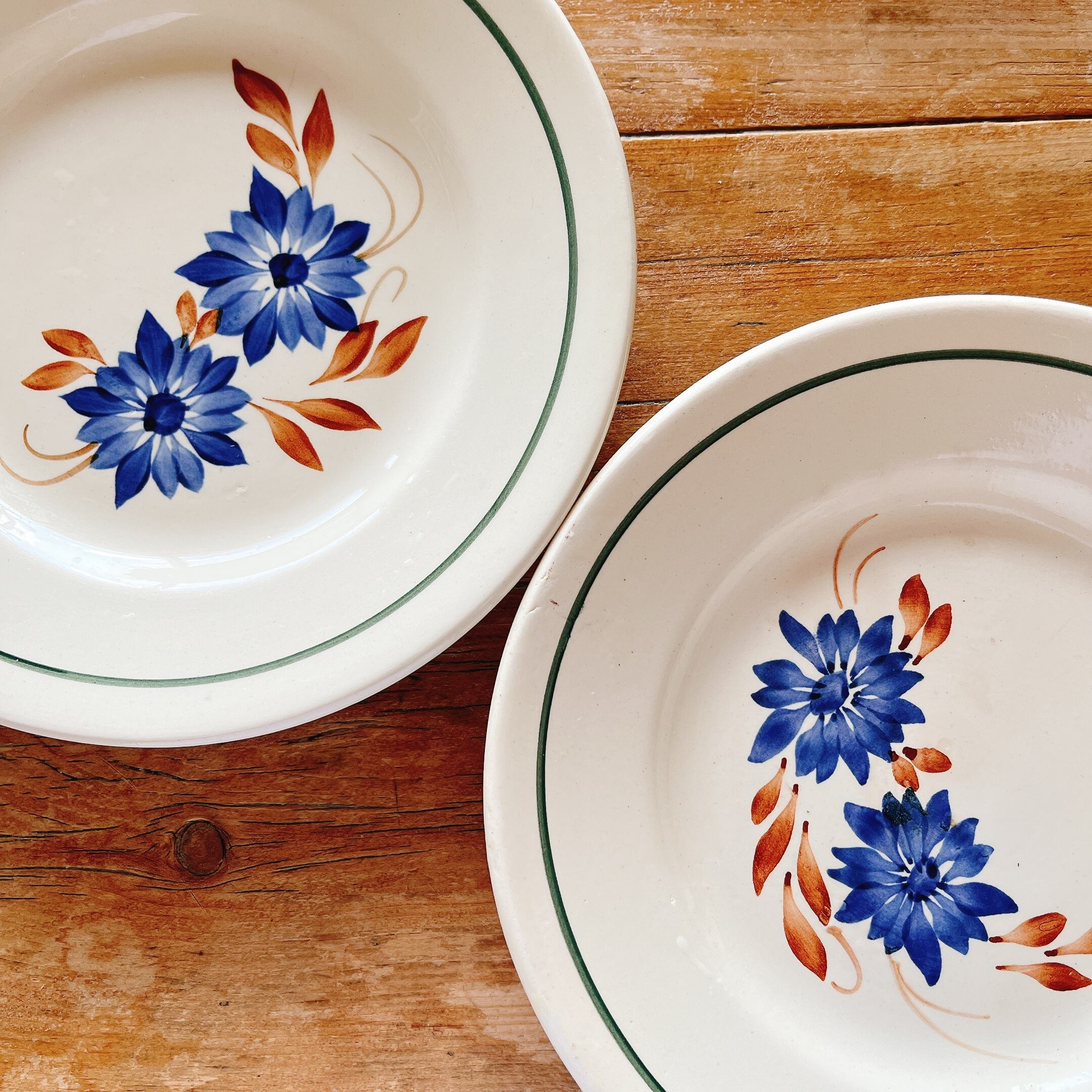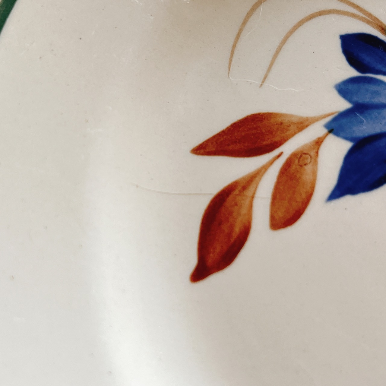 ブルーの手描きの花にブラウンの葉と、シンプルながら可愛いデザートプレートです。