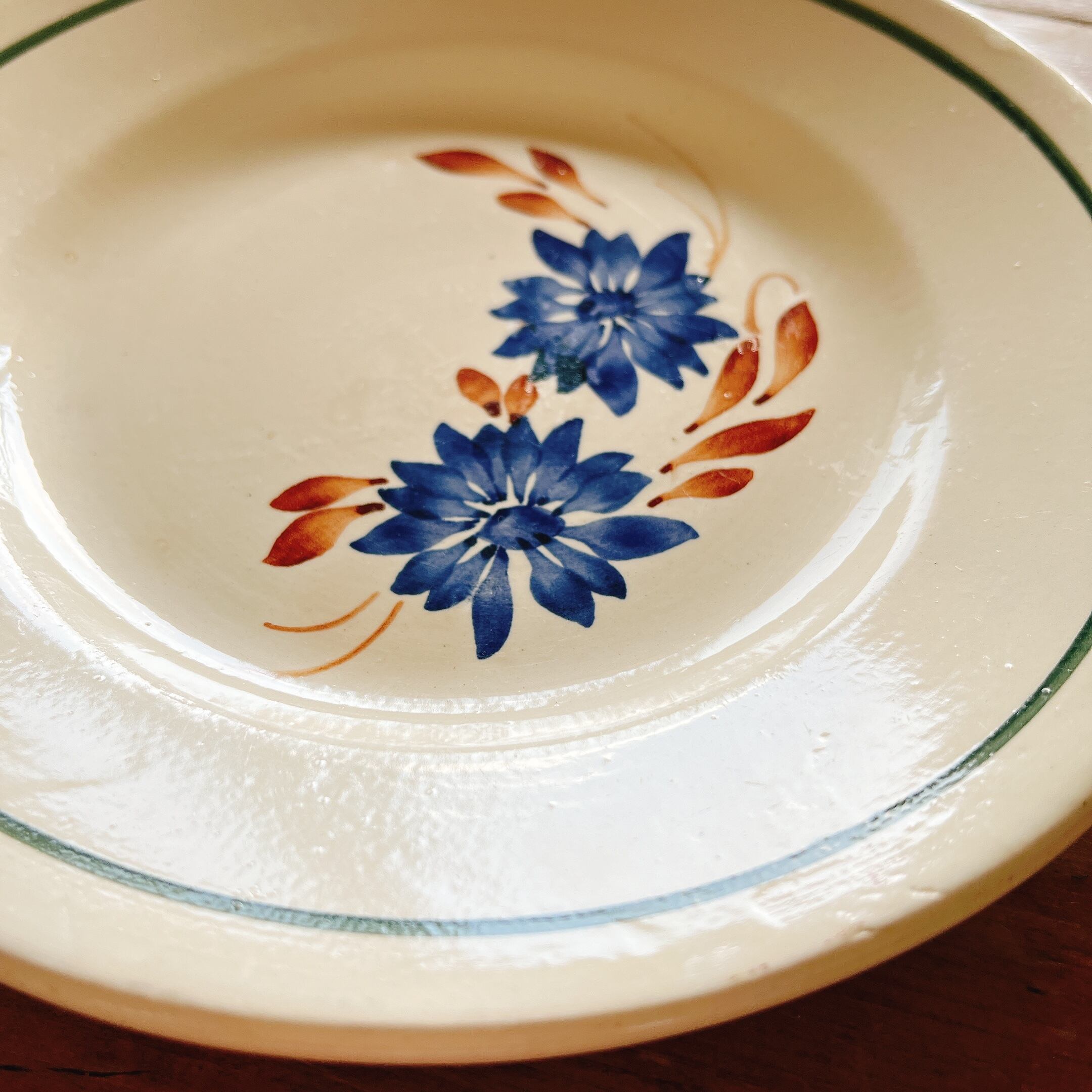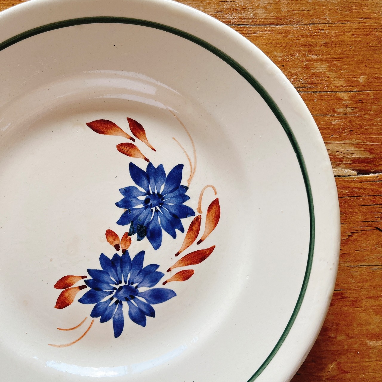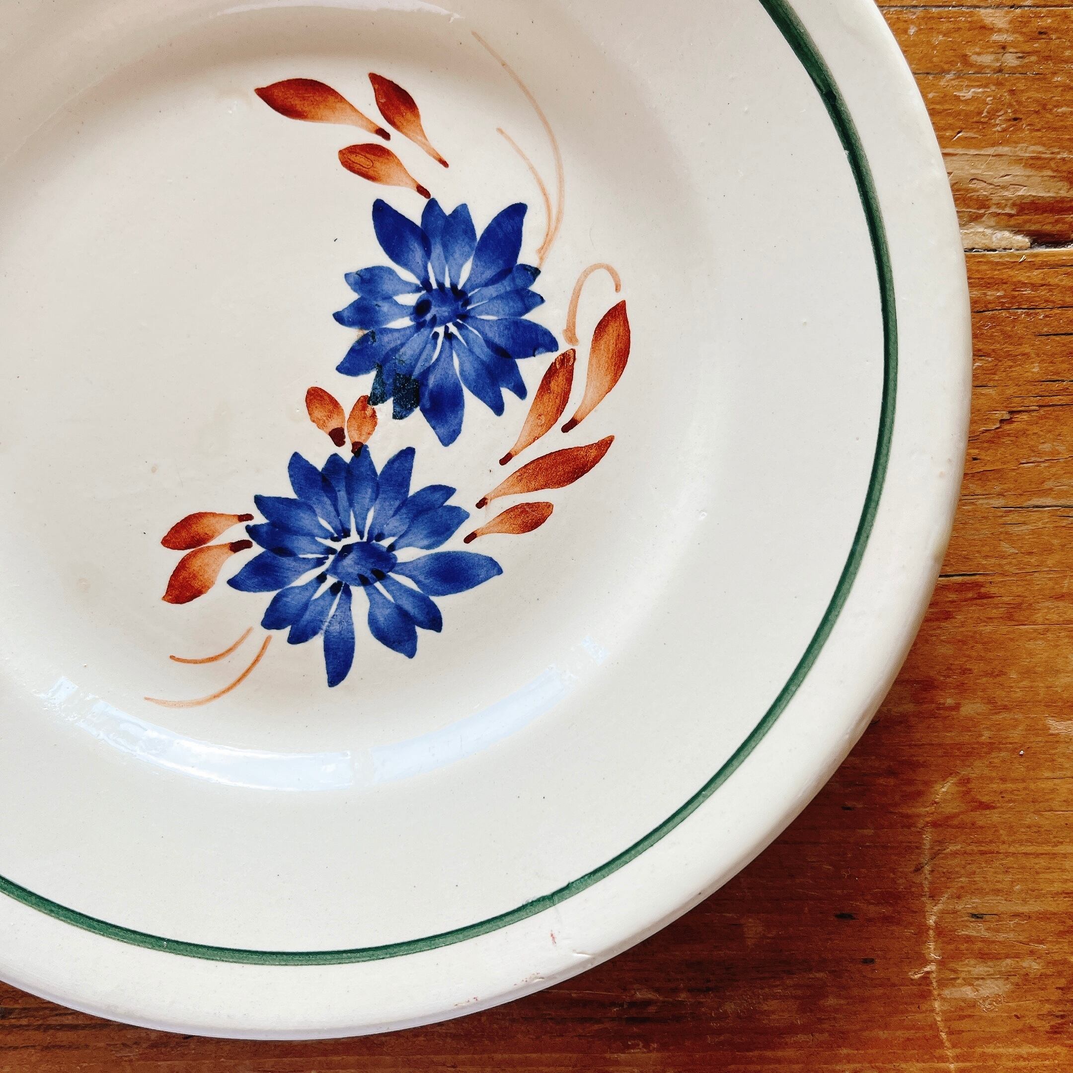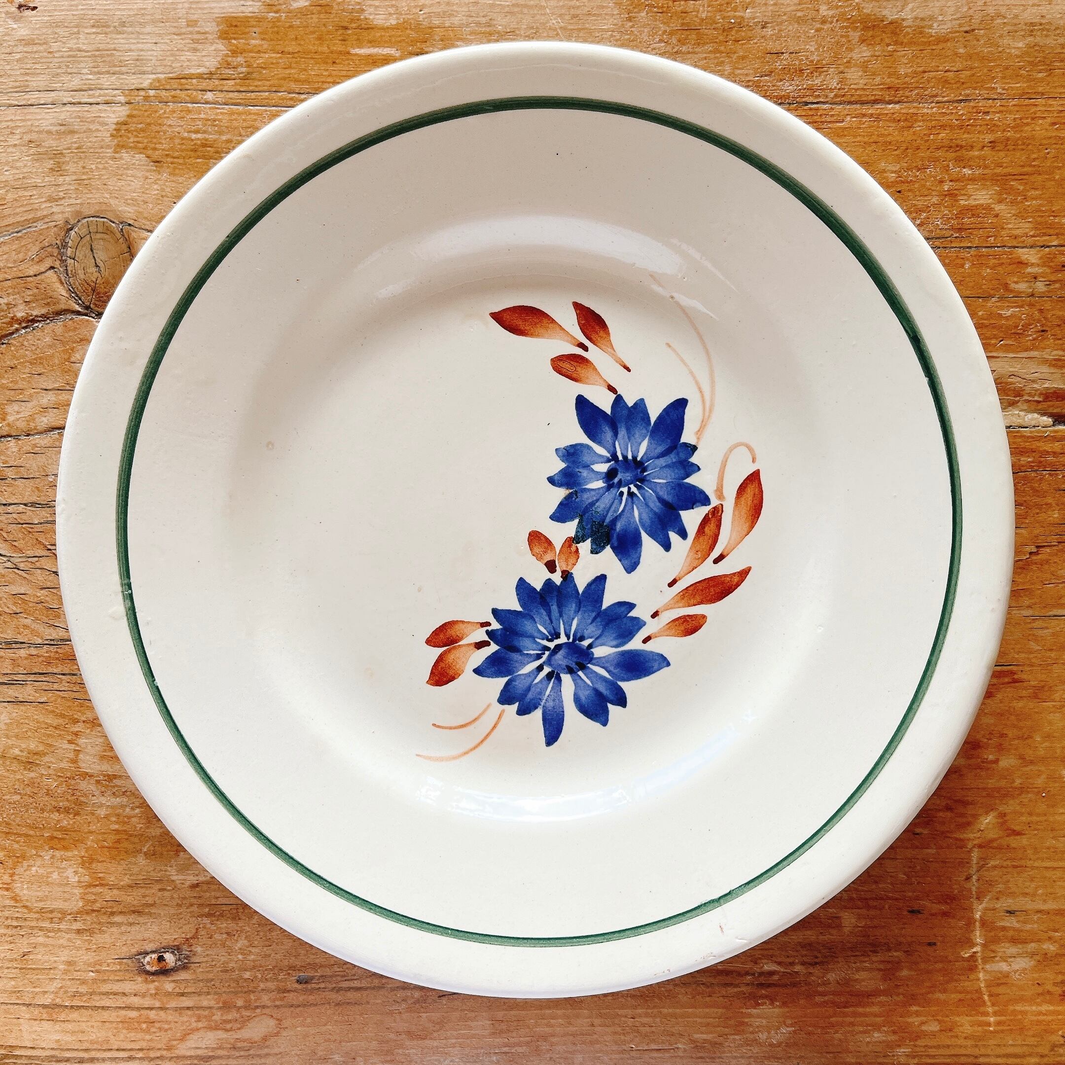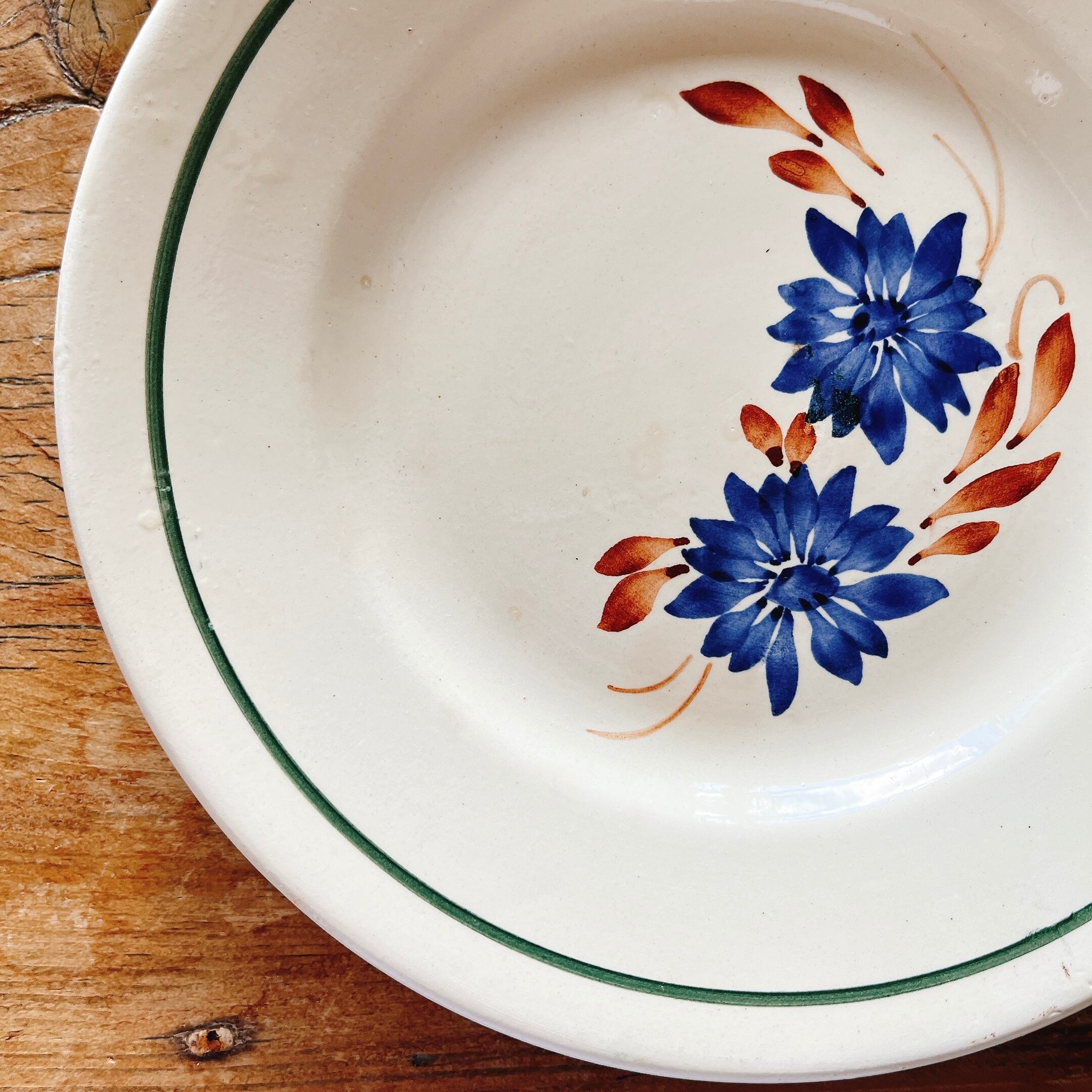 ブルーの手描きの花にブラウンの葉と、シンプルながら可愛いデザートプレートです。