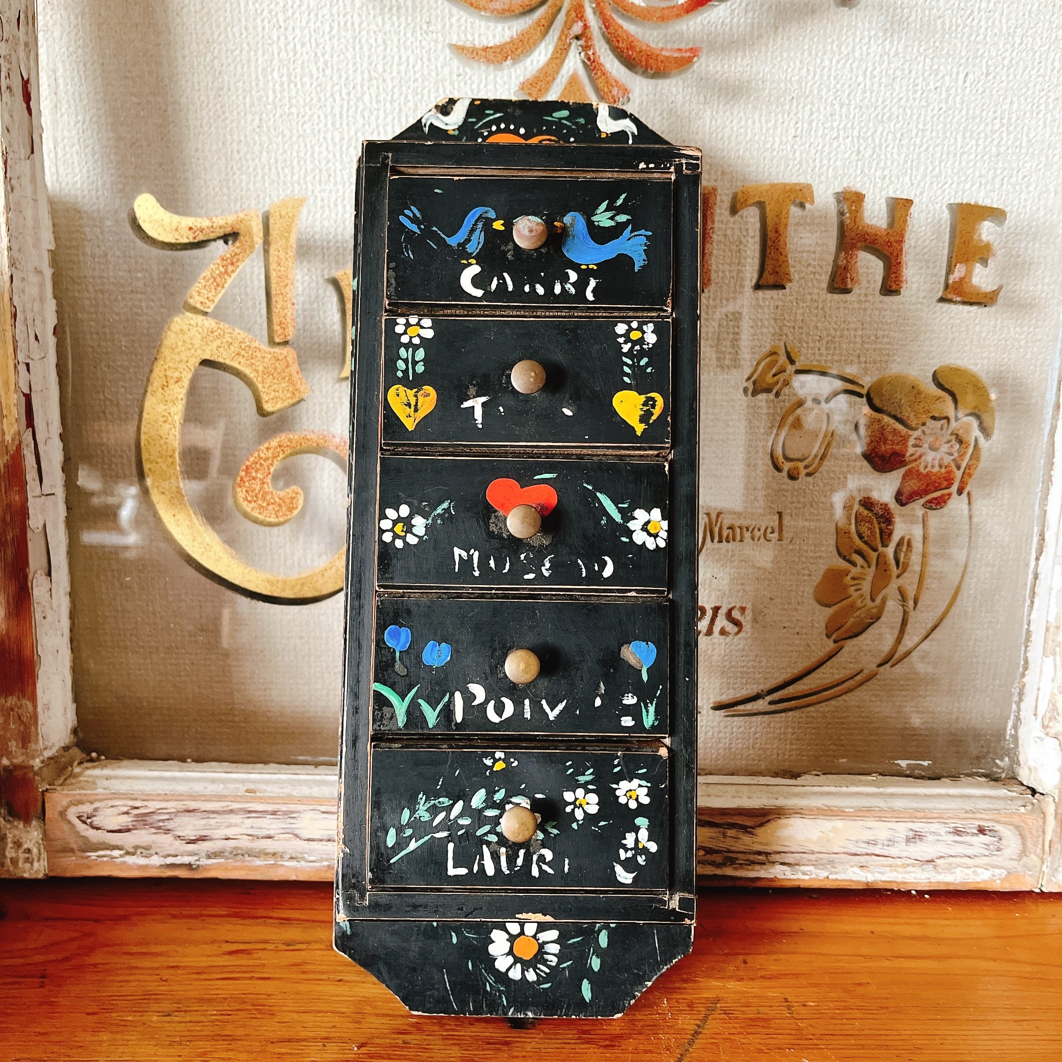 poivre(胡椒)などが書かれているので、キッチンの壁に掛けて、スパイス入れとして使われていた引き出しのようです。