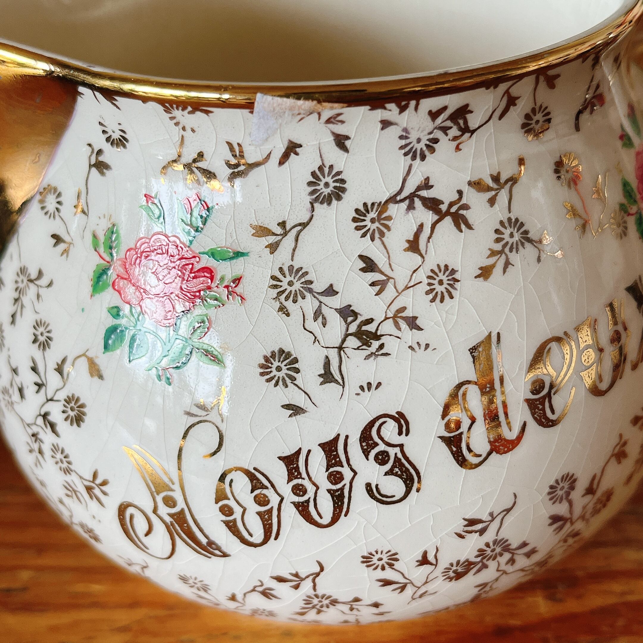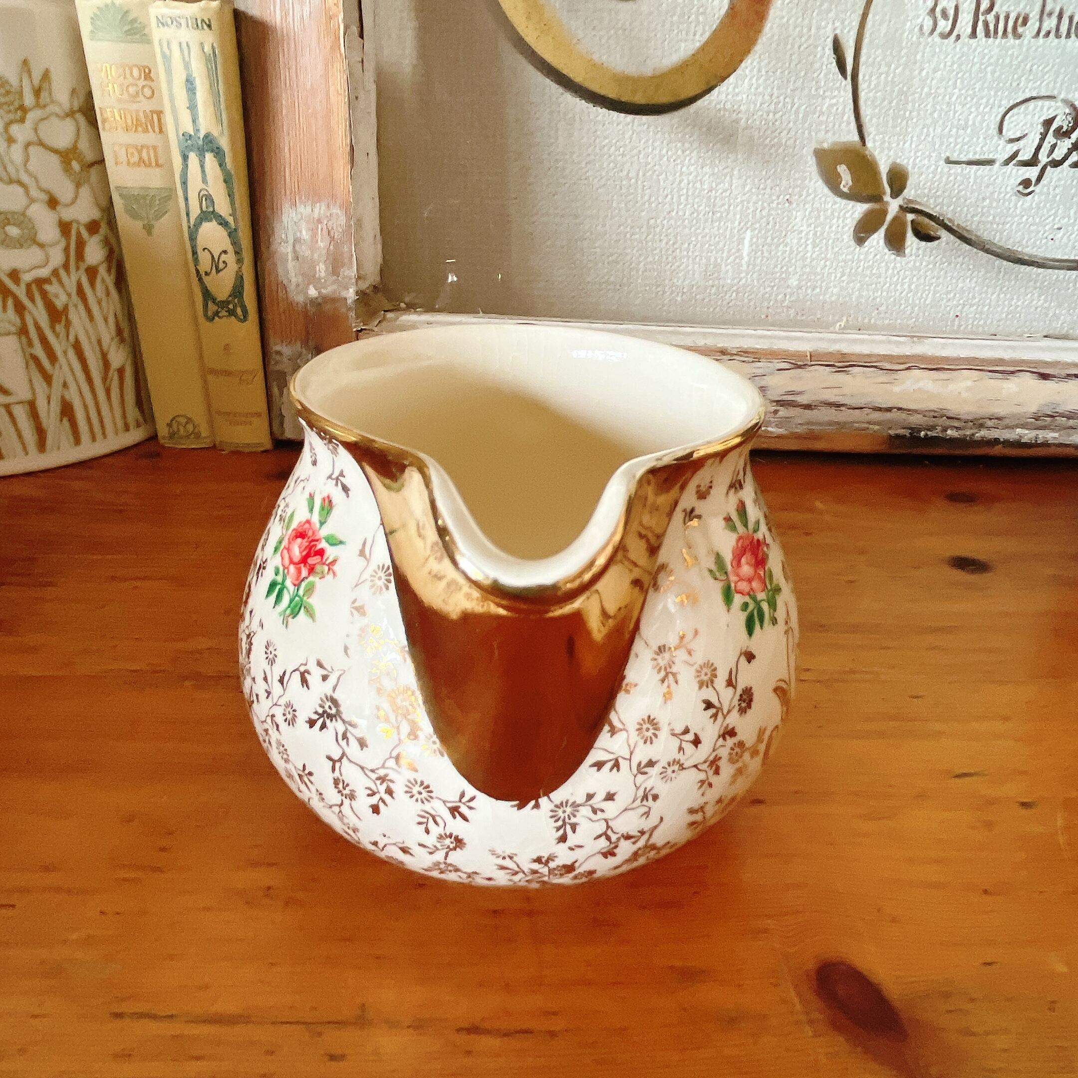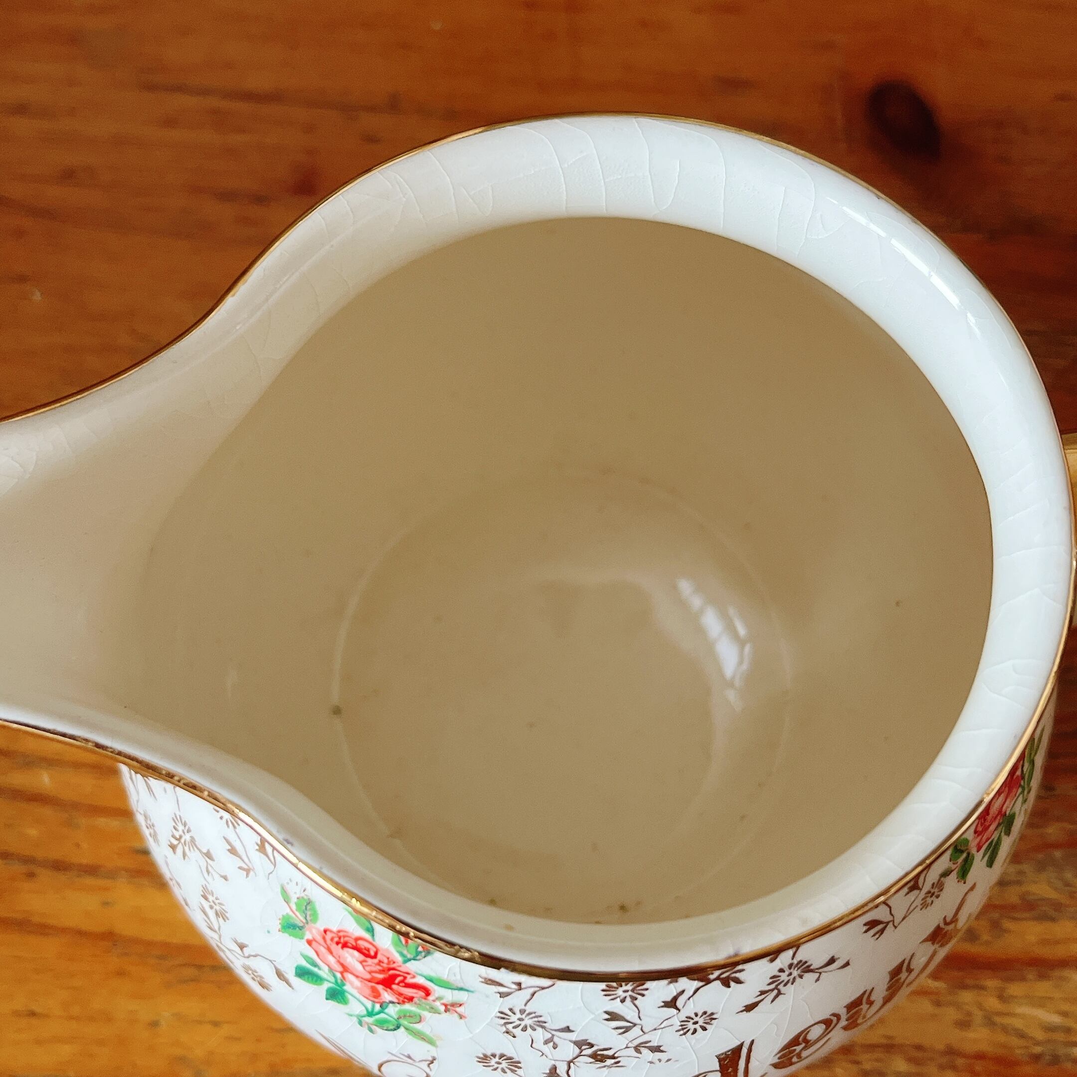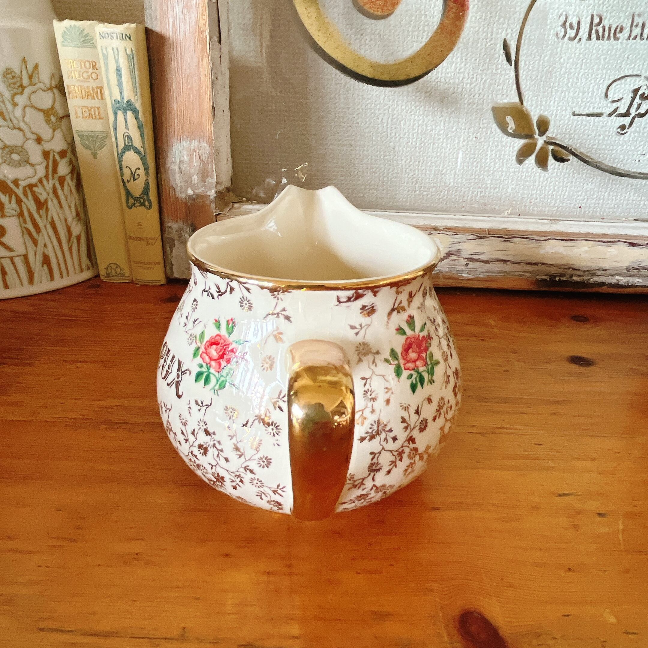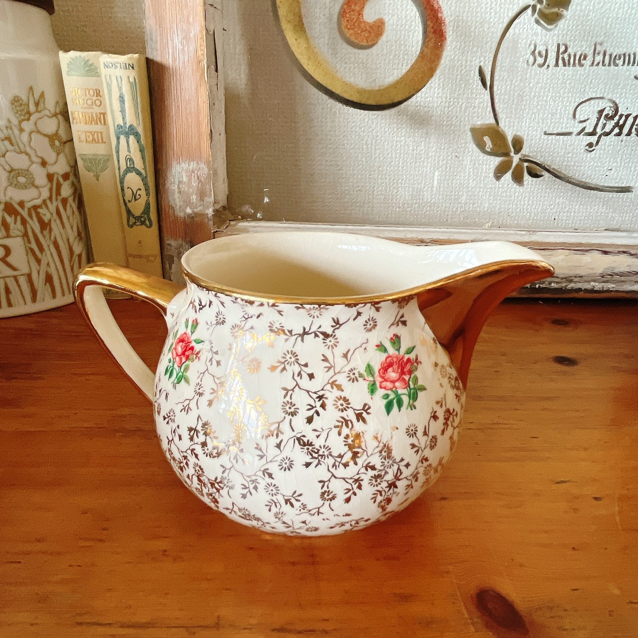 コロンとした可愛いシルエットの小さめピシェです。金彩の細かい花柄に、赤いバラがアクセントになった可愛いデザインです。